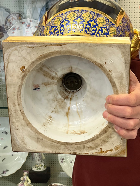 | Walzenförmig, sich nach unten verjüngend. Schauseiten je bunt bemalt mit dem namensgebendem Wappen auf Palmwedeln und bekrönt von purpur staffiertem Akanthus-Volutendekor, umgeben von Streublumen. Porzellan, am Boden unterglasurblaue Schwertermarke, mit Silber-Standring und -Streukopf.