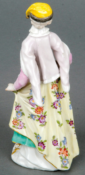 | Auf rechteckigem Sockel mit Grasstaffage stehend. Porzellan, bunt bemalt, verso am Sockel unterglasurblaue Schwertermarke, im Boden Malerbuchstabe „G“. Modell von Johann Joachim Kaendler. Provenienz: Christie's, New York 1998.