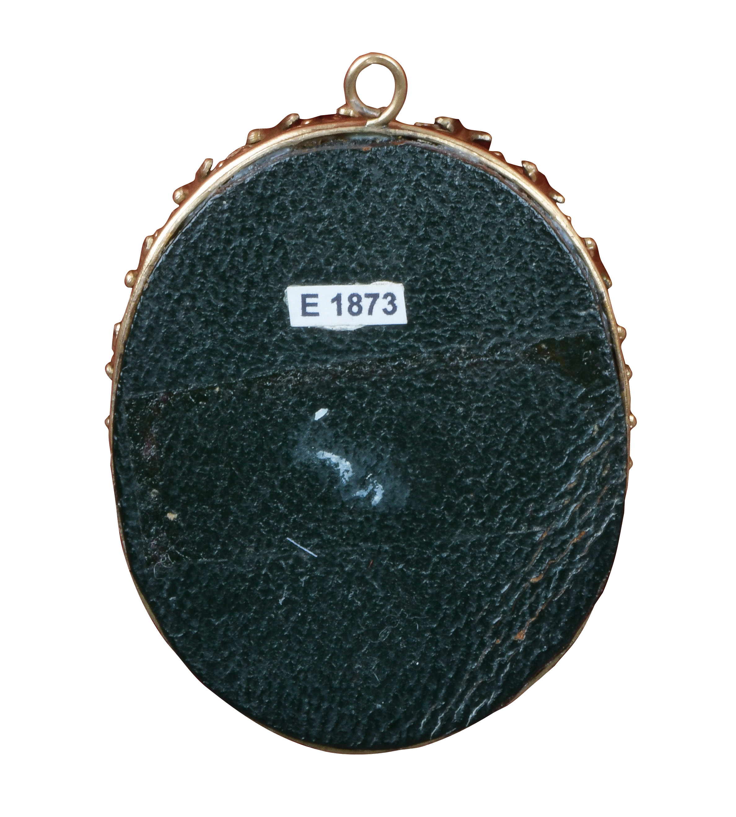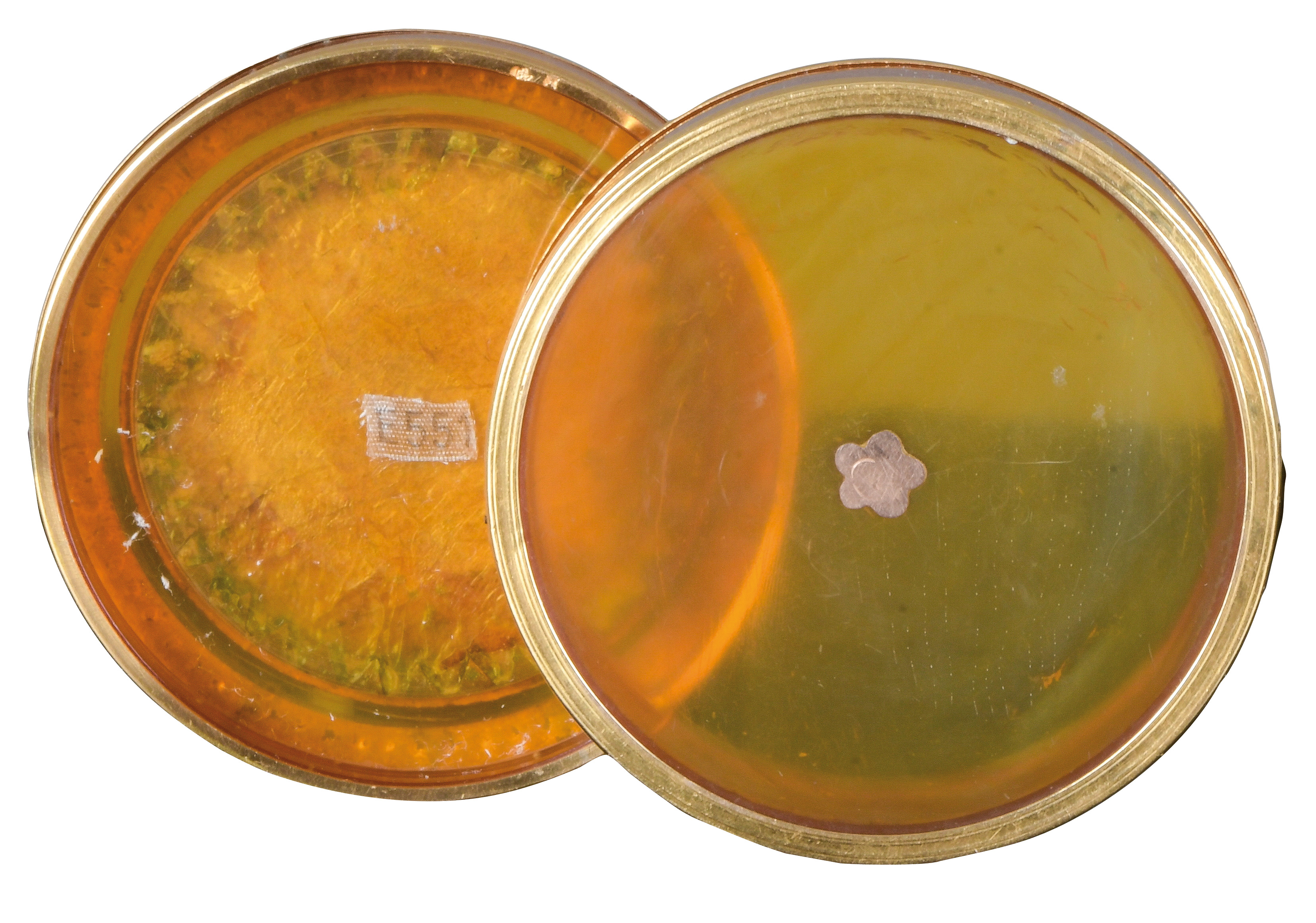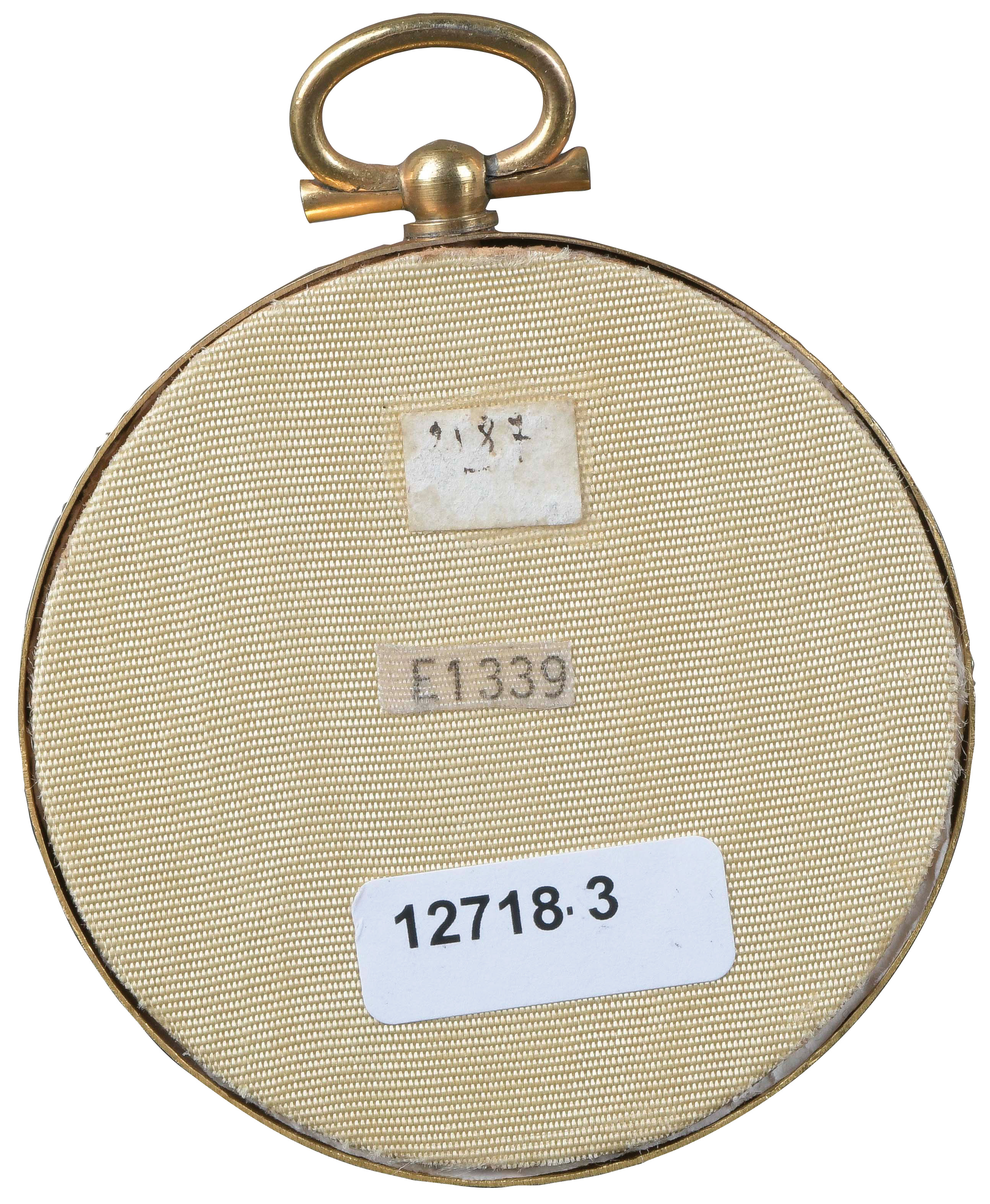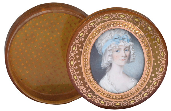 des 18. Jhs. Porträt einer Dame mit Haube. Bunt gemalt in Puderfarben und aquarelliert auf Elfenbeinplatte, mit ovalem, reliefiertem Goldkranz hi./Gl. eingelassen in runde, polierte Horndose mit Goldsterneinlagen. Provenienz: Sotheby's, London 24. März 1980. Elfenbein-Gutachten und EU-Verkaufsgenehmigung liegen vor und können für EUR 150,00 erworben werden. 4,2 x 3,5 cm / H=2,5 cm, D=6,3 cm € 800,-