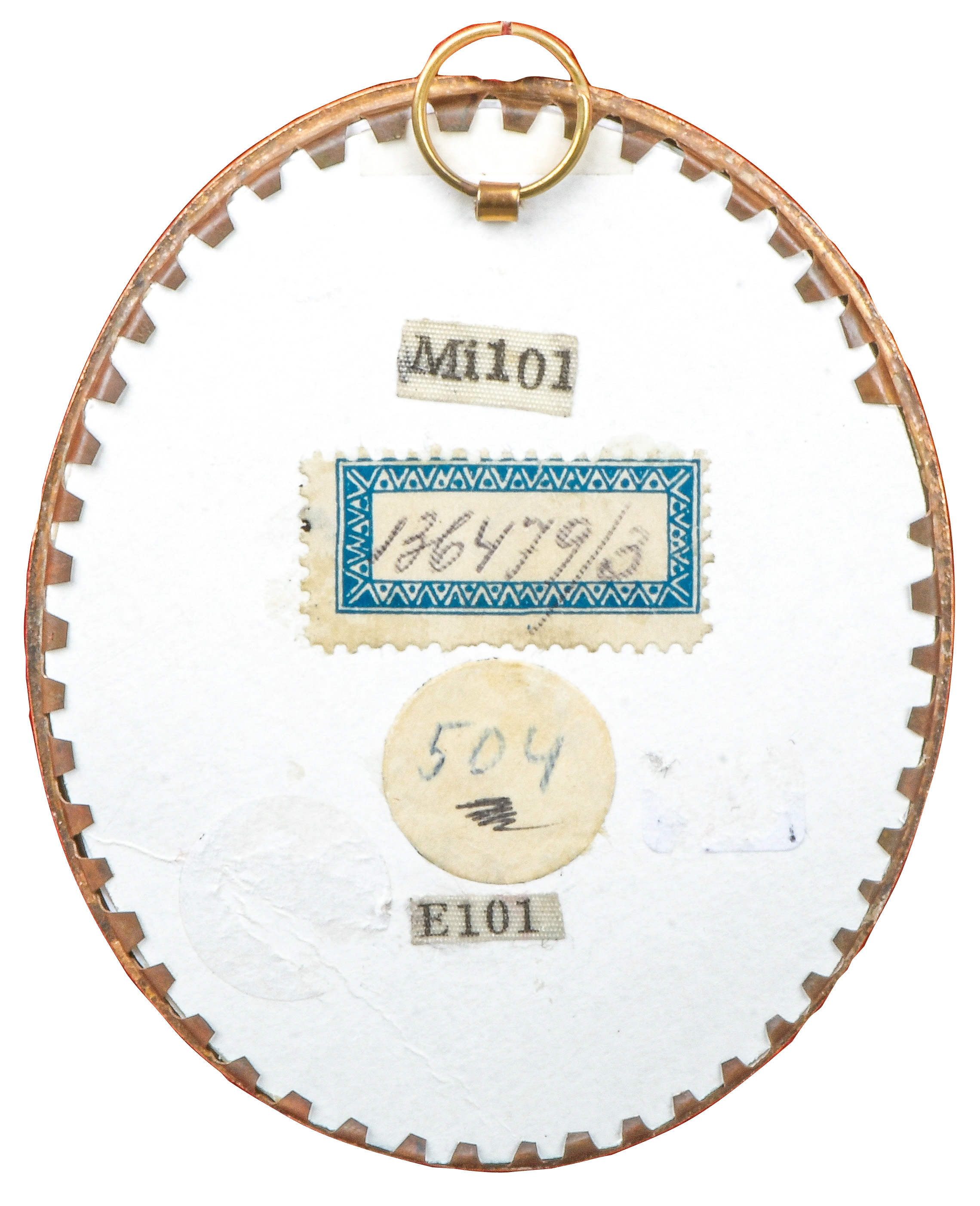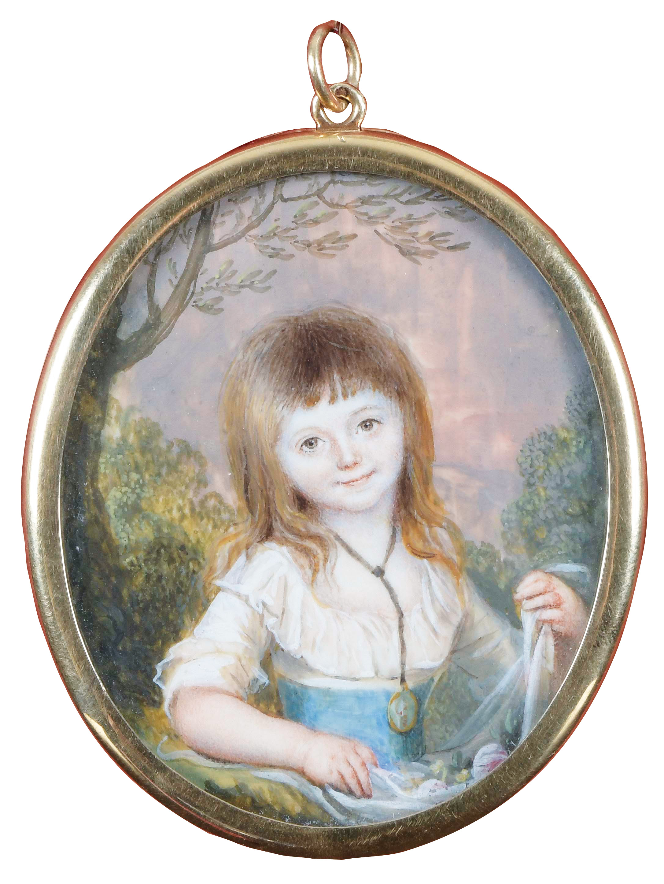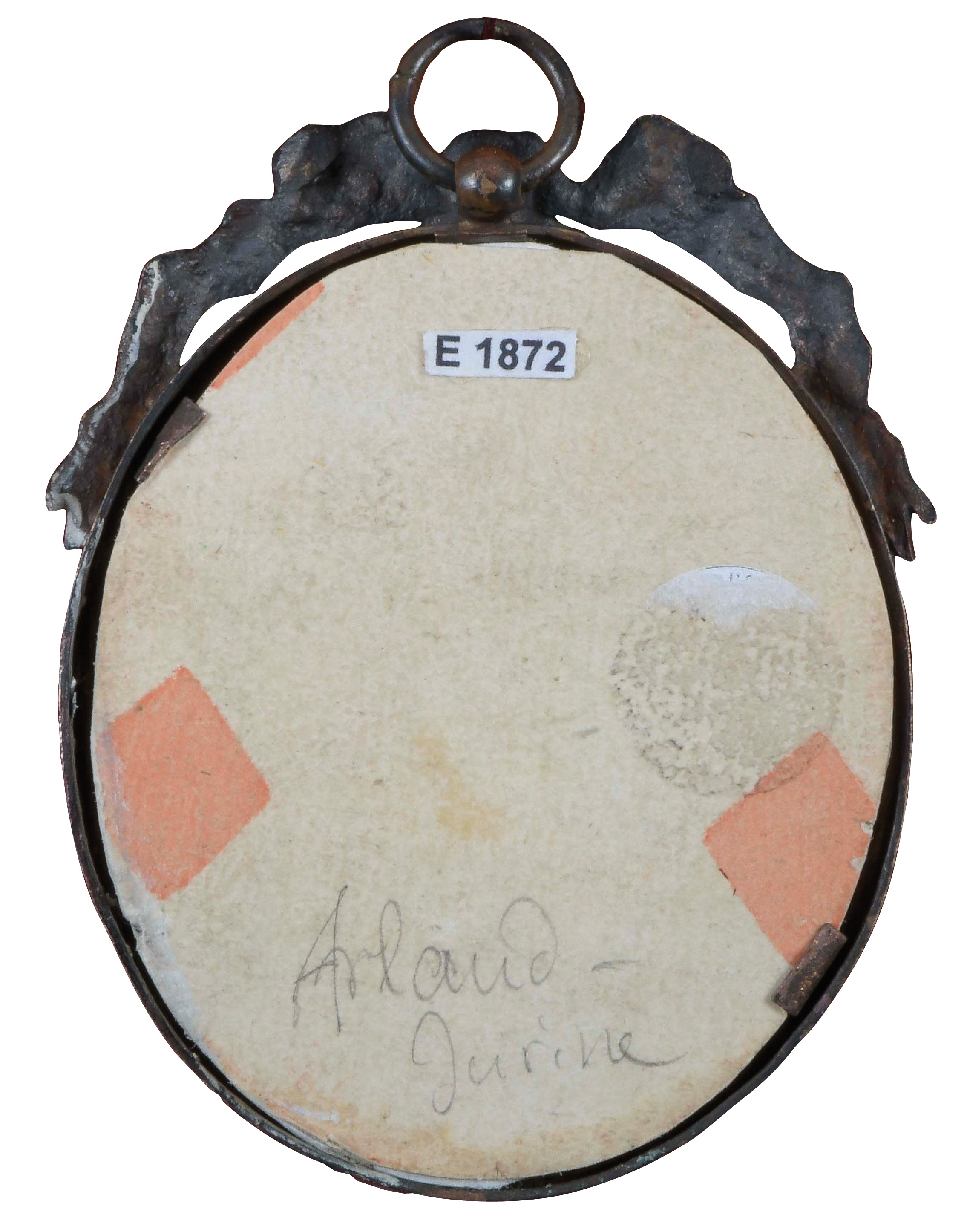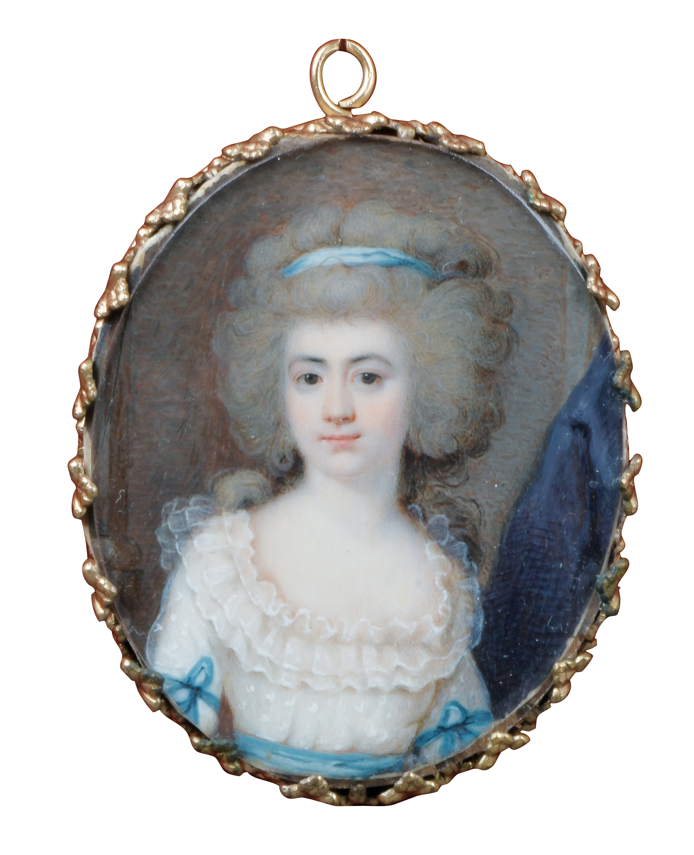 des 18. Jhs. Porträt eines Mädchens mit blauem Haarband. Bunt gemalt in Puderfarben und aquarelliert auf Elfenbeinplatte, mit Passepartout hi./Gl. in aufwendig kronenförmig durchbrochenem Messingrahmen. Provenienz: Christie's, London 27. Nov. 1979. Elfenbein-Gutachten und EU-Verkaufsgenehmigung liegen vor und können für EUR 150,00 erworben werden. 5,3 x 4,5 / 6 x 4,9 cm € 600,- - Katalog-Nr: 122Louis-Ami Arlaud-Jurine