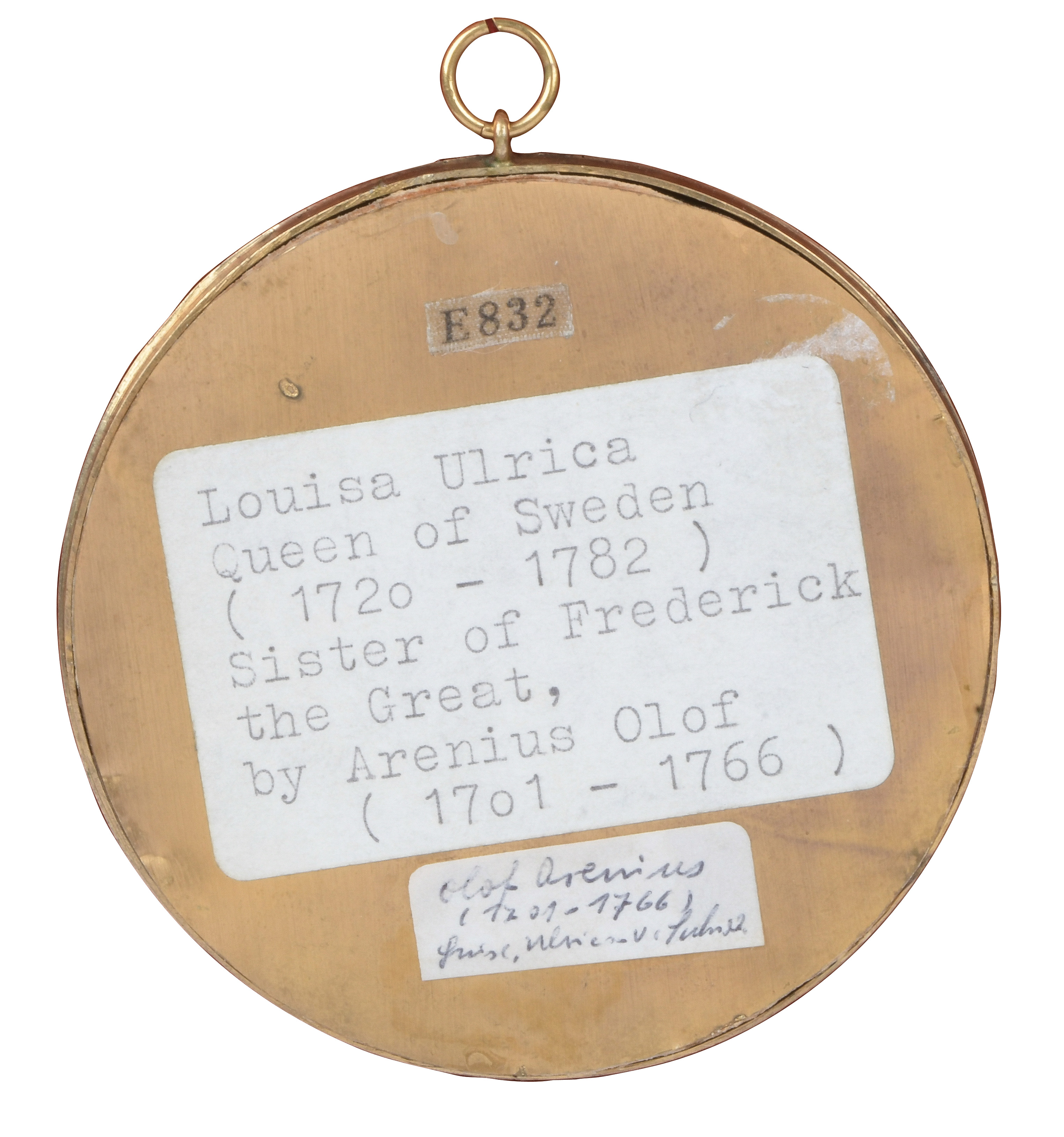 (1701-1766) Porträt der Königin Luise Ulrike von Schweden (1720-1766), Schwester von Friedrich dem Großen. Bunt gemalt in Puderfarben und aquarelliert auf Pergament, in schlichtem, goldfarbenem Rahmen. Provenienz: Christie's, London 27. April 1982. D=6,7 / 7,2 cm € 1.200,- - Katalog-Nr: 120H. Abel