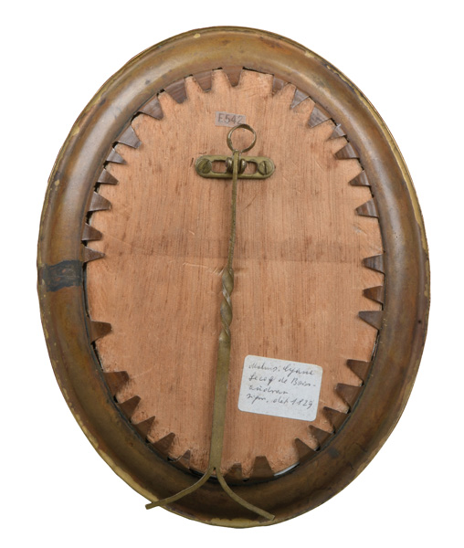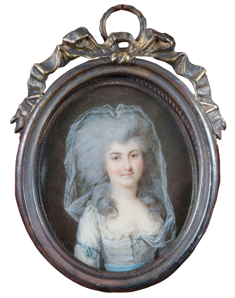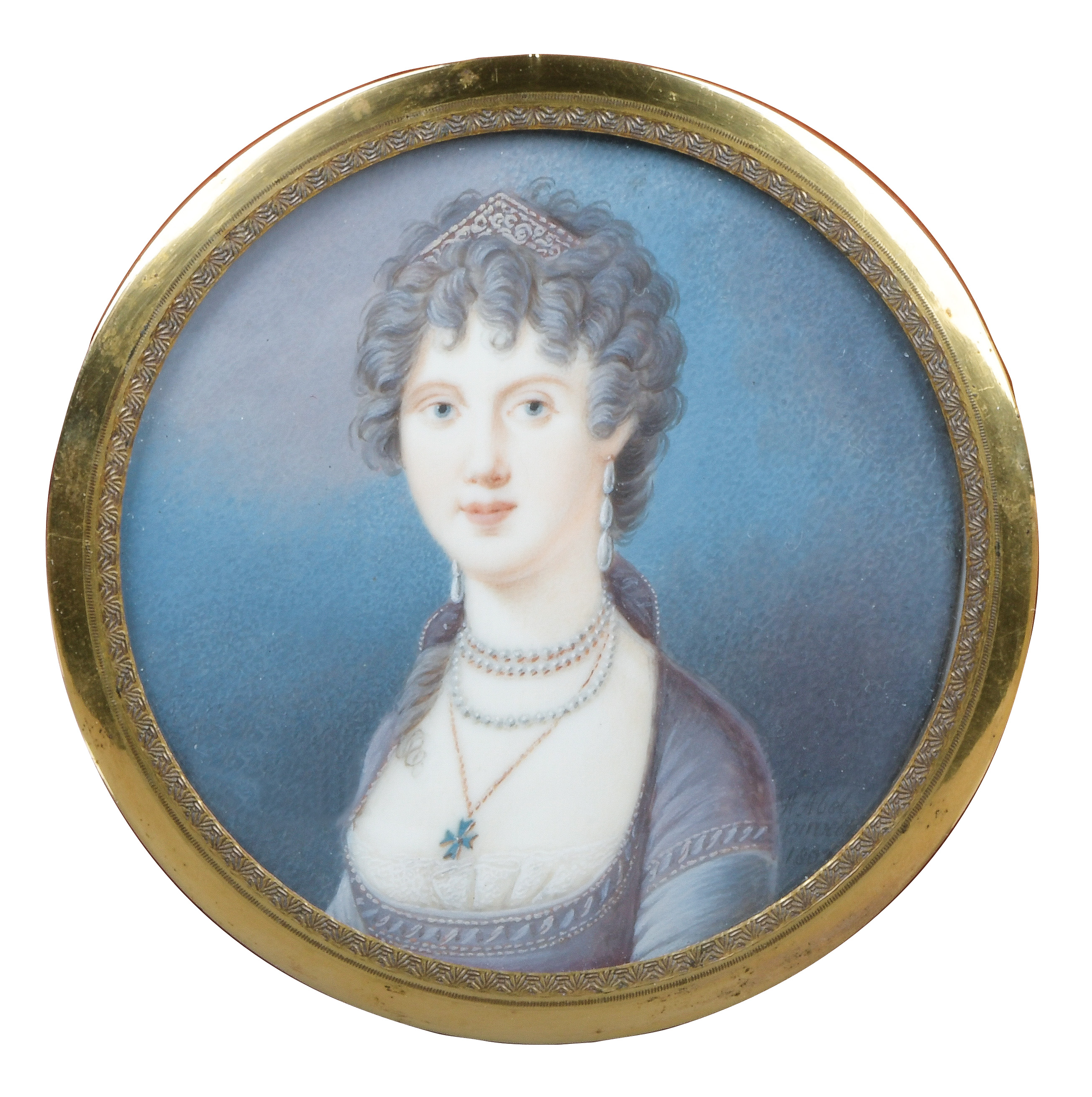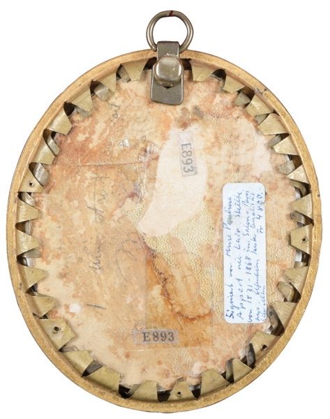 (deutscher Miniaturist des 18. Jhs.) Porträt der Herzogin von Mecklenburg-Schwerin (1779-1801). Bunt gemalt in Puderfarben und aquarelliert auf Elfenbeinplatte, sign./dat. 1802, hi./Gl. in aufwendigem, graviertem Messingrahmen. Provenienz: Christie' s, Genf 29. Nov. 1982. Elfenbein-Gutachten und EU-Verkaufsgenehmigung liegen vor und können für EUR 150,00 erworben werden. D=7 / 8,2 cm € 400,- - Katalog-Nr: 121Miniaturist