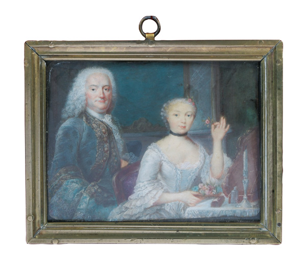 (1687-1767) Porträt eines galanten Paares vor Poudreuse. Bunt gemalt in Puderfarben und aquarelliert auf Pergament, re./a.d./Tischkante sign., hi./Gl. in profiliertem Bronzerahmen. Provenienz: Sotheby's, Zürich 13. Nov. 1979. 5,7 x 7,6 / 7,2 x 8,9 cm € 1.400,- - Katalog-Nr: 102William Grimaldi