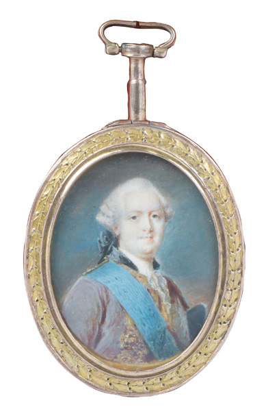 des 18. Jhs. Porträt eines Herren. Bunt gemalt in Puderfarben und aquarelliert auf Elfenbeinplatte, hi./Gl. in aufwendig floral reliefiertem, vergoldetem Bronzerahmen. Provenienz: Sotheby's, Genf 6. Mai 1981. Elfenbein-Gutachten und EU-Verkaufsgenehmigung liegen vor und können für EUR 150,00 erworben werden. 4,8 x 3,7 / 5,9 x 4,8 cm € 1.000,- - Katalog-Nr: 124Alexandre Delatour