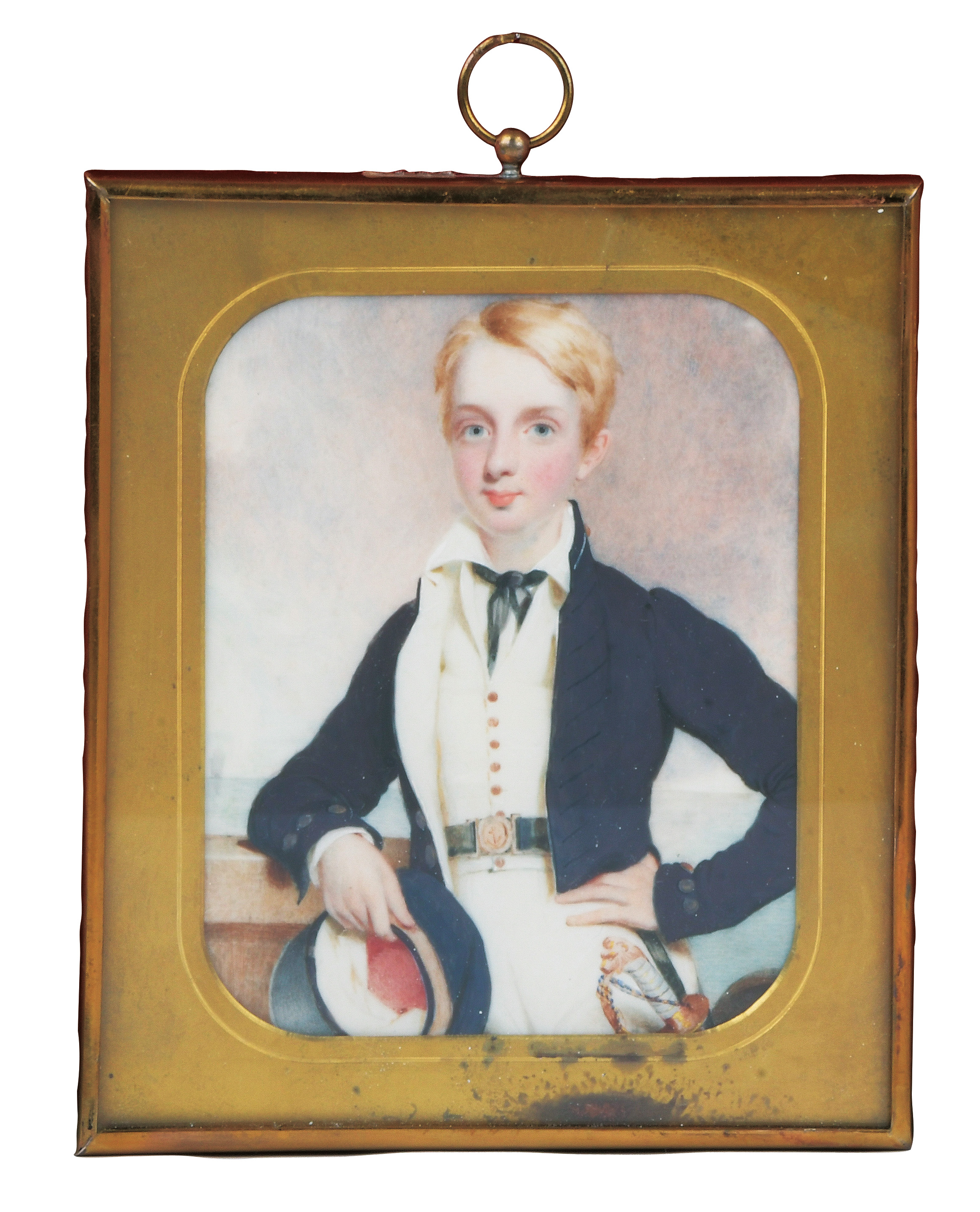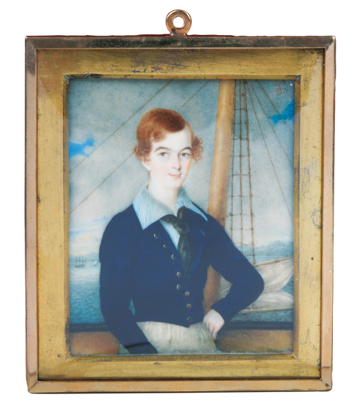 des 19. Jhs. Porträt eines Marinekadetten. Bunt gemalt in Puderfarben und aquarelliert auf Elfenbeinplatte, mit Passepartout hi./Gl. in schlichtem, goldfarbenem Rahmen. Provenienz: Christie's, London 28. Okt. 1980. Elfenbein-Gutachten und EU-Verkaufsgenehmigung liegen vor und können für EUR 150,00 erworben werden. 9,7 x 7,9 / 12,7 x 10,9 cm € 400,- - Katalog-Nr: 127Englischer Miniaturist