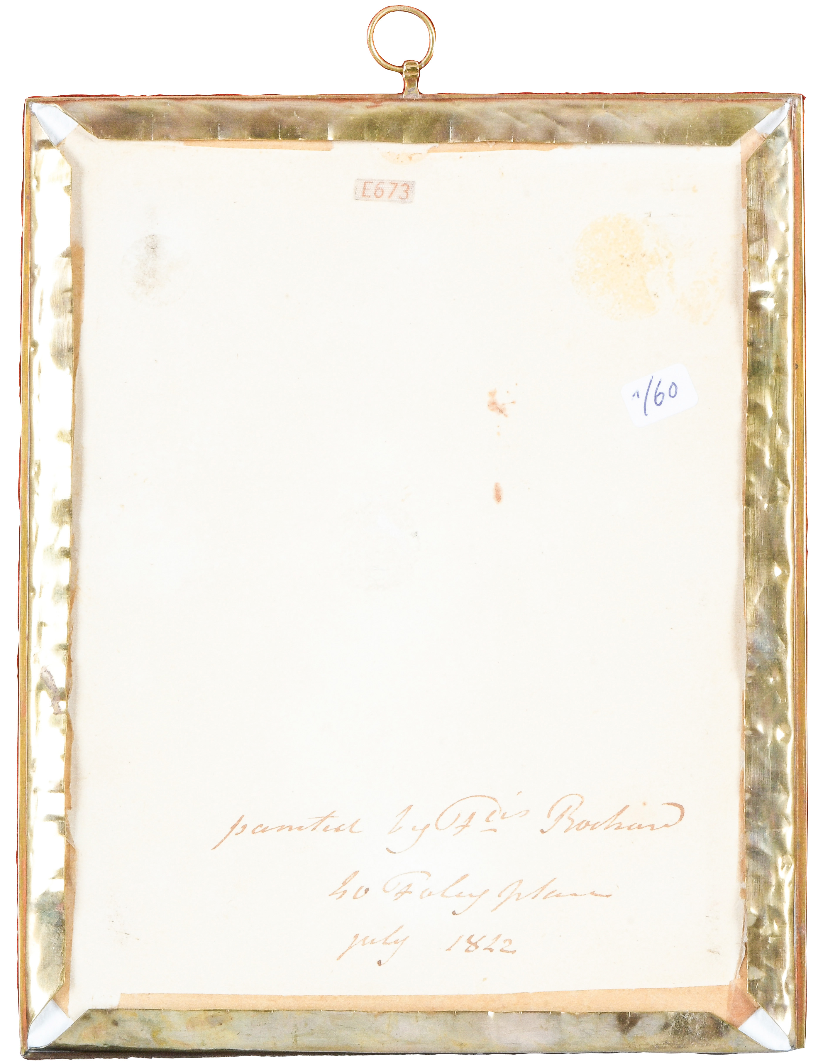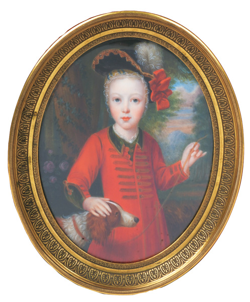 des 19. Jhs. Porträt eines Knaben mit Hund. Bunt gemalt in Puderfarben und aquarelliert auf Elfenbeinplatte, hi./Gl. in aufwendig graviertem und ziseliertem Rahmen. Provenienz: Christie's, London 28. Nov. 2012. Elfenbein-Gutachten und EU-Verkaufsgenehmigung liegen vor und können für EUR 150,00 erworben werden. 12 x 8,9 / 14,7 x 11,8 cm € 1.400,- - Katalog-Nr: 131François Theodore Rochard