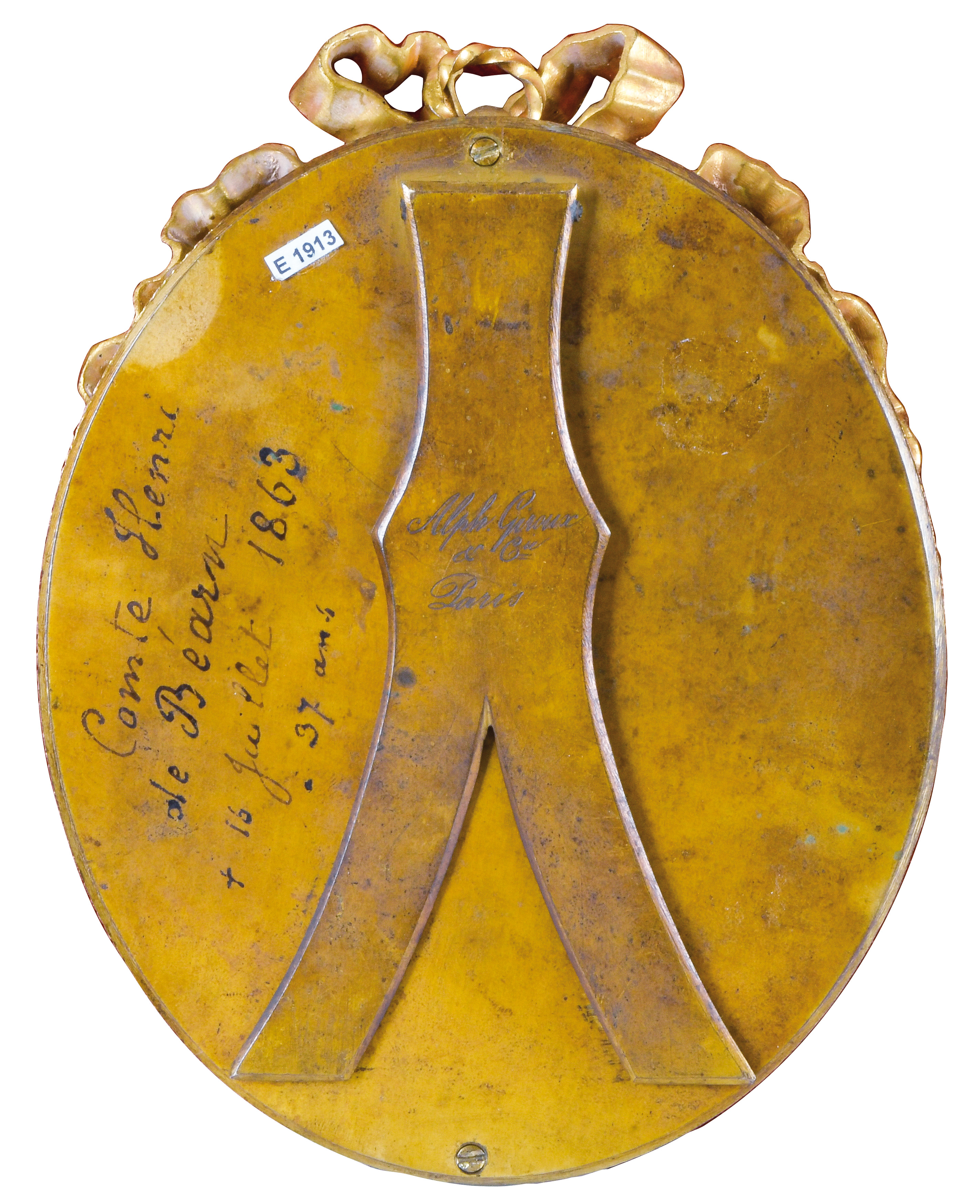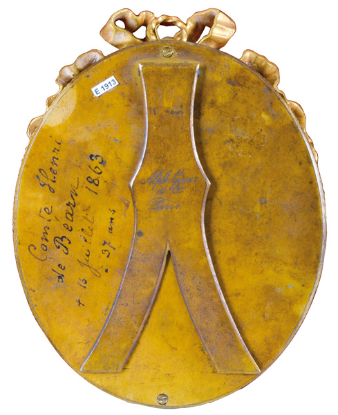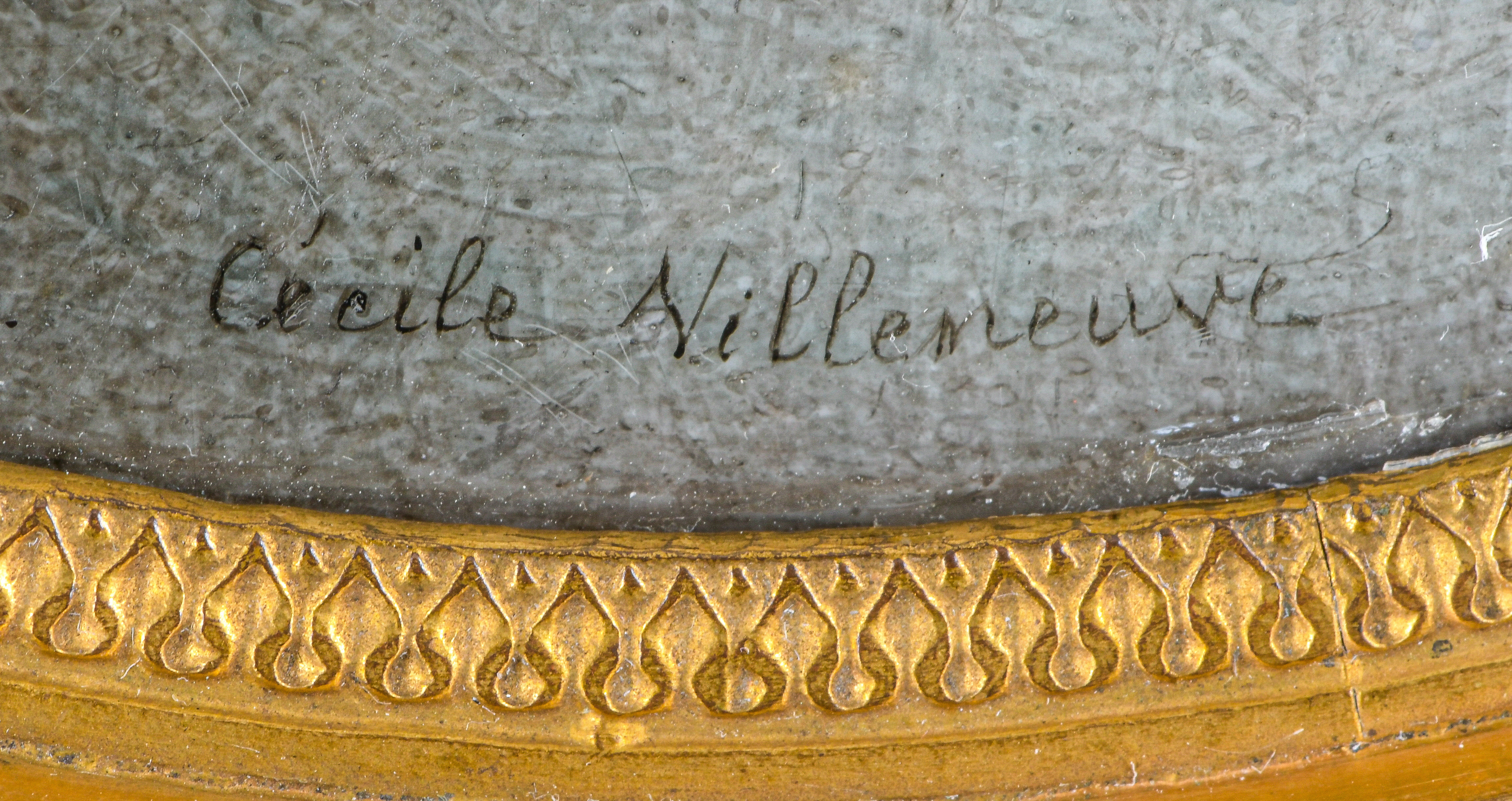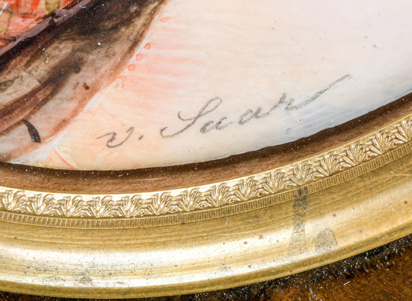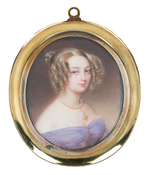 (1824-1901) Porträt der „Vicomtesse Geoffroy de Ruillé“. Bunt gemalt in Puderfarben und aquarelliert auf Elfenbein, re./u./sign., verso bez./dat. 1872, hi./Gl. in aufwendig reliefiertem, feuervergoldetem Bronzerahmen von Alphonse Giroux & Cie, Paris. Provenienz: Christie's, London 25. Mai 2004, GBP 32.000,00. Elfenbein-Gutachten und EU-Verkaufsgenehmigung liegen vor und können für EUR 150,00 erworben werden. 10,3 x 8,6 / 15,2 x 11,7 cm € 5.500,- - Katalog-Nr: 142Cécile Villeneuve, geb. Colombet
