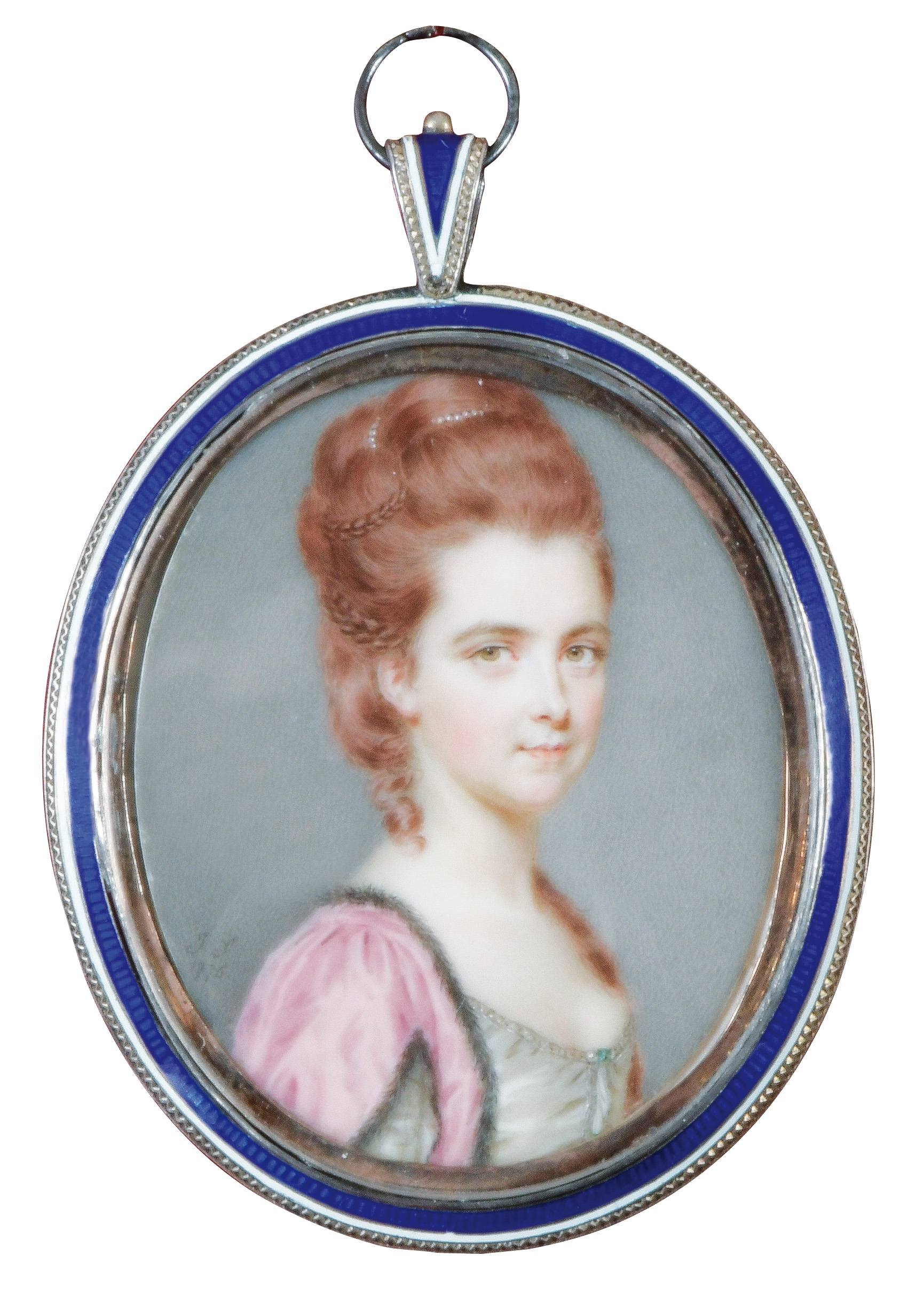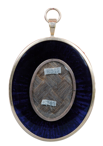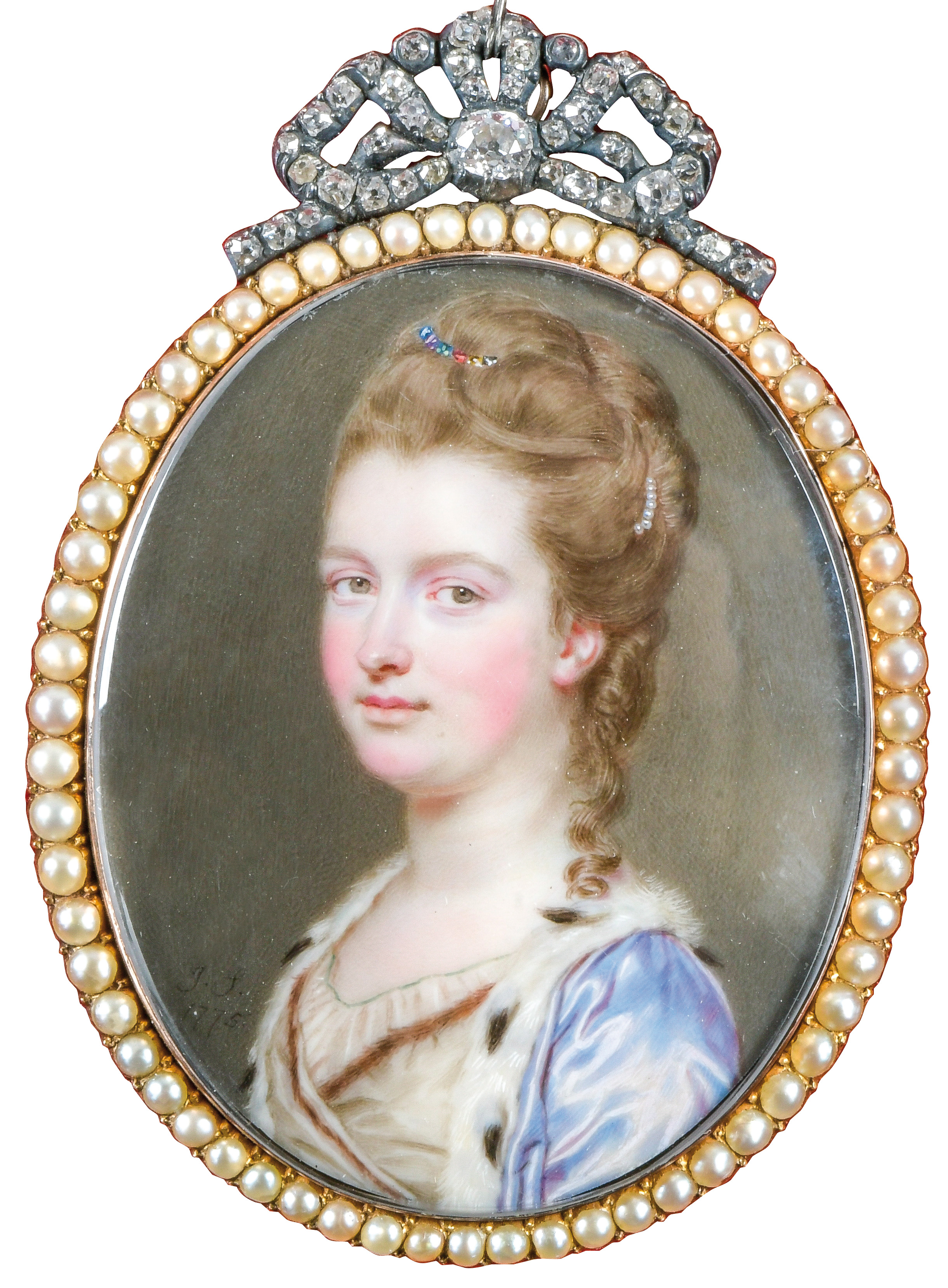 (1742/43-1811) Porträt einer Dame. Bunt gemalt in Puderfarben und aquarelliert auf Elfenbeinplatte, li./mittig/monogr./dat. 1775, hi./Gl. in 18 kt Goldrahmen mit Perlen- und Diamantbesatz; verso hi./Gl. geflochtene Haararbeit und ligiertes Monogramm „JF“. Provenienz: Bonhams, London 22. April 2004, GBP 81.000,00, The Albion Collection. Elfenbein-Gutachten und EU-Verkaufsgenehmigung liegen vor und können für EUR 150,00 erworben werden. 4,7 x 3,8 / 6,3 x 4,4 cm € 15.000,- - Katalog-Nr: 147John Smart