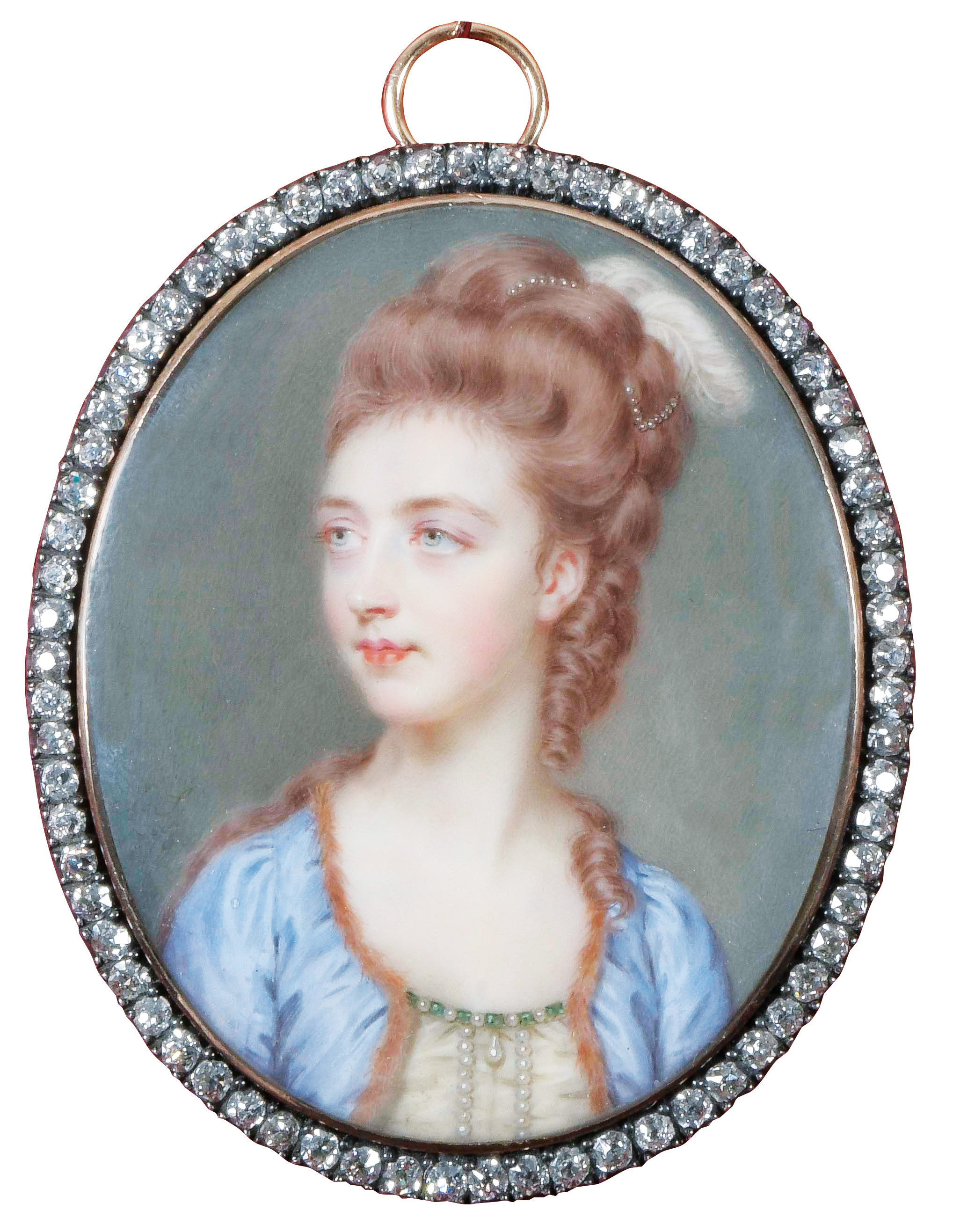 (1742/43-1811) Porträt einer jungen Dame in einem weißen Seidenkleid mit Perlen- und Smaragdsaum, hellblauem Seidenüberwurf mit Pelzbesatz, weiße Feder und Perlen im hochgesteckten Haar. Exzellent bunt gemalt in Puderfarben und aquarelliert auf Elfenbeinplatte, li./mittig/monogr./dat. 1776, hi./Gl. in 14 kt Goldrahmen mit -rückseite und Diamantbesatz. Provenienz: Slg. Mrs. Fleischmann, London 1912; Sotheby's, London 7. Mai 1946, Ashcroft Collection; Sotheby's, London 27. Feb. 1990; Christie's, London 9. Dez. 2003, GBP 48.500,00.. Literatur: K. Henninger-Tavcar, „Miniaturporträts“, Pforzheim 1995, S. 267. Ausstellung: „Exposition de la miniature“, Hôtel Goffinet, Brüssel 1912, Nr. 330 (als Leihgabe von Mrs. Fleischmann, London). Elfenbein-Gutachten und EU-Verkaufsgenehmigung liegen vor und können für EUR 150,00 erworben werden. 4,7 x 4 / 5,4 x 4,5 cm € 15.000,- - Katalog-Nr: 148John Smart