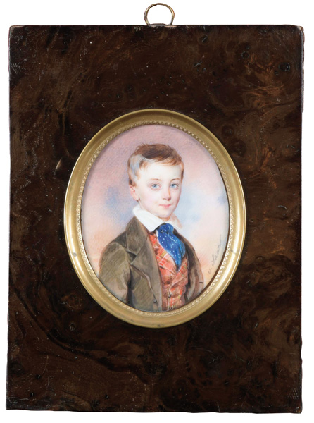 (1797-1853) Porträt eines Knaben. Bunt gemalt in Puderfarben und aquarelliert auf Elfenbeinplatte, re./mittig/sign., hi./Gl. in breitem Ahornrahmen mit Messingkranz. Provenienz: Christie's, London 6. Nov. 2001. Elfenbein-Gutachten und EU-Verkaufsgenehmigung liegen vor und können für EUR 150,00 erworben werden. 9,3 x 7,4 / 18,8 x 14,5 cm € 2.500,- - Katalog-Nr: 133Englischer Miniaturist