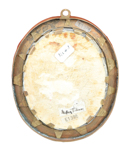 des 18. Jhs. Doppelporträt eines Vaters mit Sohn. Bunt gemalt in Puderfarben und aquarelliert auf Elfenbeinplatte, hi./Gl. in schlichtem Messingrahmen. Provenienz: Sotheby's, Zürich 13. Nov. 1979. Elfenbein-Gutachten und EU-Verkaufsgenehmigung liegen vor und können für EUR 150,00 erworben werden. 7,2 x 5,6 / 8,4 x 6,8 cm € 400,- - Katalog-Nr: 134Russischer Miniaturist