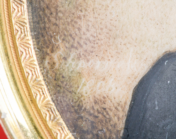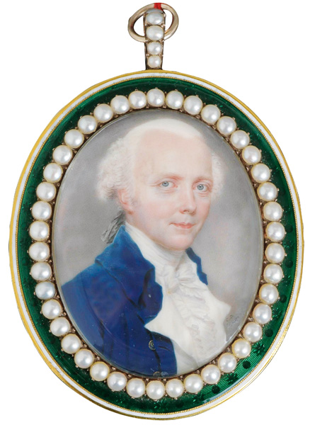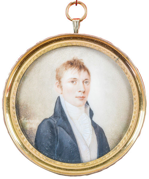 (1764-1841) Porträt eines Herren. Bunt gemalt in Puderfarben und aquarelliert auf Elfenbein, li./mittig/sign./dat. 1808, hi./Gl. in feuervergoldetem, ziseliertem Bronzerahmen. Provenienz: Christie's, London 14. Mai 1991. Elfenbein-Gutachten und EU-Verkaufsgenehmigung liegen vor und können für EUR 150,00 erworben werden. D=6,7 / 7,9 cm € 750,- - Katalog-Nr: 140Horace Hone
