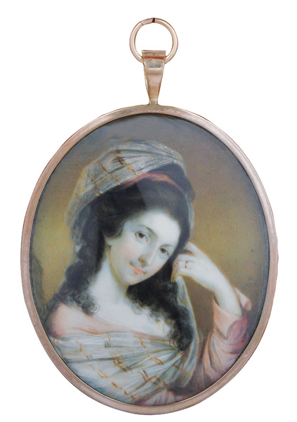 (1754-1825) Porträt von Elizabeth Le Touche (1756-1842). Bunt gemalt in Puderfarben und aquarelliert auf Elfenbeinplatte, re./mittig/monogr./dat. 1788, hi./Gl. in aufwendigem, vergoldetem Rahmen, verso blau guillochiert, hi./Gl. geflochtener Haarschmuck. Provenienz: Sotheby's, London 30. Juni 1980. Elfenbein-Gutachten und EU-Verkaufsgenehmigung liegen vor und können für EUR 150,00 erworben werden. 7,8 x 6,4 / 8 x 6,8 cm € 1.000,- - Katalog-Nr: 141Cécile Villeneuve, geb. Colombet