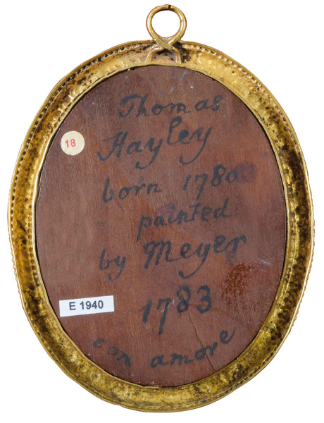 (1735-1789) Porträt von Thomas Alphonso Hayley (*1780). Bunt gemalt in Puderfarben und aquarelliert auf Elfenbeinplatte, re./mittig/sign., hi./Gl. in feuervergoldetem, reliefiertem Bronzerahmen. Anmerkungen: Thomas Alphonso Hayley war der Sohn des Schriftstellers William Hayley (1745-1820), Freund und Biograph von William Cowper. Thomas zeigte künstlerisches Talent und wurde 1795 von William Hayleys Freund, dem Bildhauer John Flaxman, in die Lehre genommen. In diesem Jahr wurden der junge Thomas und Flaxman von George Romney vor einer Büste von William Hayley gemalt. Das Gemälde befindet sich heute in der National Portrait Gallery, London (NPG101). Provenienz: Sotheby's, London 12. Dez. 1966; Christie's, London 29. Nov. 2011. Elfenbein-Gutachten und EU-Verkaufsgenehmigung liegen vor und können für EUR 150,00 erworben werden. 8 x 6,4 / 10,5 x 7,8 cm € 2.000,- - Katalog-Nr: 144Jean-Adam Serre