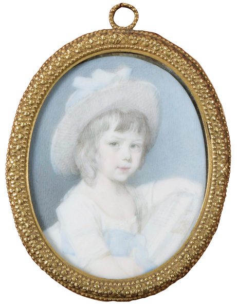 (1751-1831) Porträt der Madame Sauveige mit einem Mädchen auf dem Schoß. Bunt gemalt in Puderfarben und aquarelliert auf Elfenbeinplatte, li./mittig/sign., hi./Gl. in schlichtem, profiliertem Messingrahmen. Provenienz: : Christie' s, London 28. Mai 2002 für GBP 48.000,00. Vgl. Lt. zweitem Honorarbuch des Künstlers, Nationalbibliothek Frankreich, Stiftung Jacques Doucet, Folio 11, 10.-20. Jan 1790: „Mde Sauveige et une jeune Dlle 35 (Louis d'or)“. Elfenbein-Gutachten und EU-Verkaufsgenehmigung liegen vor und können für EUR 150,00 erworben werden. D=7,4 / 8,3 cm € 7.500,- - Katalog-Nr: 130Englischer Miniaturist