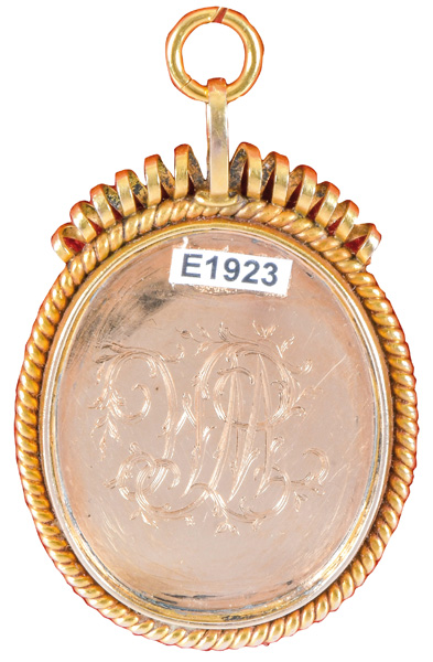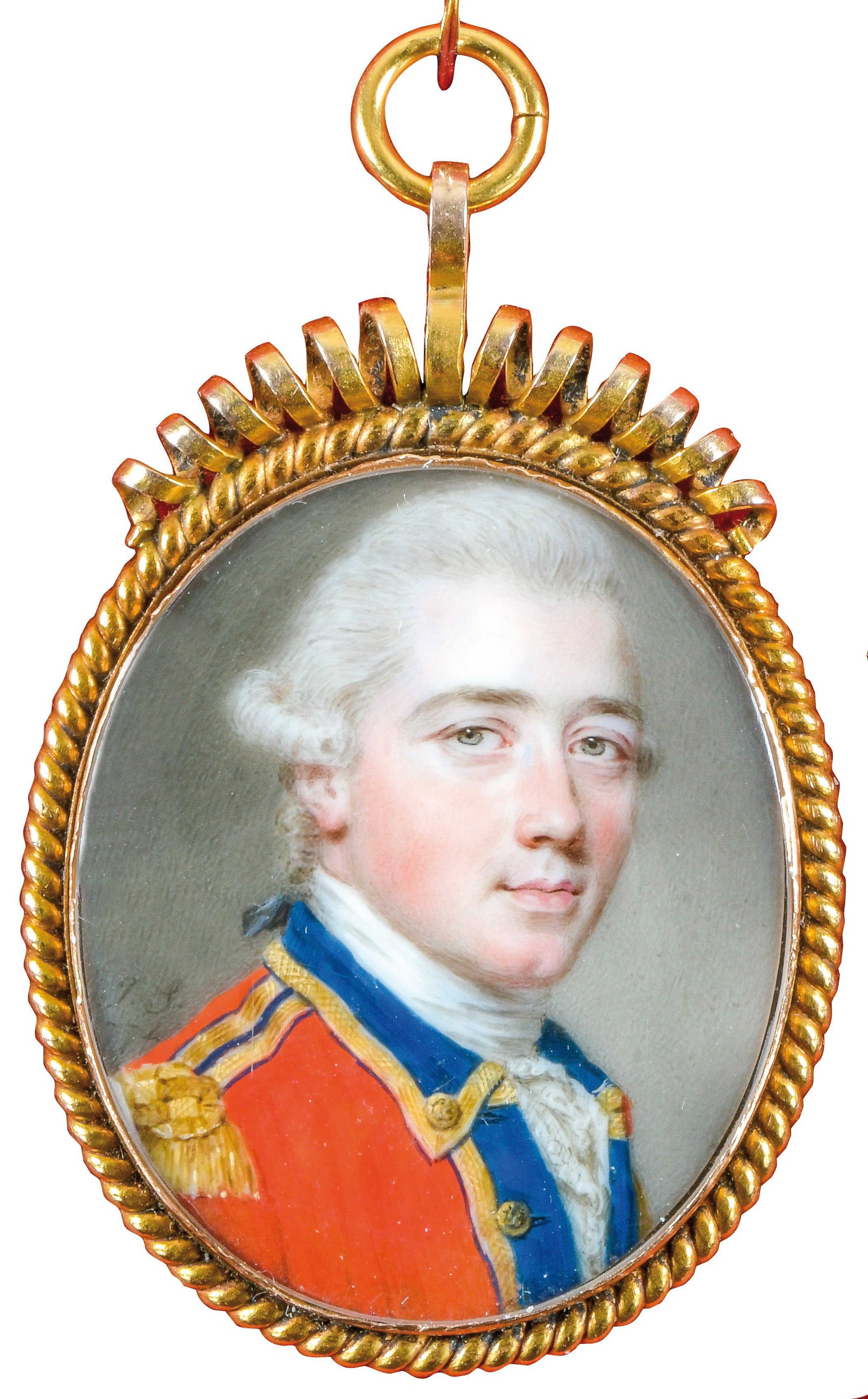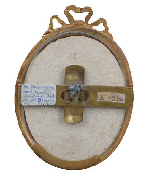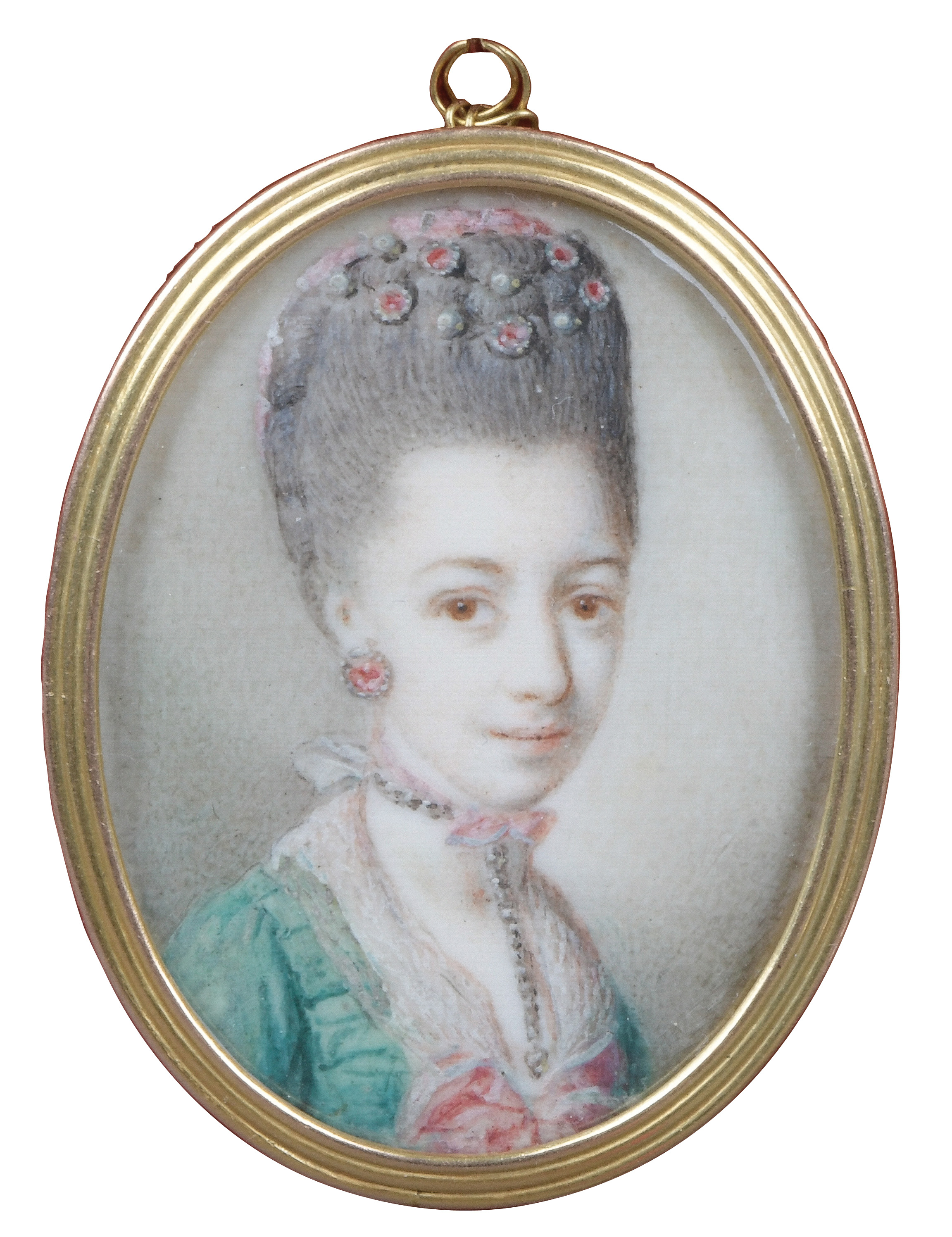 Porträt eines Offiziers mit gepudertem Haar. Bunt gemalt in Puderfarben und aquarelliert auf Elfenbeinplatte, li./mittig/monogr./dat. 1774, in 18 kt Goldrahmen mit -rückseite und Hängeöse in Spiralform. Provenienz: Christie's, London 25. Mai 2004, GBP 18.000,00. Elfenbein-Gutachten und EU-Verkaufsgenehmigung liegen vor und können für EUR 150,00 erworben werden.