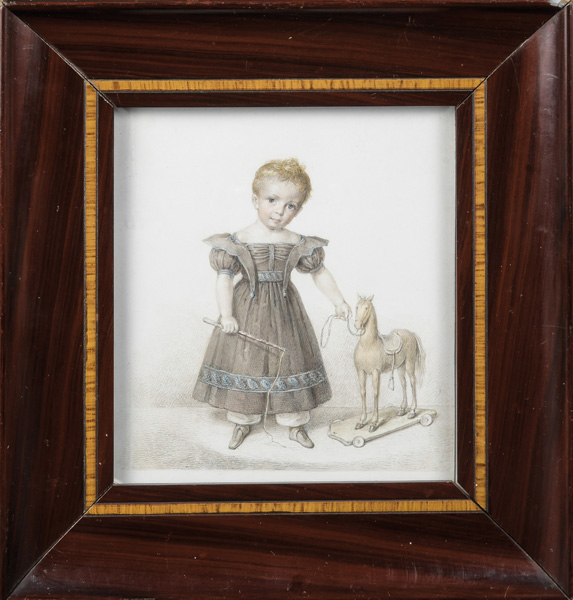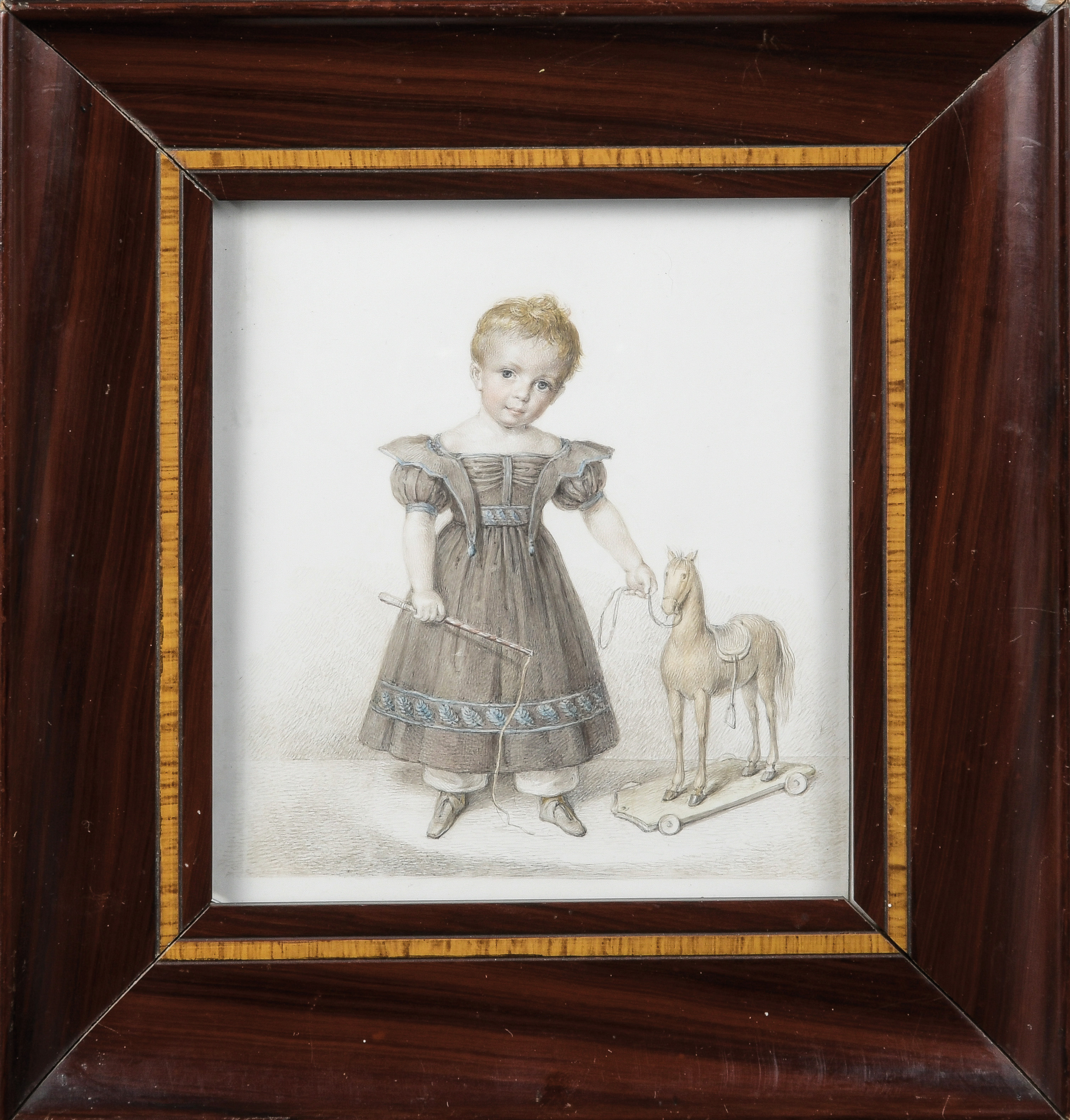 Porträt eines stehenden Knaben mit Holzpferd. Bunt gemalt in Aquarell, Tinte und Farbstift auf Karton, hi./Gl. gerahmt. Provenienz: Sotheby's, Zürich 17. Mai 1979.