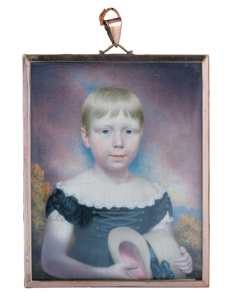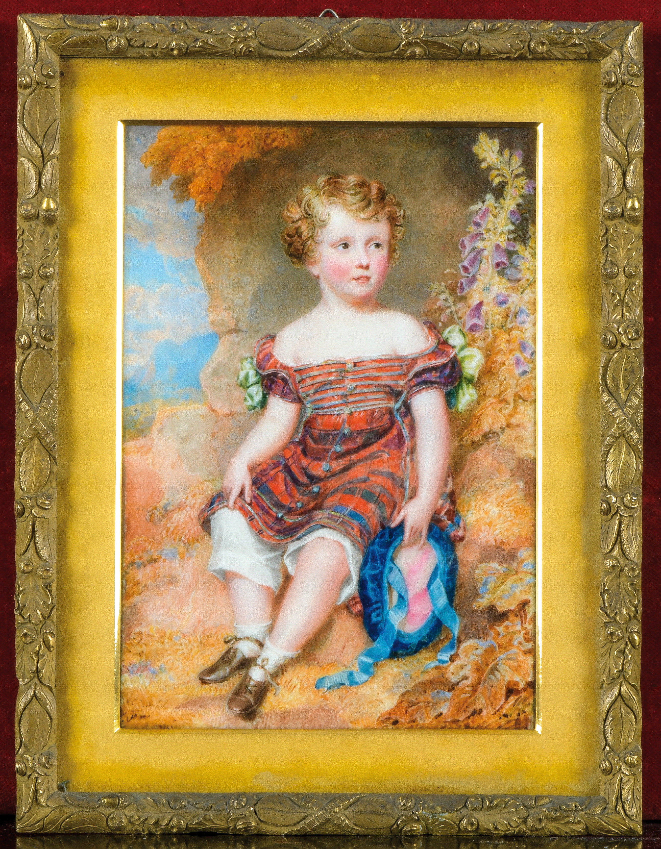 Porträt von Master Balcarres B.W. Ramsay. Bunt gemalt in Puderfarben und aquarelliert auf Elfenbeinplatte, li./u./sign., mit Passepartout hi./Gl. in aufwendig mit Eichenlaub und Eicheln reliefiertem, feuervergoldetem Bronzerahmen. Provenienz: Sotheby's, London 28. Juli 1980. Elfenbein-Gutachten und EU-Verkaufsgenehmigung liegen vor und können für EUR 150,00 erworben werden.