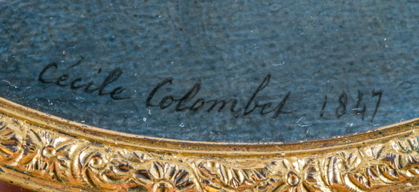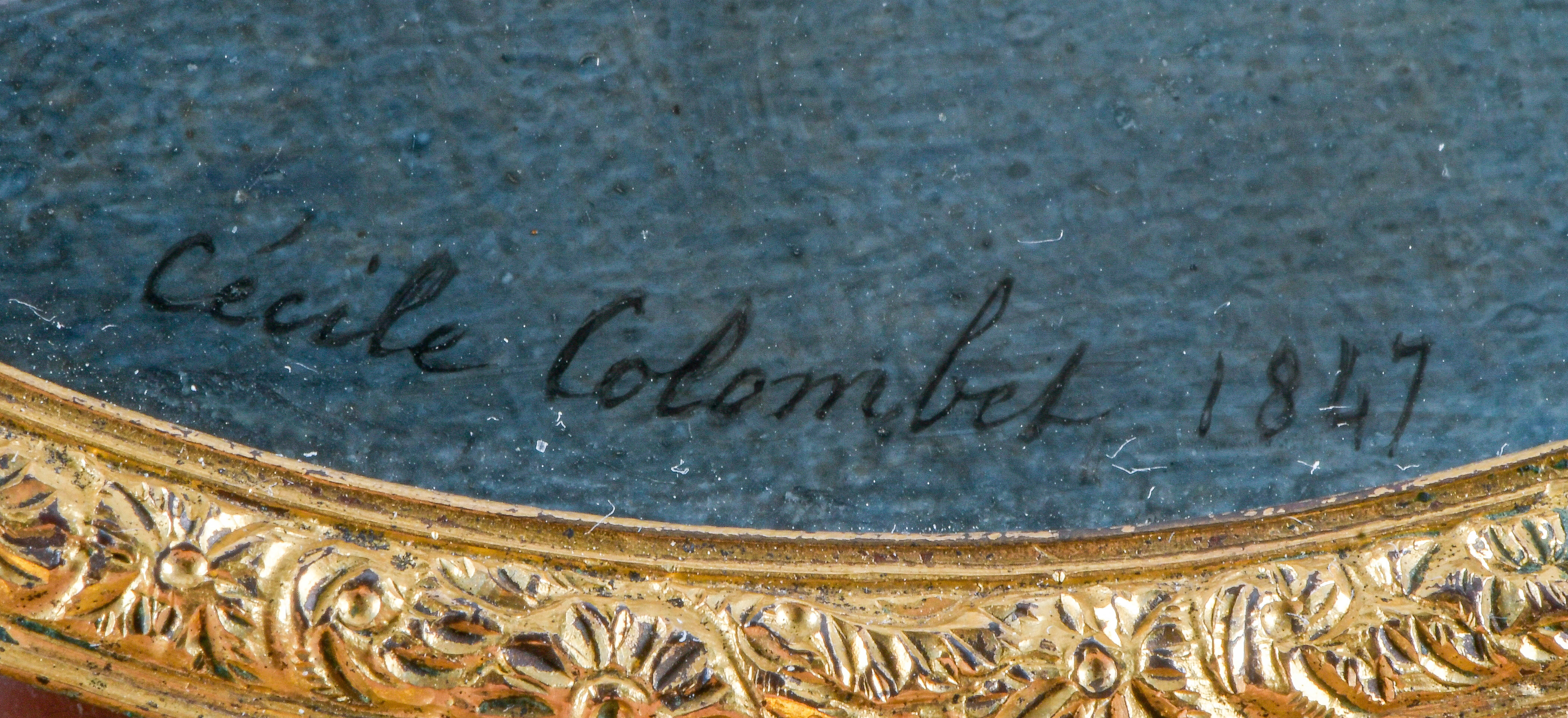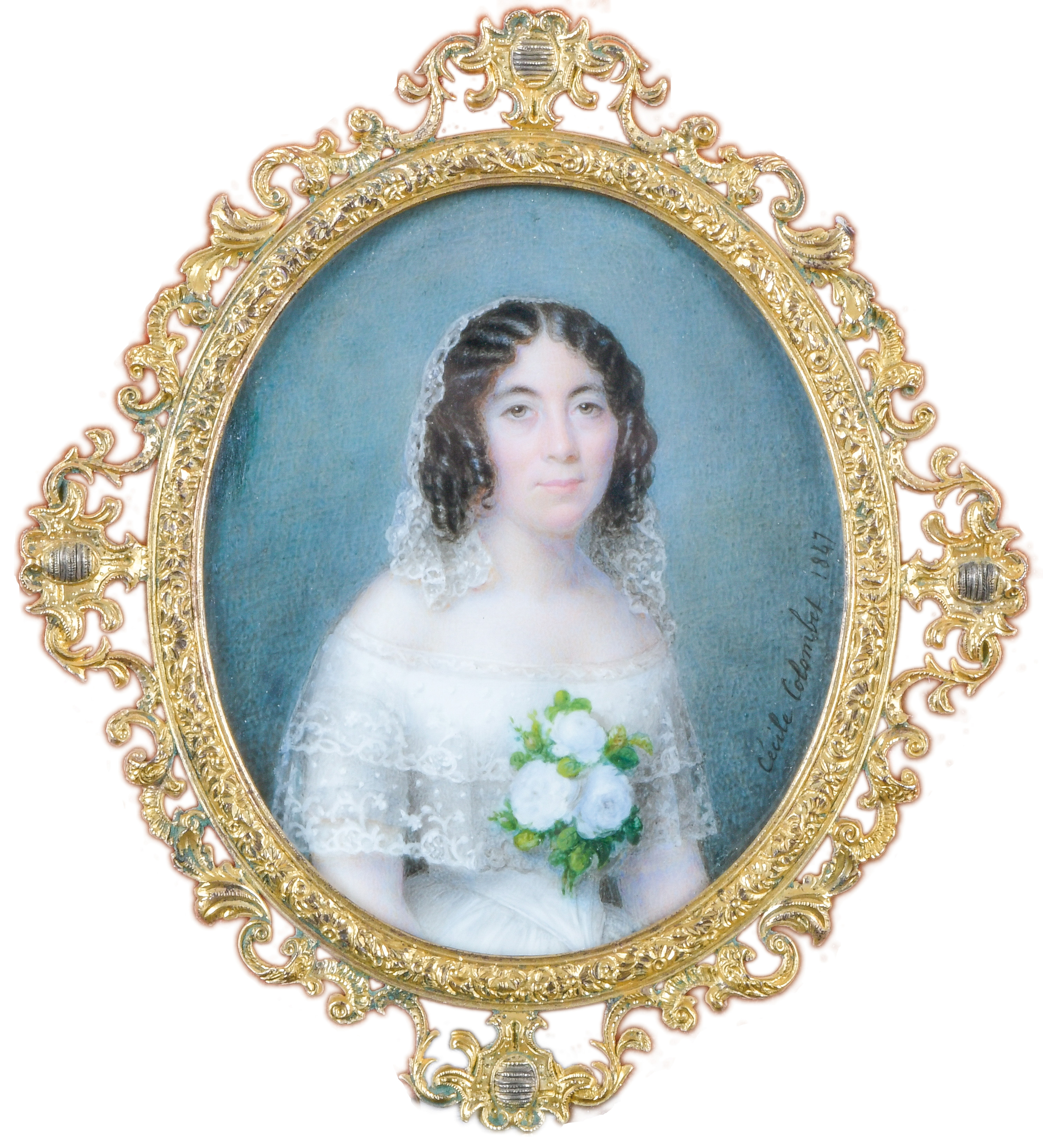 Selbstporträt im Hochzeitskleid. Bunt gemalt in Puderfarben und aquarelliert auf Elfenbein, re./mittig/sign./dat. 1847, hi./Gl. in aufwendig durchbrochenem, feuervergoldetem Bronzerahmen. Provenienz: Christie's, London 09. Dez. 2003. Elfenbein-Gutachten und EU-Verkaufsgenehmigung liegen vor und können für EUR 150,00 erworben werden.