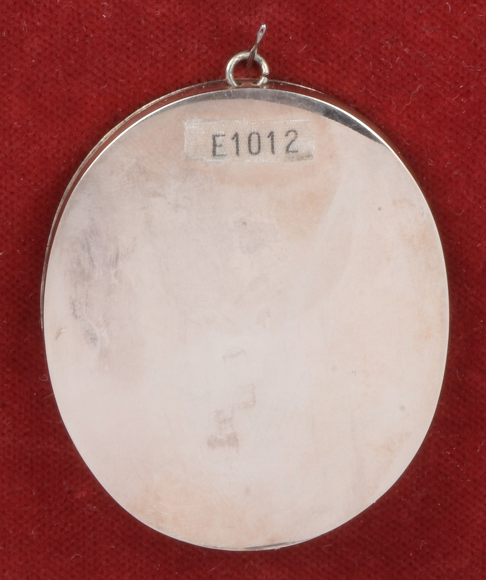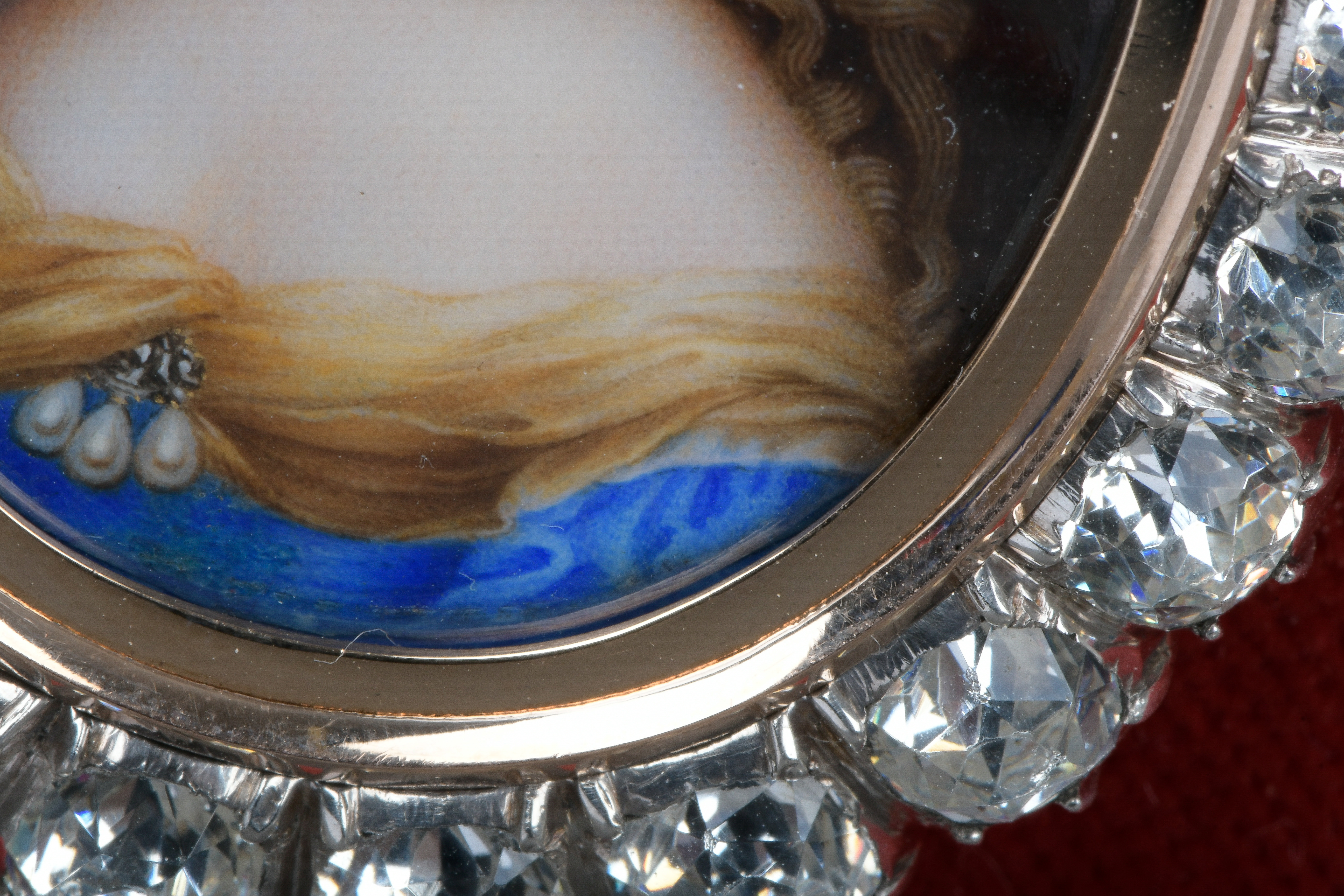 Porträt einer Dame. Bunt gemalt in Puderfarben und aquarelliert auf Elfenbeinplatte, hi./Gl. in aufwendig prunkvollem Rahmen mit Silberfassung und -rückwand, umlaufend mit geschliffenen Glassteinen, Innenfeld mit 14 kt Gelbgoldrahmen. Elfenbein-Gutachten und EU-Verkaufsgenehmigung liegen vor und können für EUR 150,00 erworben werden.
