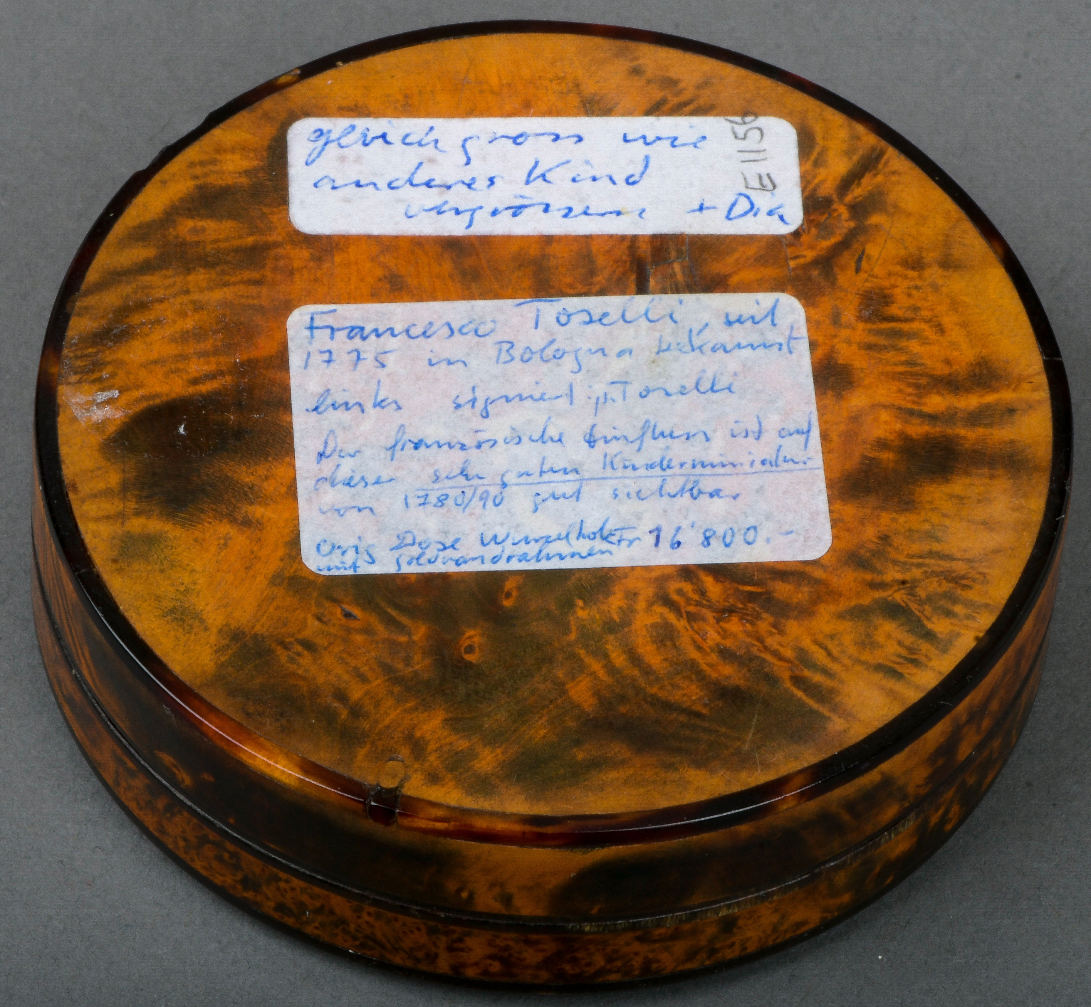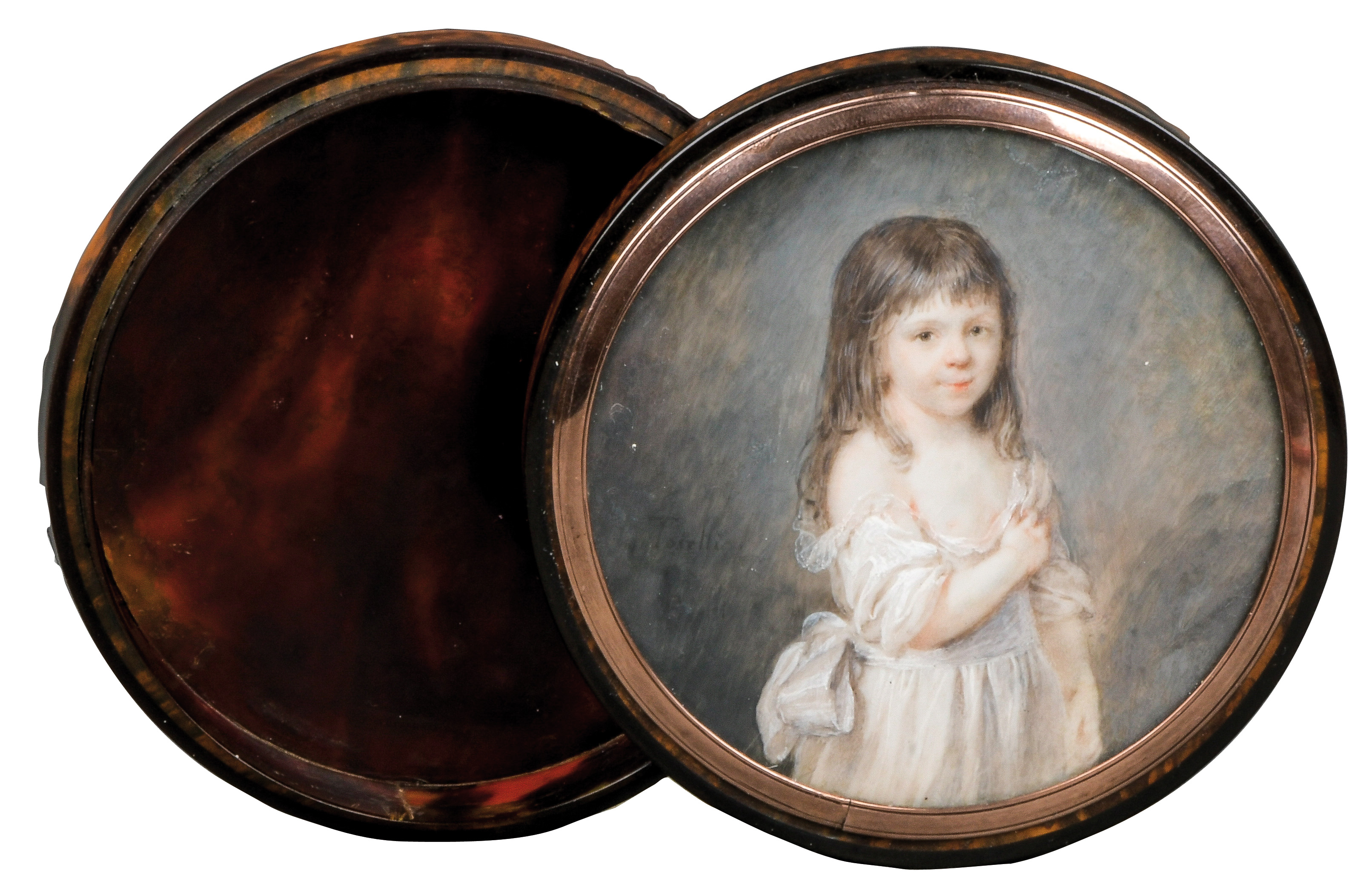 Porträt eines Mädchens. Bunt gemalt in Puderfarben und aquarelliert auf Elfenbeinplatte, li./mittig/sign., mit Goldrahmen hi./Gl. eingelassen in runde Schildpatt-Wurzelholzdose. Provenienz: Kunsthandel Edwin Bucher, Basel 1985, für SFR 18.000,00. Elfenbein-Gutachten und EU-Verkaufsgenehmigung liegen vor und können für EUR 150,00 erworben werden.