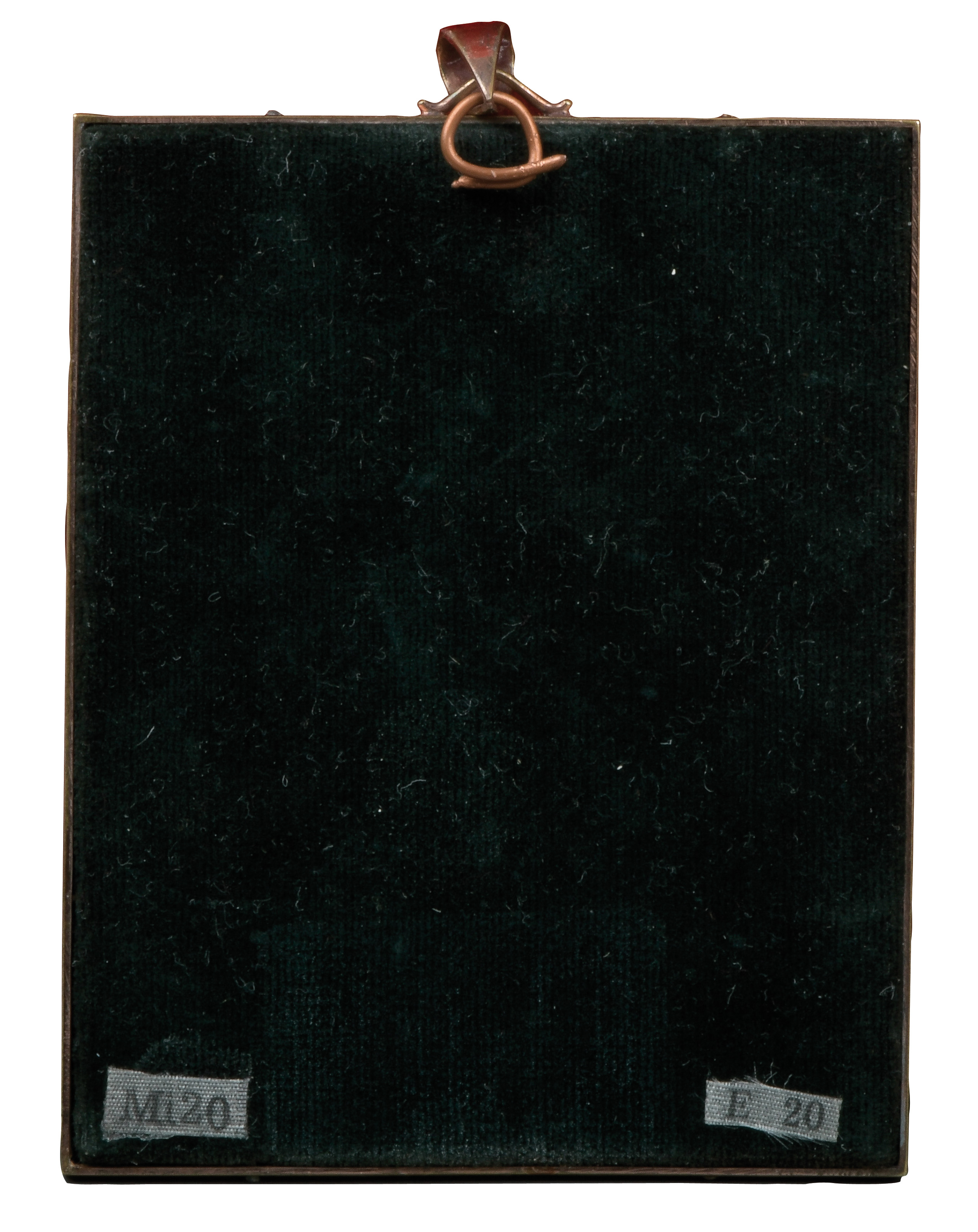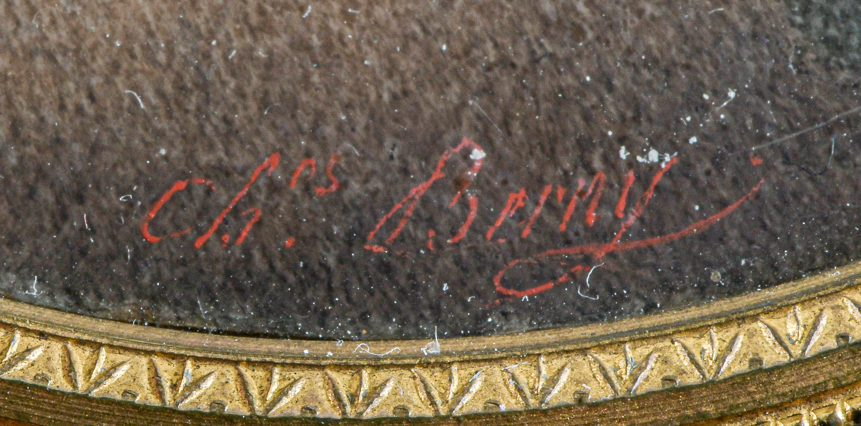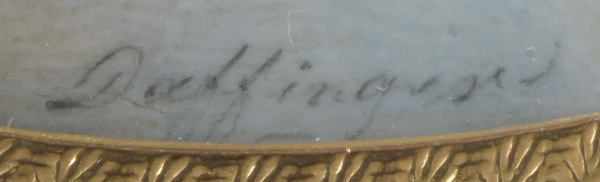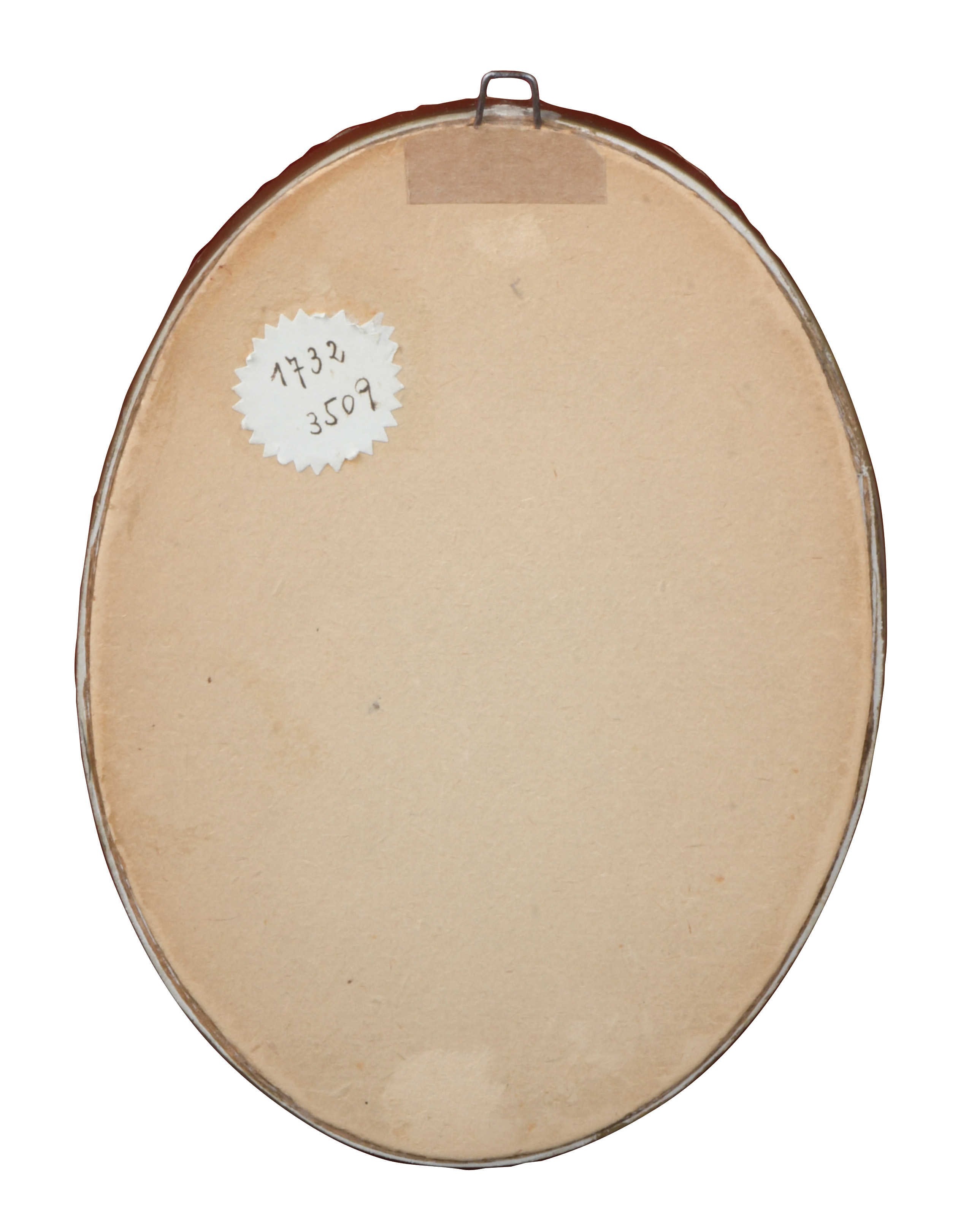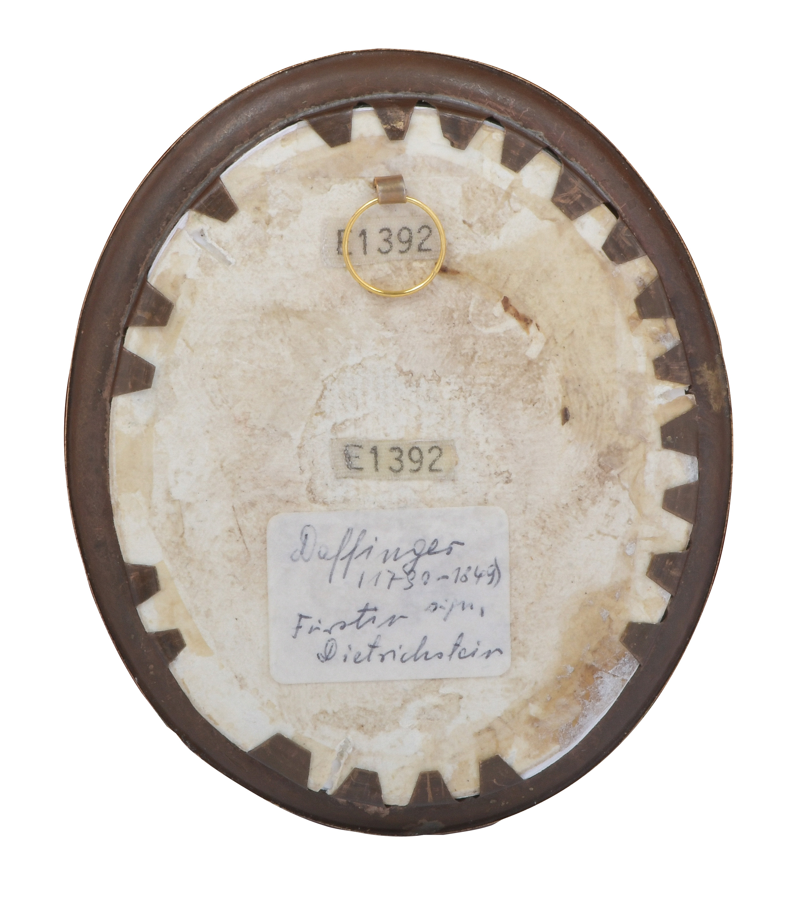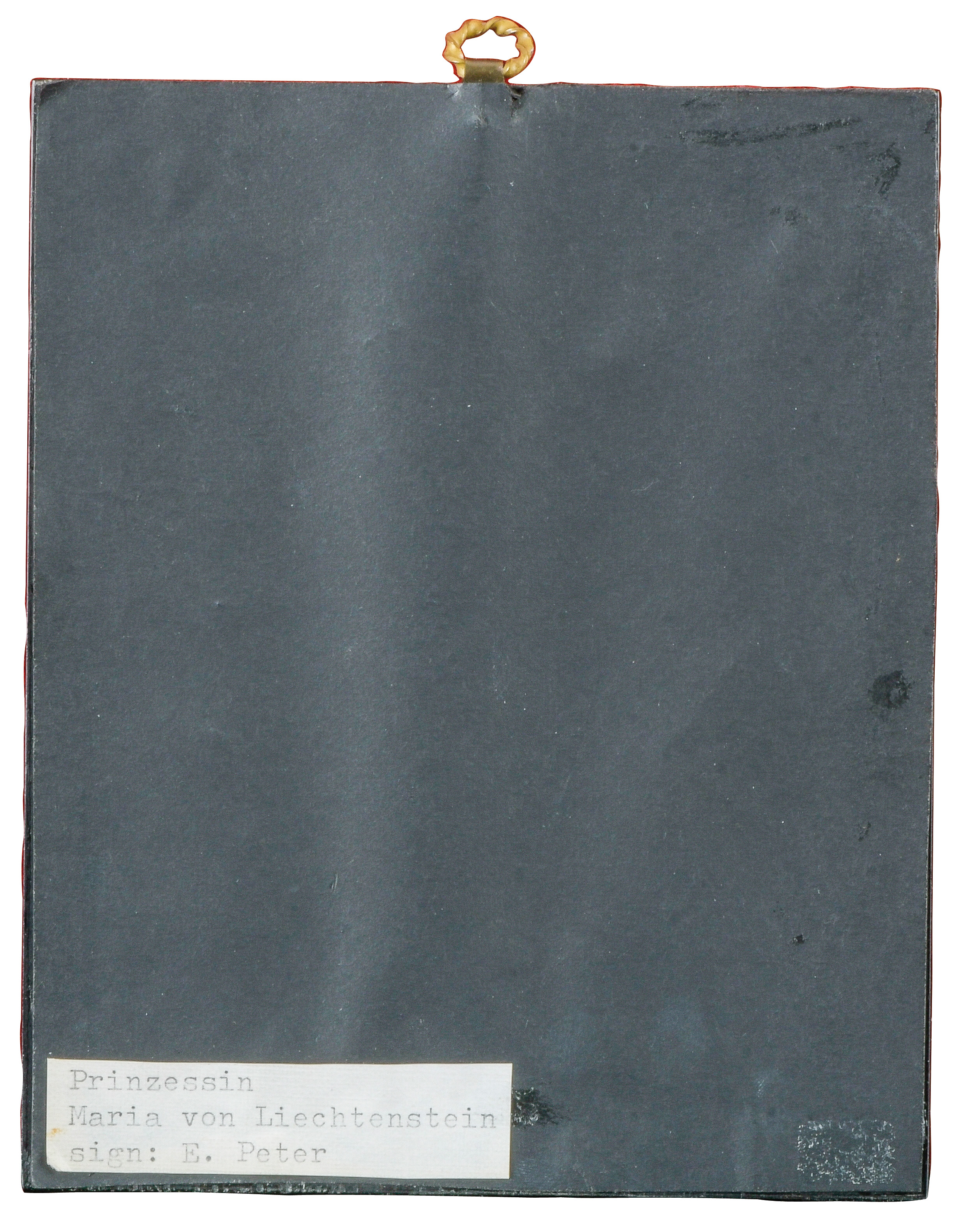 Porträt der Fürstin von Dietrichstein. Bunt gemalt in Puderfarben und aquarelliert auf Elfenbeinplatte, sign., hi./Gl. in aufwendigem, vergoldetem Messingrahmen mit Reliefkranz. Provenienz: Galerie Koller, Zürich 1986. Elfenbein-Gutachten und EU-Verkaufsgenehmigung liegen vor und können für EUR 150,00 erworben werden.