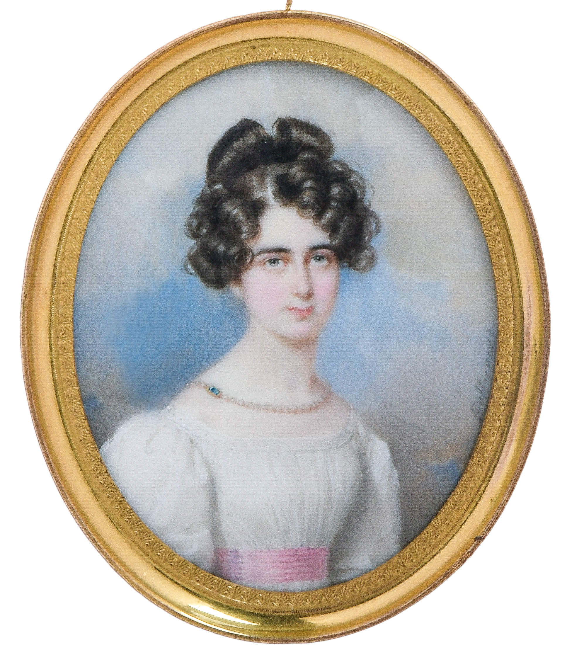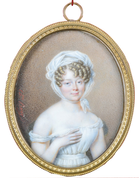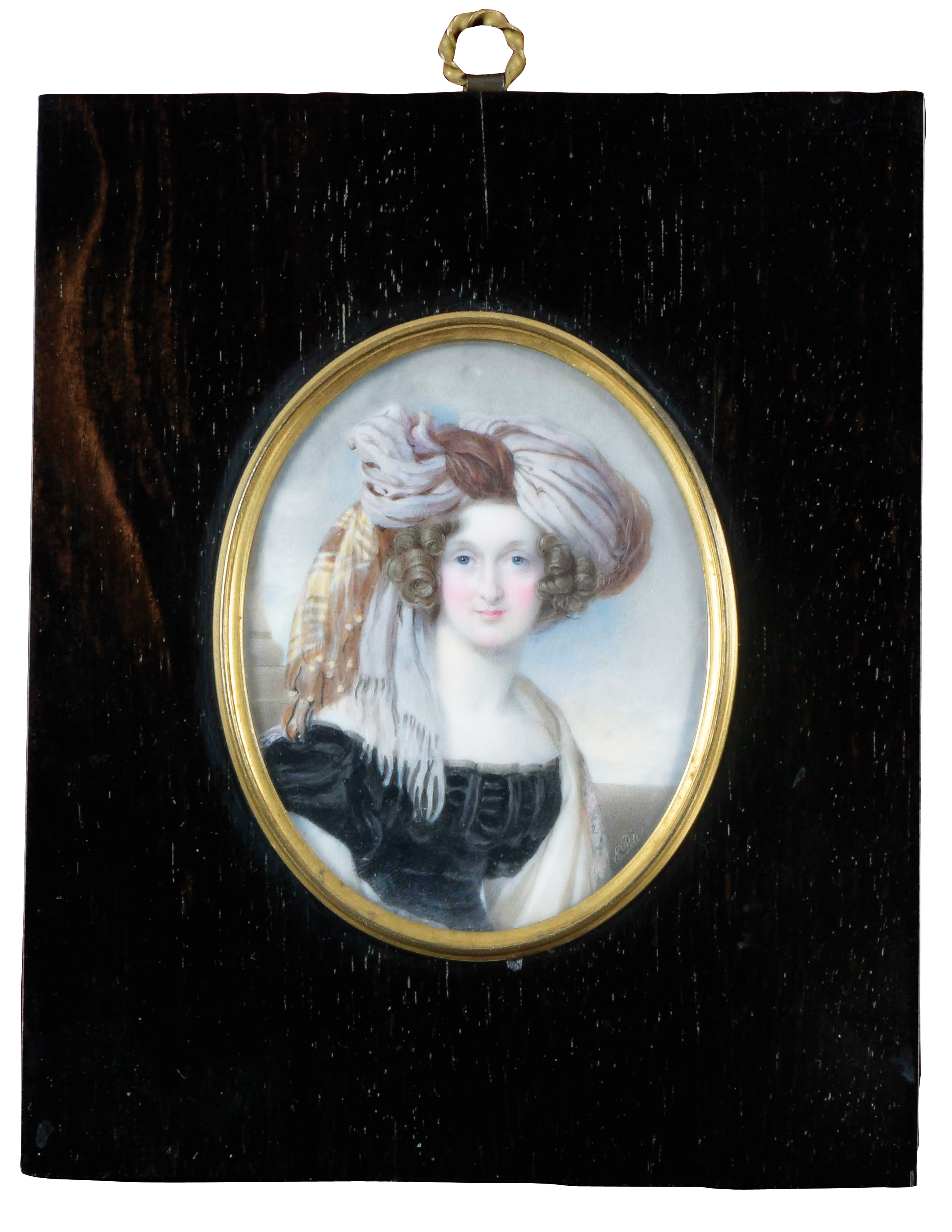 Porträt wohl von der Großfürstin Maria Pawlowna (1786-1859). Bunt gemalt in Puderfarben und aquarelliert auf Elfenbeinplatte, li./mittig/sign., verso bez., hi./Gl. in samtbezogenem Rahmen mit Messingkranz. Provenienz: Antiquitäten Gertrud Rudigier, München 1982. Elfenbein-Gutachten und EU-Verkaufsgenehmigung liegen vor und können für EUR 150,00 erworben werden.
