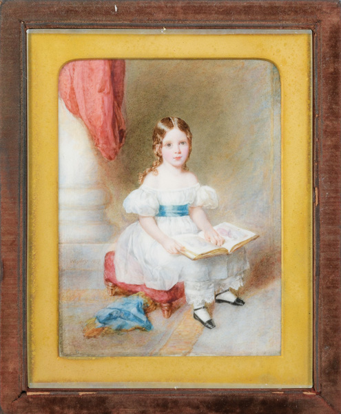 Porträt eines Mädchens mit Bilderbuch. Bunt gemalt in Puderfarben und aquarelliert auf Elfenbeinplatte, li./mittig/sign./dat. 1837, mit Passepartout hi./Gl. gerahmt. Provenienz: Sotheby's, London 25. Nov. 1979. Elfenbein-Gutachten und EU-Verkaufsgenehmigung liegen vor und können für EUR 150,00 erworben werden.