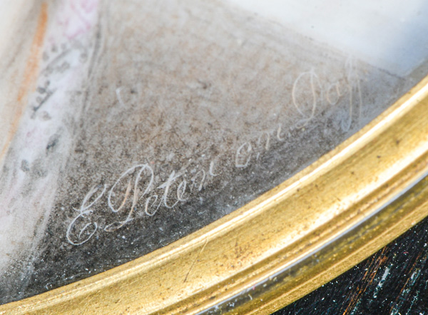 Porträt einer Dame mit aufgeschlagenem Buch. Bunt gemalt in Puderfarben und aquarelliert auf Elfenbein, re./u./sign., hi./Gl. in schlichtem Holzrahmen mit Stuckrelief, auf Kreidegrund gold gefasst. Provenienz: Christie's, London 27. Nov. 1984. Elfenbein-Gutachten und EU-Verkaufsgenehmigung liegen vor und können für EUR 150,00 erworben werden.