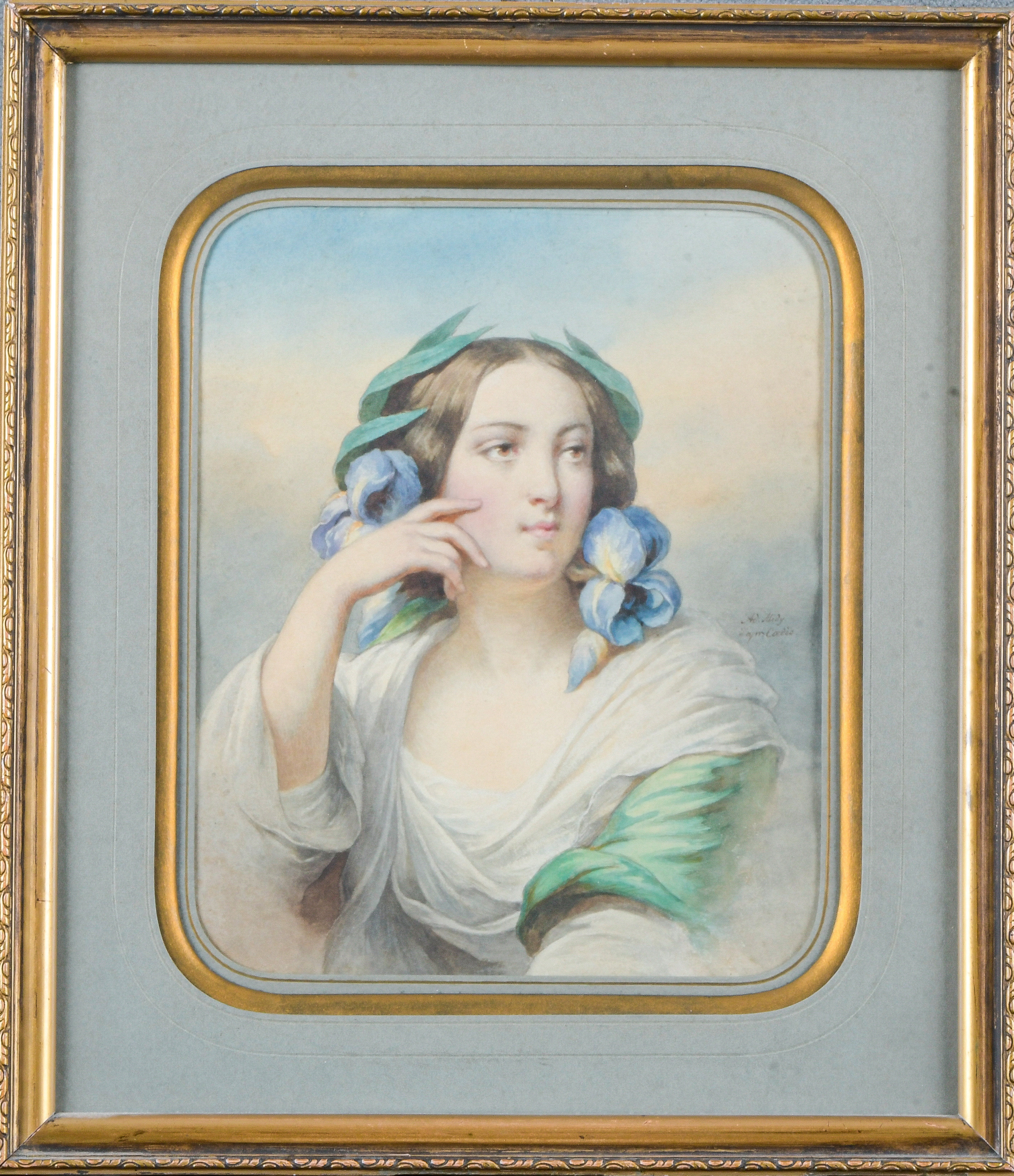 Porträt einer Dame mit Kopfschmuck aus Blättern und Blüten. Bunt aquarelliert auf Papier, re./mittig/sign., mit Passepartout hi./Gl. gerahmt.