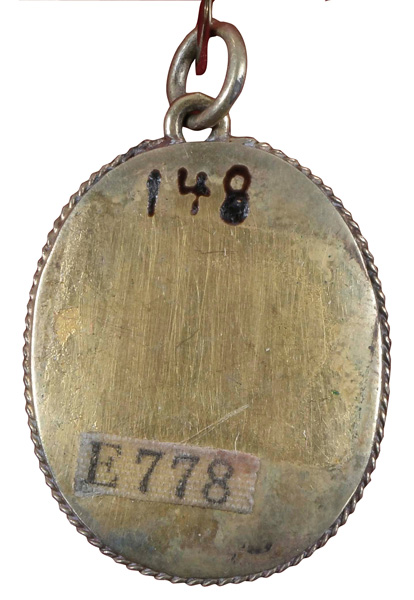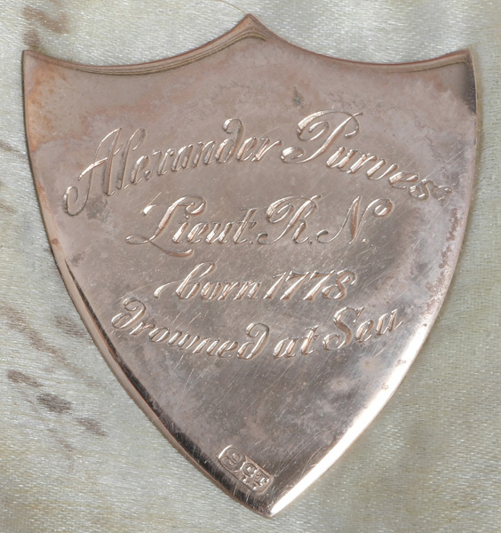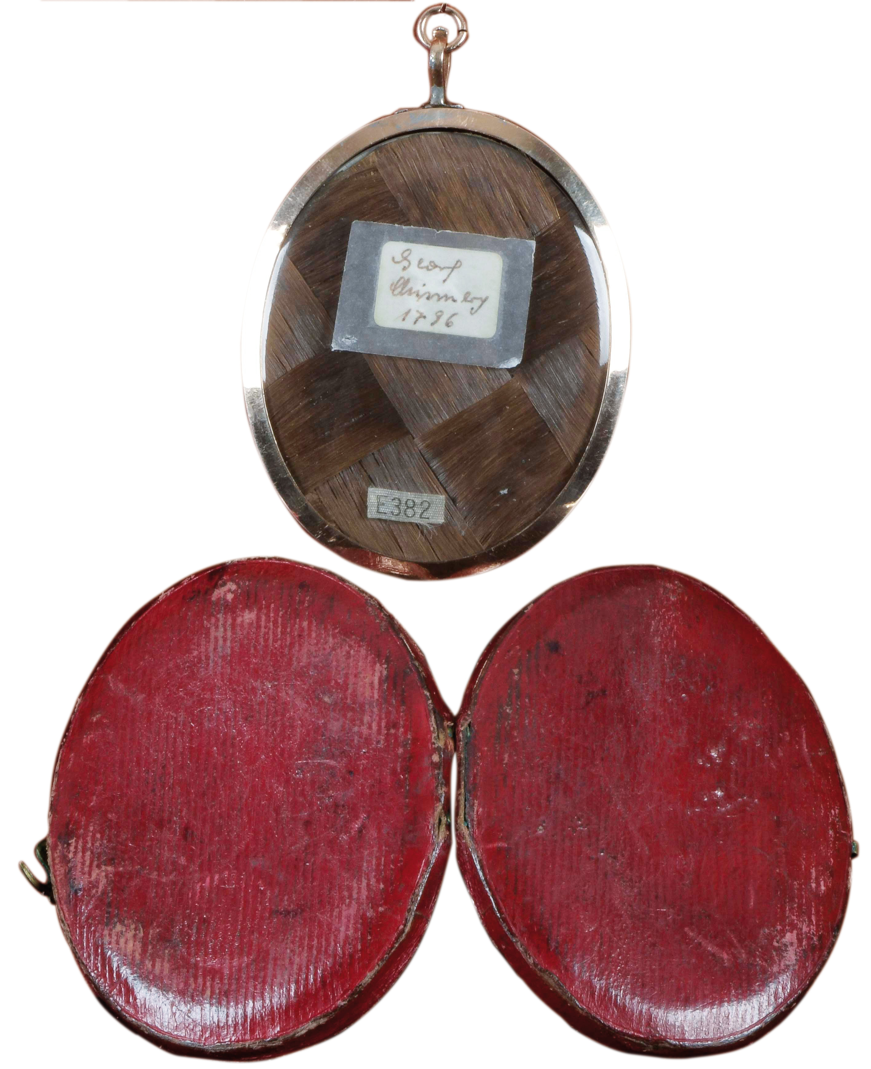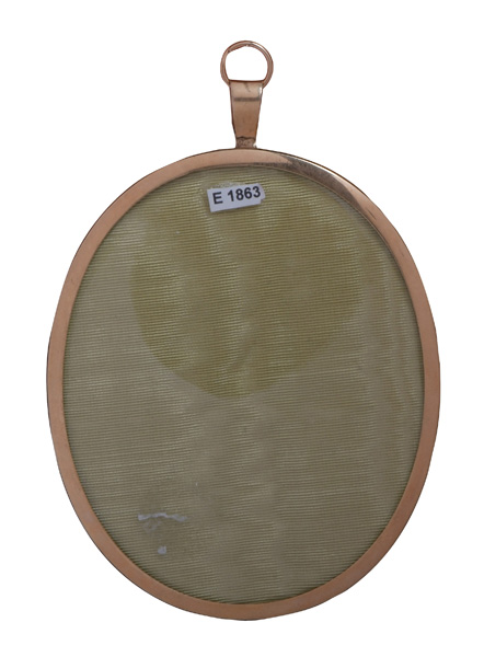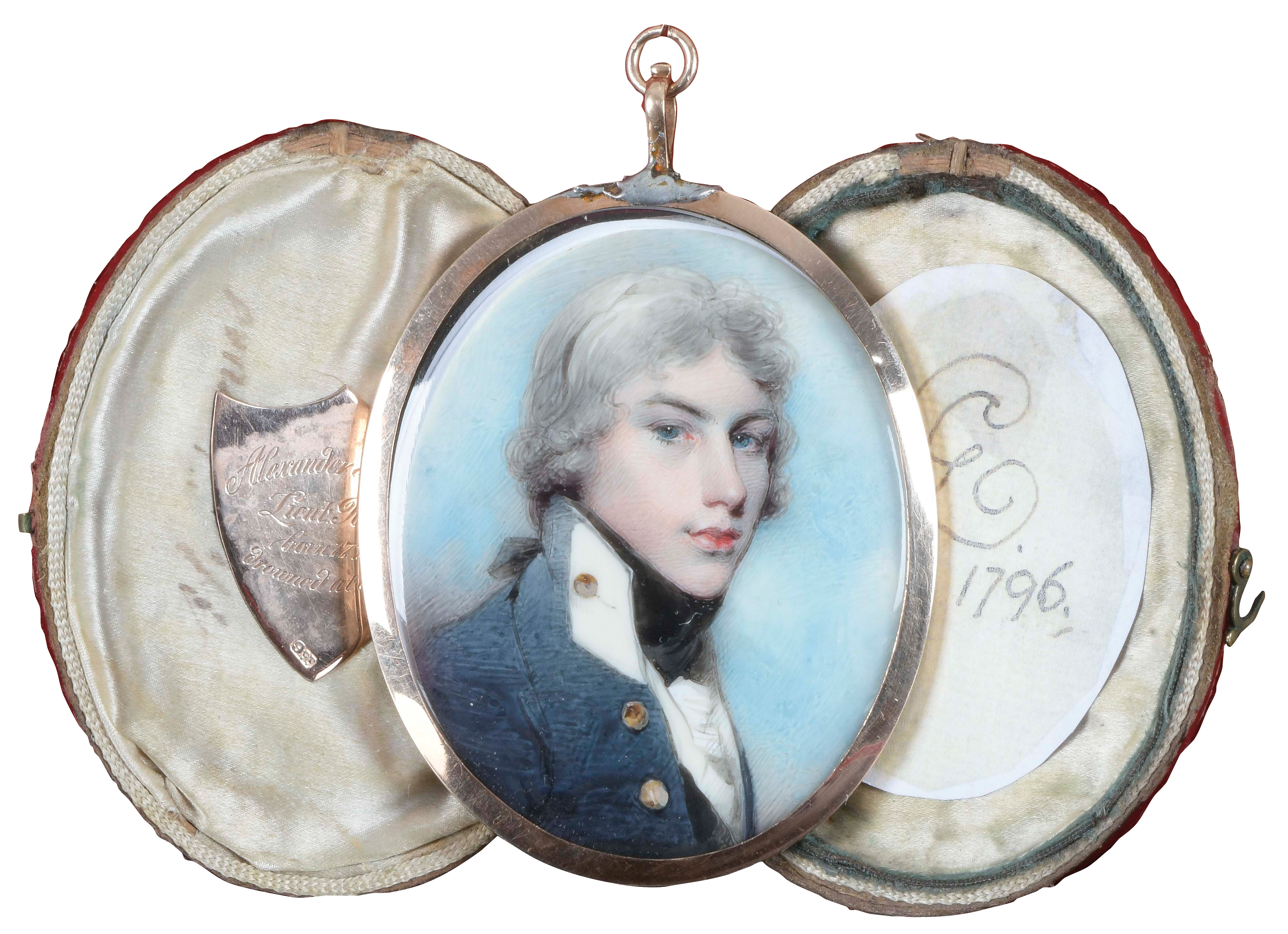 Porträt von Leutnant Alexander Purves (*1778). Bunt gemalt in Puderfarben und aquarelliert auf Elfenbeinplatte, hi./Gl. in 14 kt Goldrahmen, verso verglast mit geflochtener Haararbeit, rautenförmig präsentiert. Dazu aufklappbares rotes Etui mit beschrifteter Goldplatte und ovalem Papier, monogr./dat. „GC 1796“. Provenienz: Christie's, London 07. Okt. 1980. Elfenbein-Gutachten und EU-Verkaufsgenehmigung liegen vor und können für EUR 150,00 erworben werden.