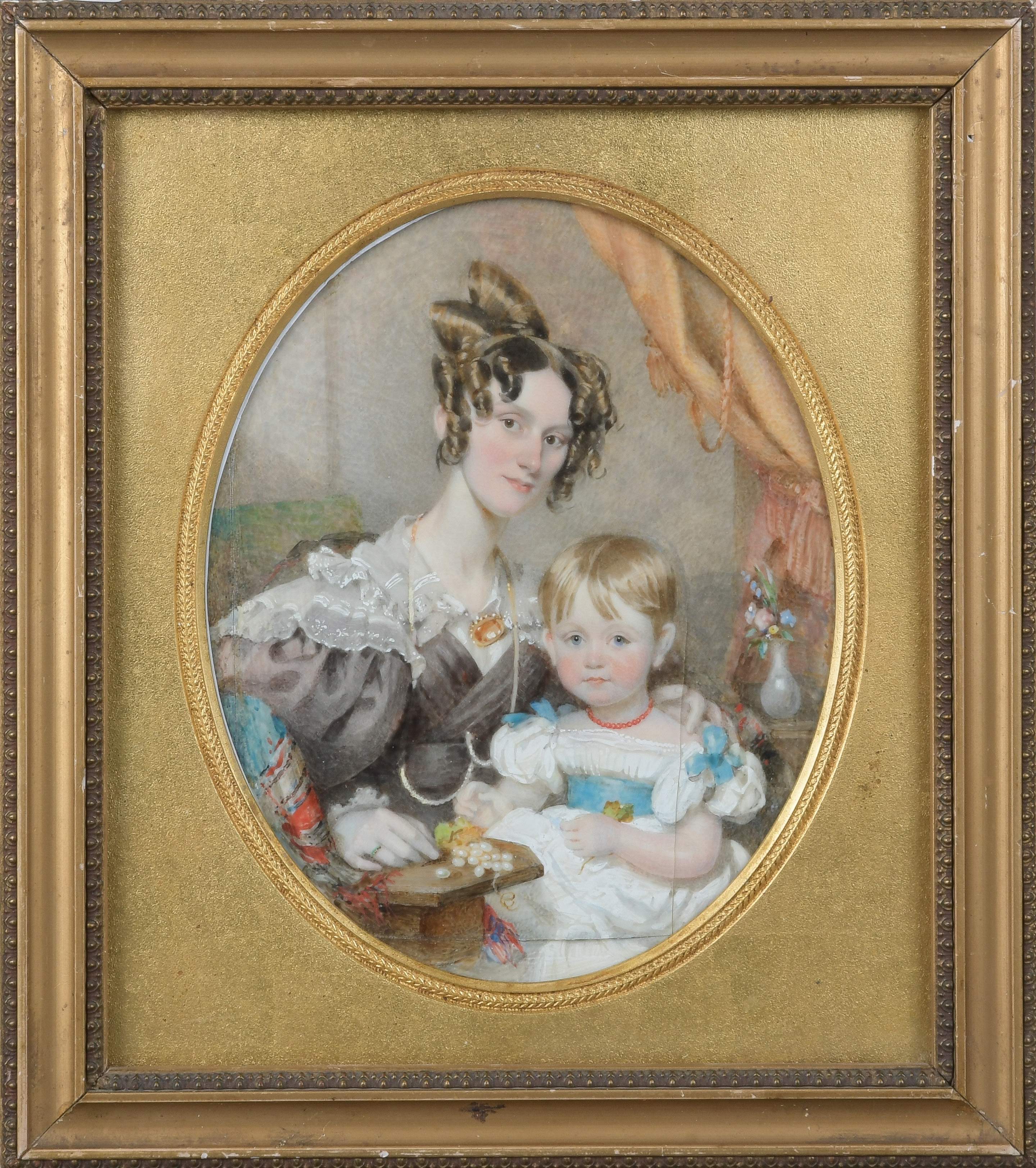Porträt von Harriet, der Gattin von Ambrose Moore mit ihrer Tochter Harriet Ann (1830-1913). Bunt gemalt in Puderfarben und aquarelliert auf Elfenbeinplatte, hi./Gl. in Holzrahmen, auf Kreidegrund gold gefasst (gesprungen, besch.). Provenienz: Sotheby's, London 25. Juni 1979. Elfenbein-Gutachten und EU-Verkaufsgenehmigung liegen vor und können für EUR 150,00 erworben werden.