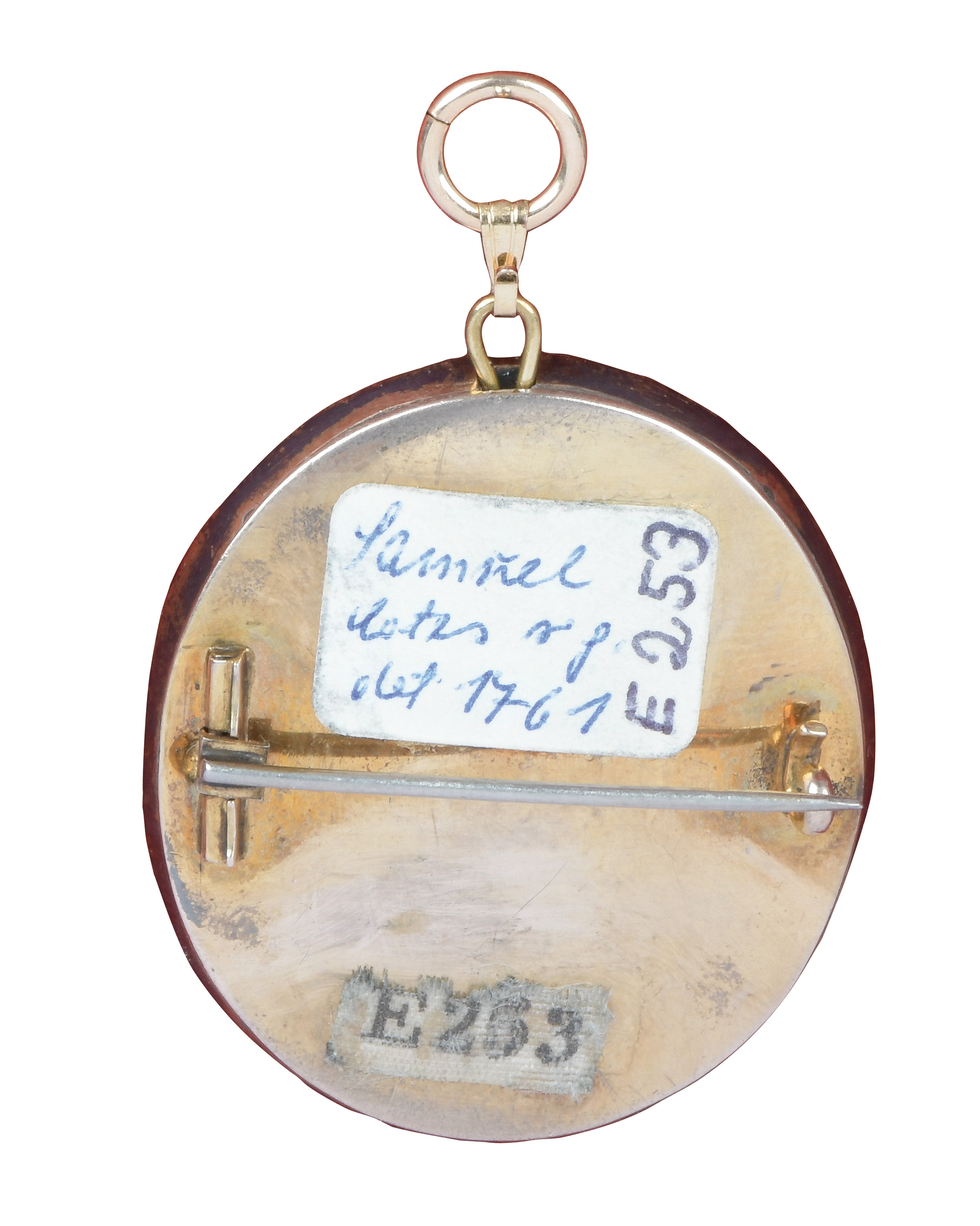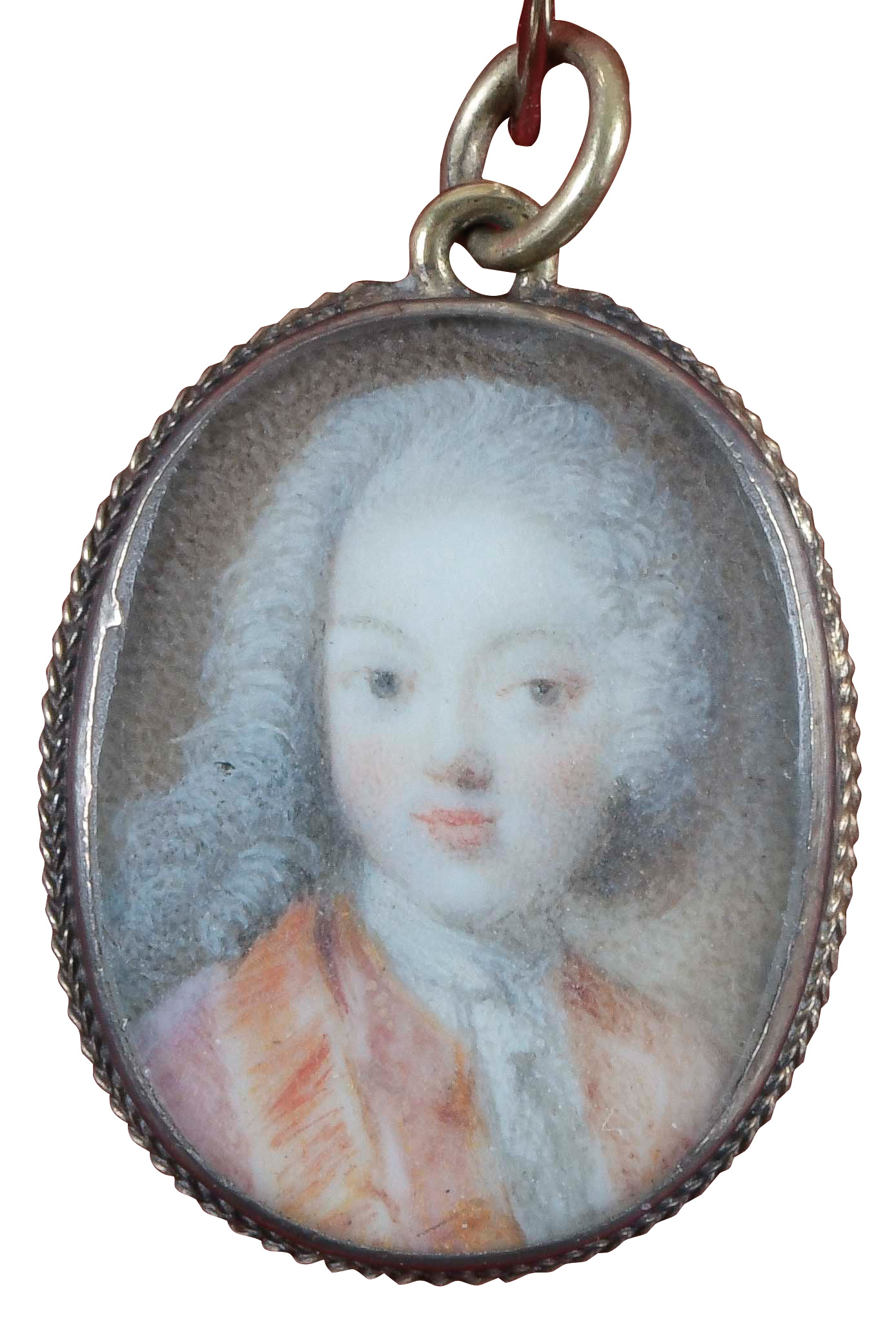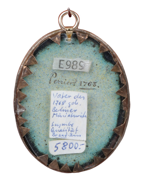 Porträt eines Herren. Bunt gemalt in Email auf Kupferplatte, li./mittig/sign./dat. 1761, in aufwendigem, vergoldetem Silberahmen, umlaufend besetzt mit Rubinsplittern und Rückplatte. Provenienz: Sotheby's, Zürich 6. Mai 1980.