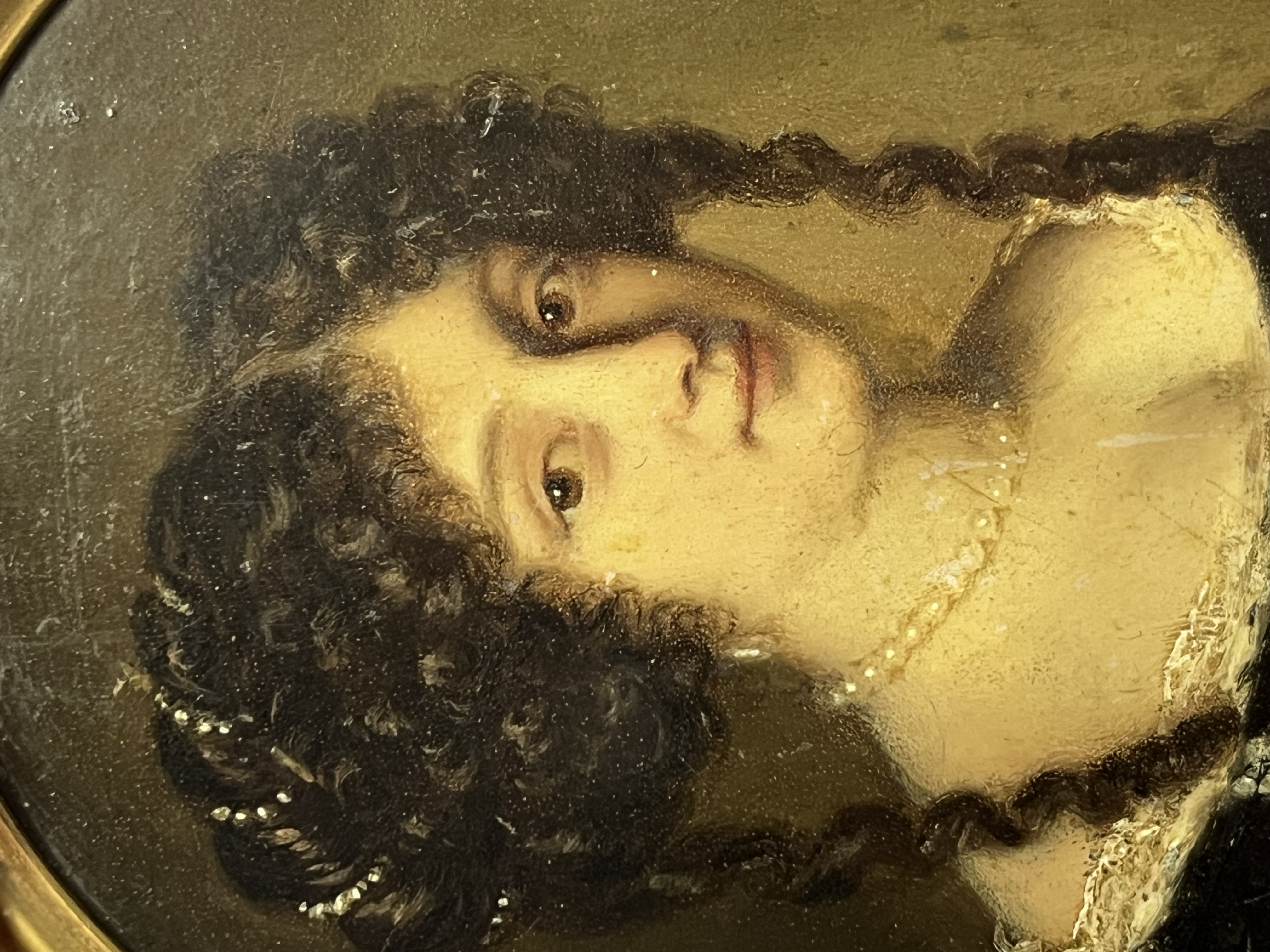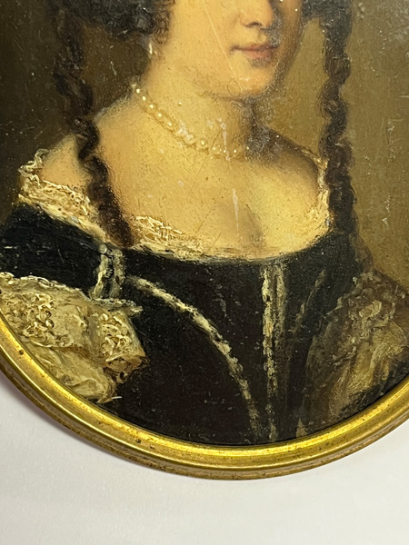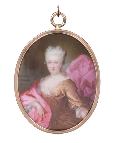 Porträt einer Dame. Bunt gemalt in Puderfarben und aquarelliert auf Elfenbeinplatte, mit Passepartout hi./Gl. in aufwendigem 18 kt Gelbgoldrahmen mit Perlfriesrelief. Provenienz: Sotheby's, Zürich 6. Mai 1980. Elfenbein-Gutachten und EU-Verkaufsgenehmigung liegen vor und können für EUR 150,00 erworben werden.