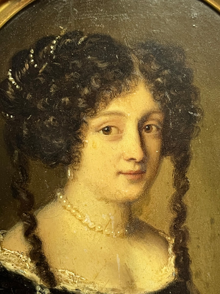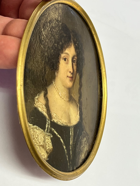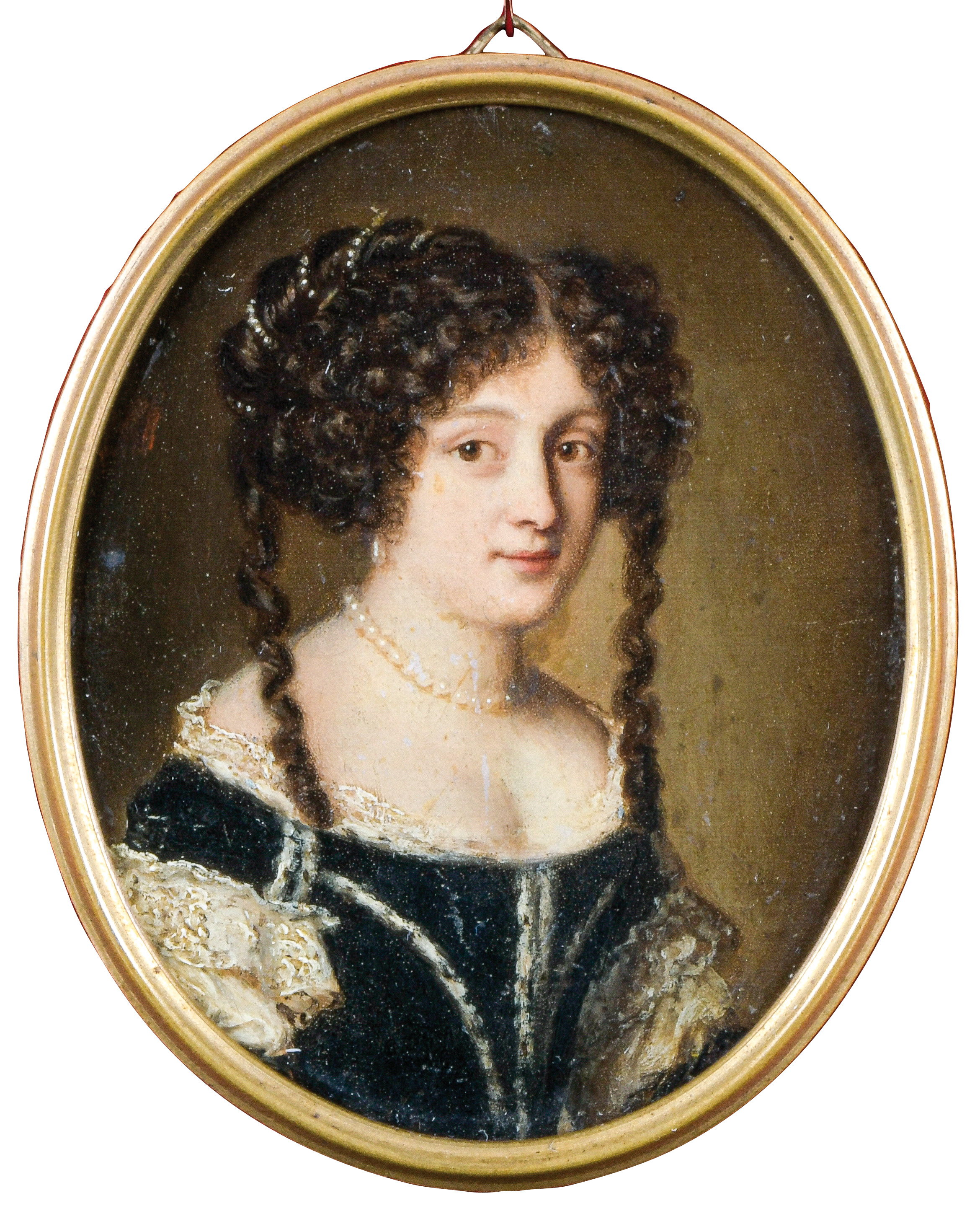 Porträt einer Dame. Bunt gemalt in Ölfarben auf Kupferplatte, re./o./sign., in schlicht profiliertem Messingrahmen. Provenienz: Antiquitäten Karl-Friedrich Schulz, Mannheim 1980.