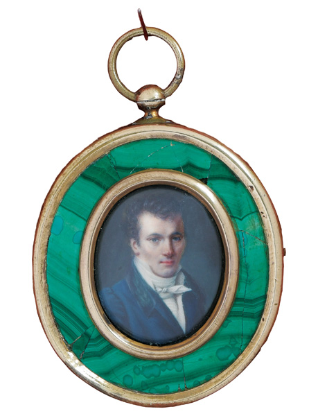 Porträt eines Herren. Bunt gemalt in Puderfarben und aquarelliert auf Elfenbeinplatte, hi./Gl. in breitem Messingrahmen mit Malachitintarsien. Provenienz: Christie's, London 27. Nov. 1979. Elfenbein-Gutachten und EU-Verkaufsgenehmigung liegen vor und können für EUR 150,00 erworben werden.