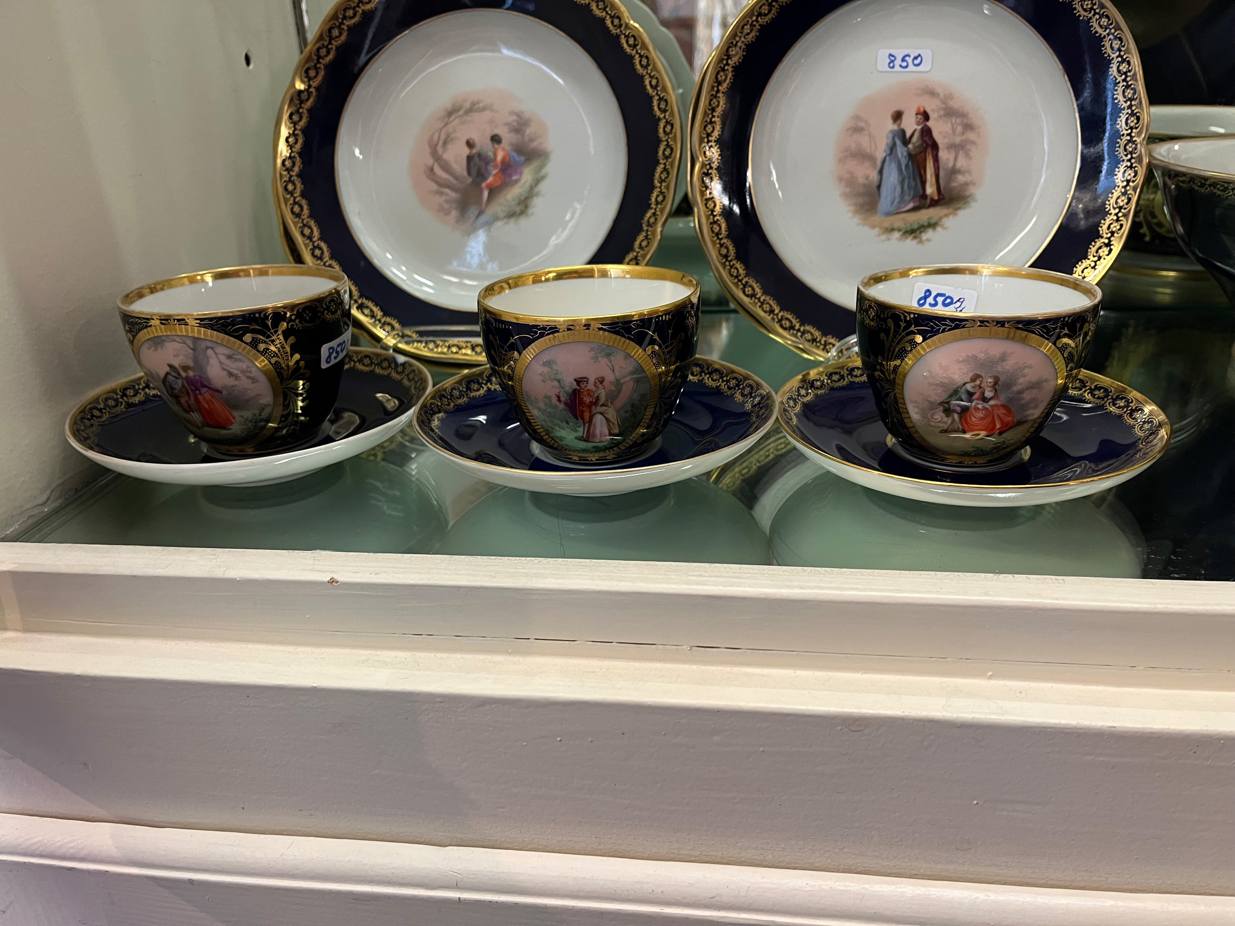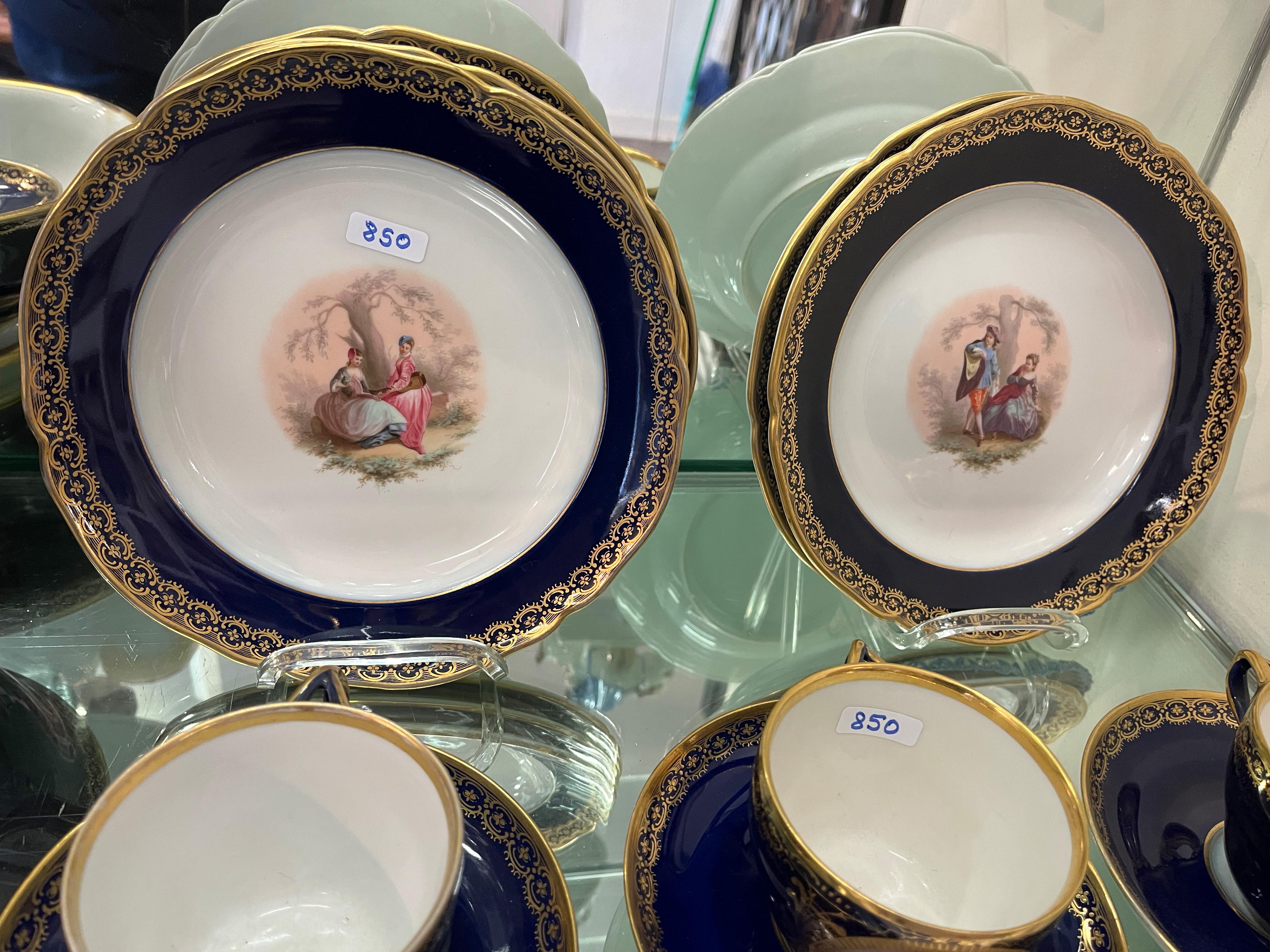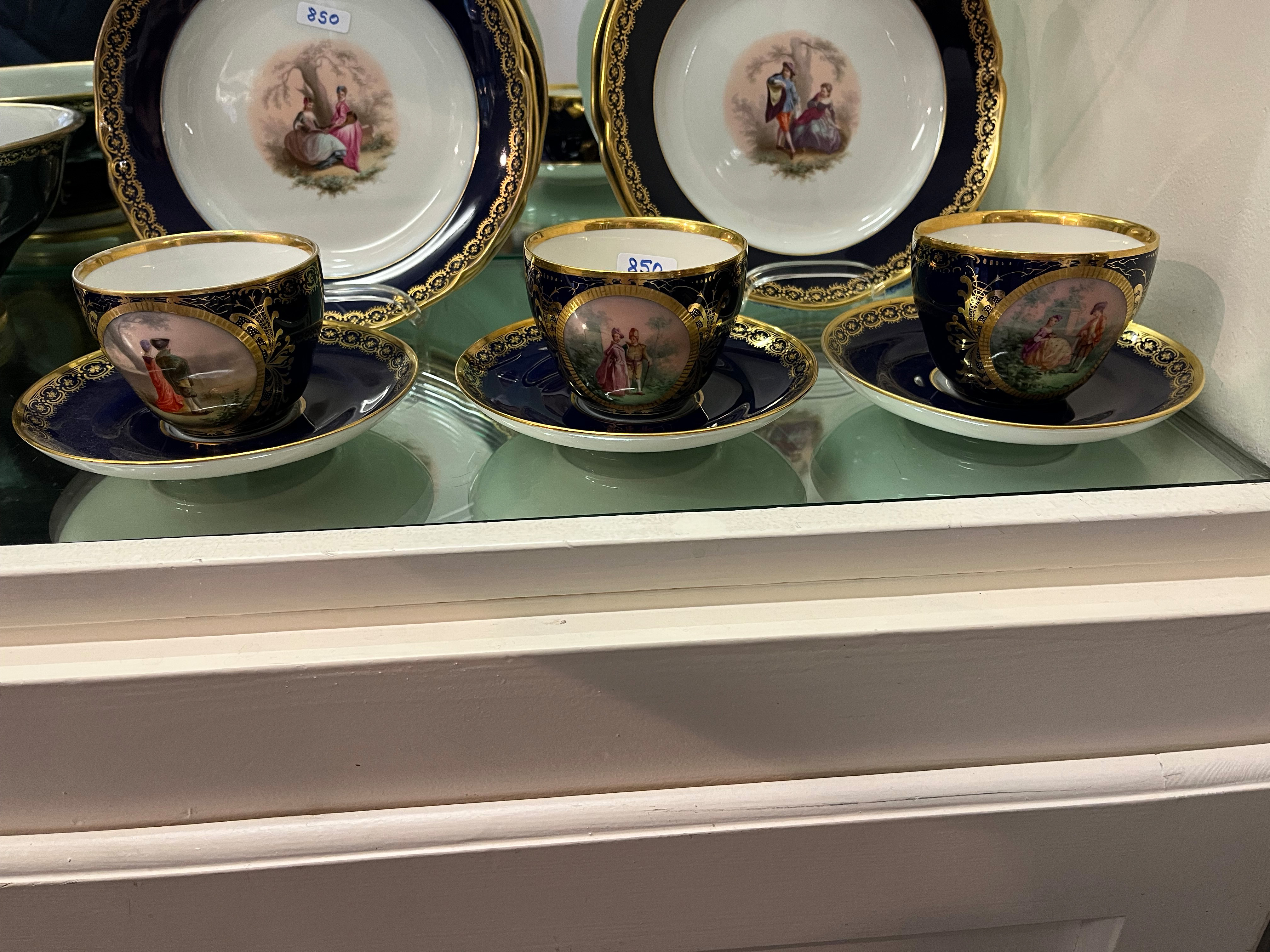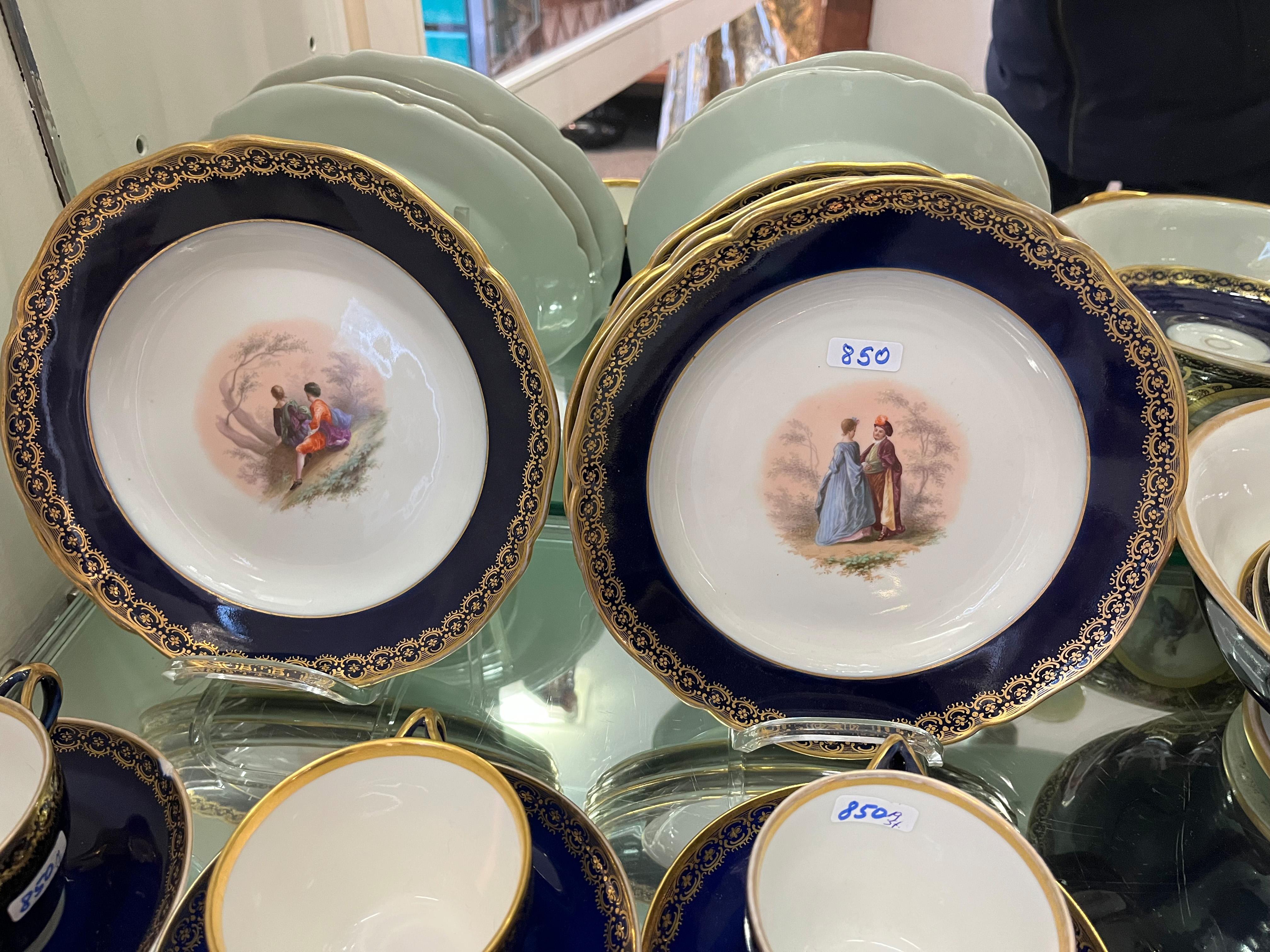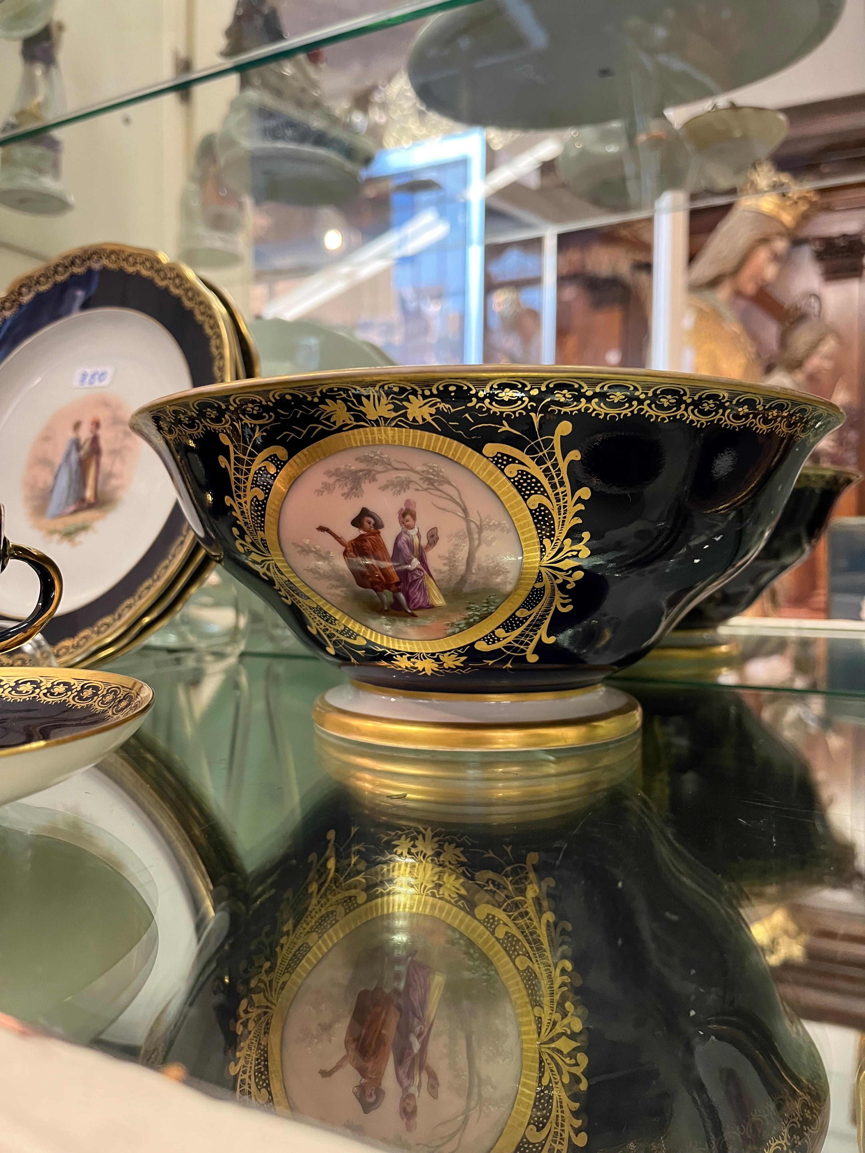 - Katalog-Nr: 850Bedeutendes 22-tlgs. Teilservice. Berlin um 1900. Porzellan, mit kobaltblauem Fond, Goldspitzenbordüren und -kartuschen. Reserven exzellent bunt bemalt mit Komödienszenerien in Landschaft; am Boden unterglasurblaue Szeptermarke mit braunem KPM und Reichsapfel. Bestehend aus: Elf Teller (D=je 21 cm), eine runde Kumme (H=10 cm, D=23 cm) und sieben Tassen mit zehn Unterschalen.o.L.