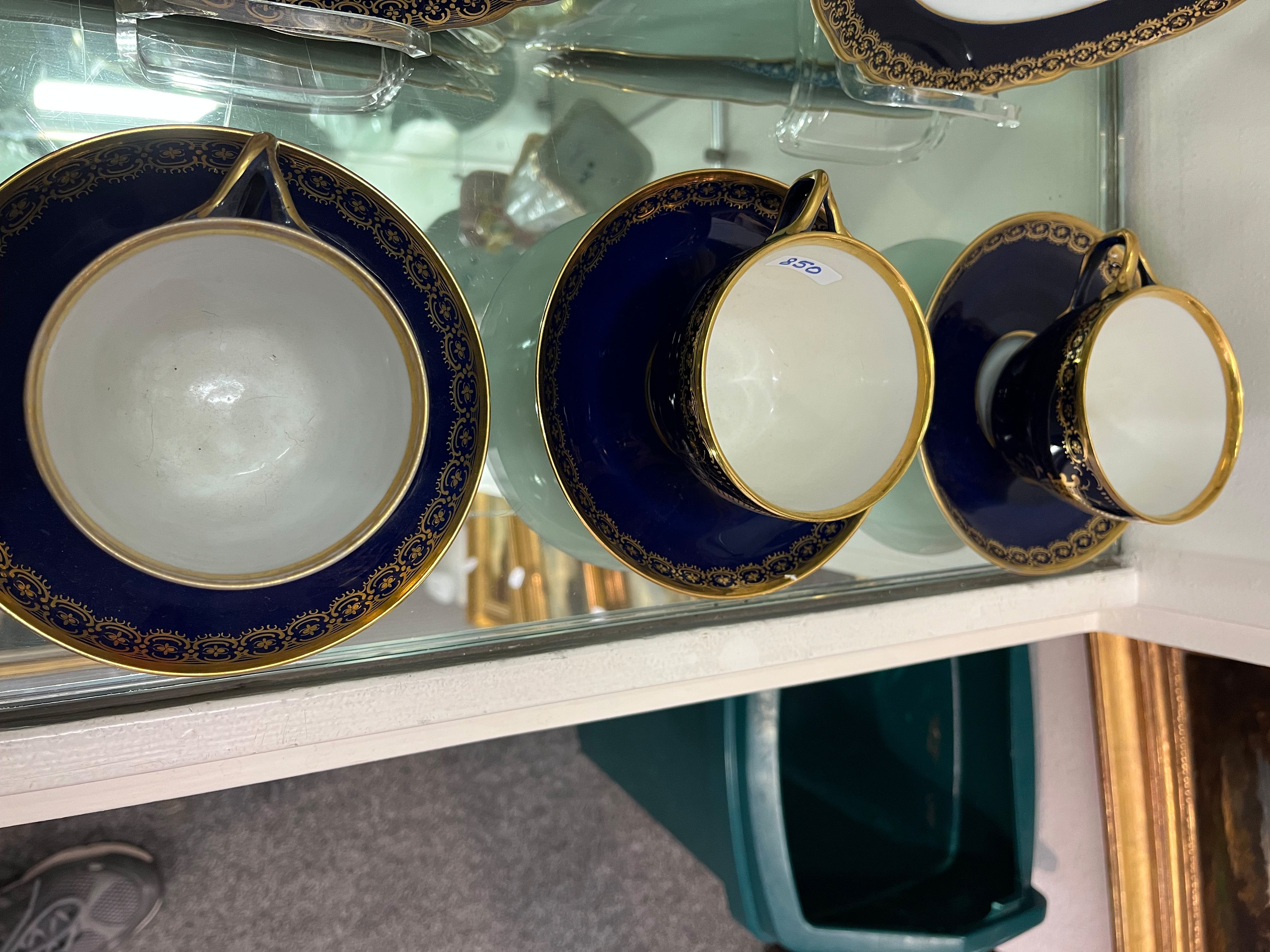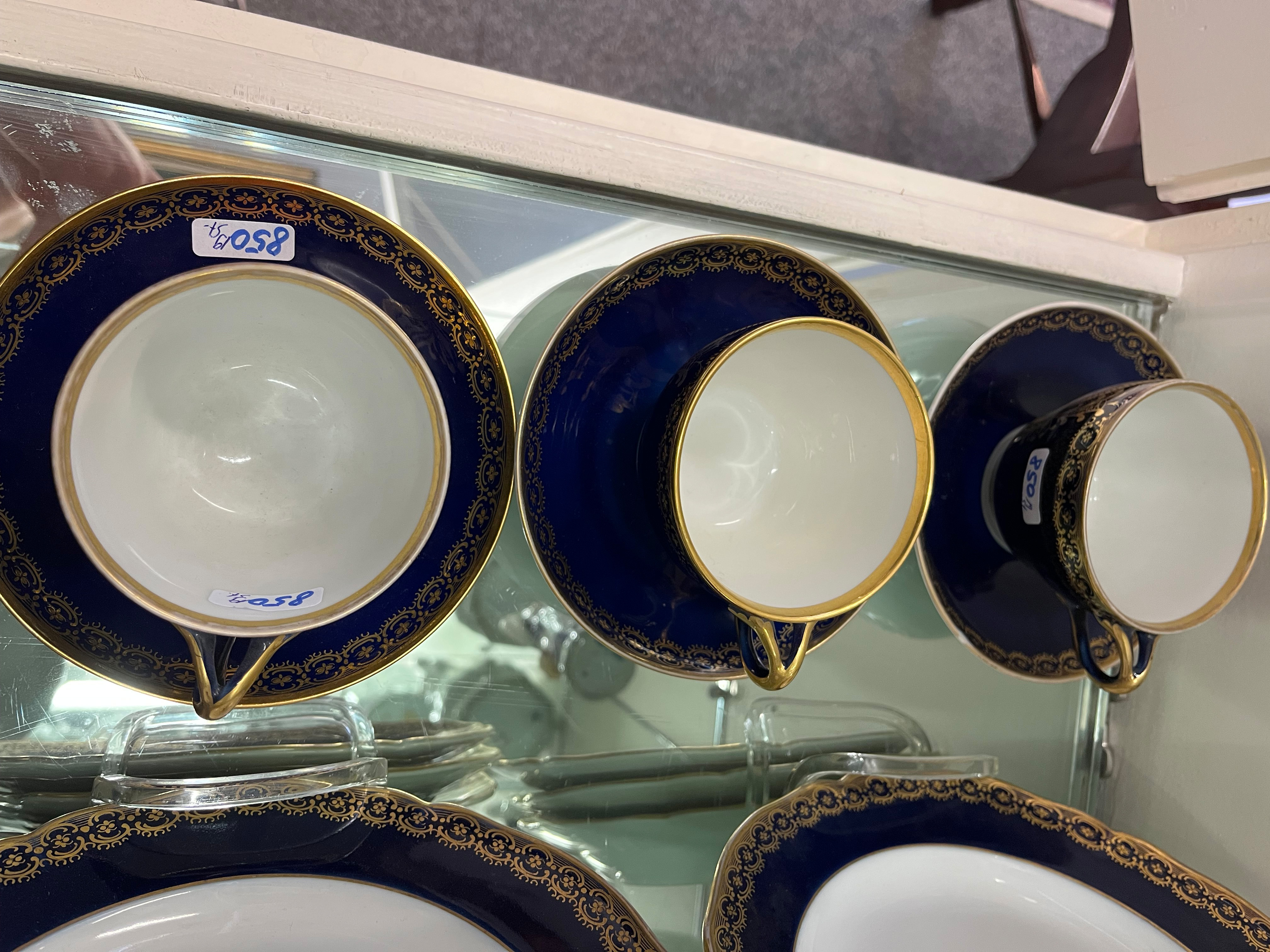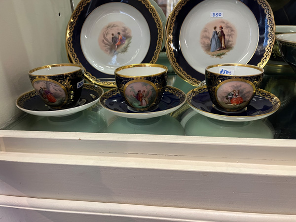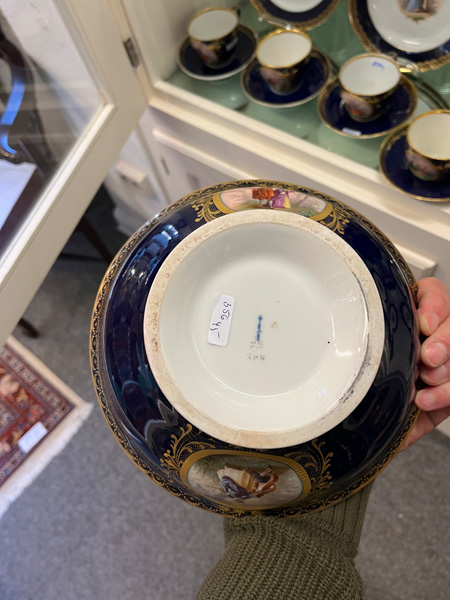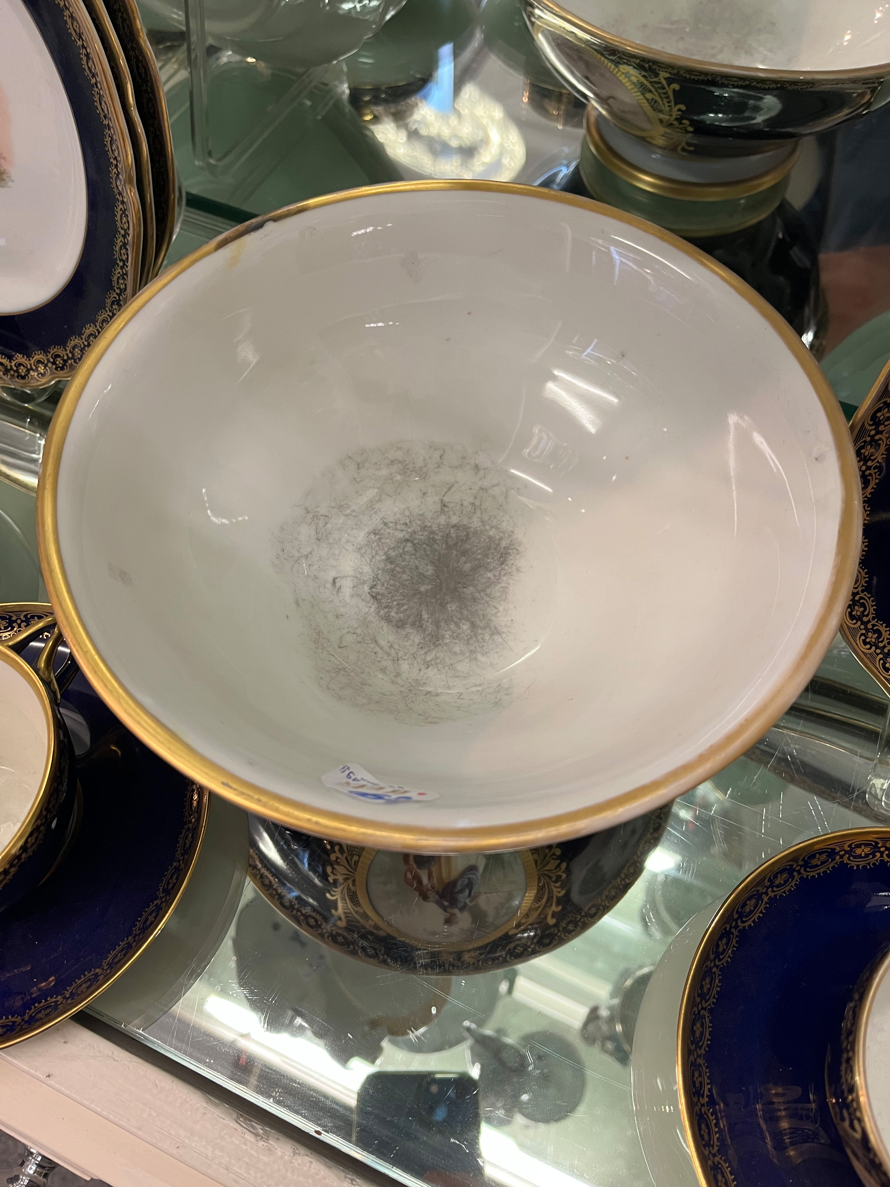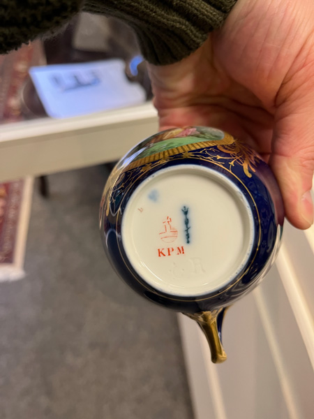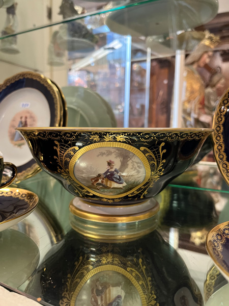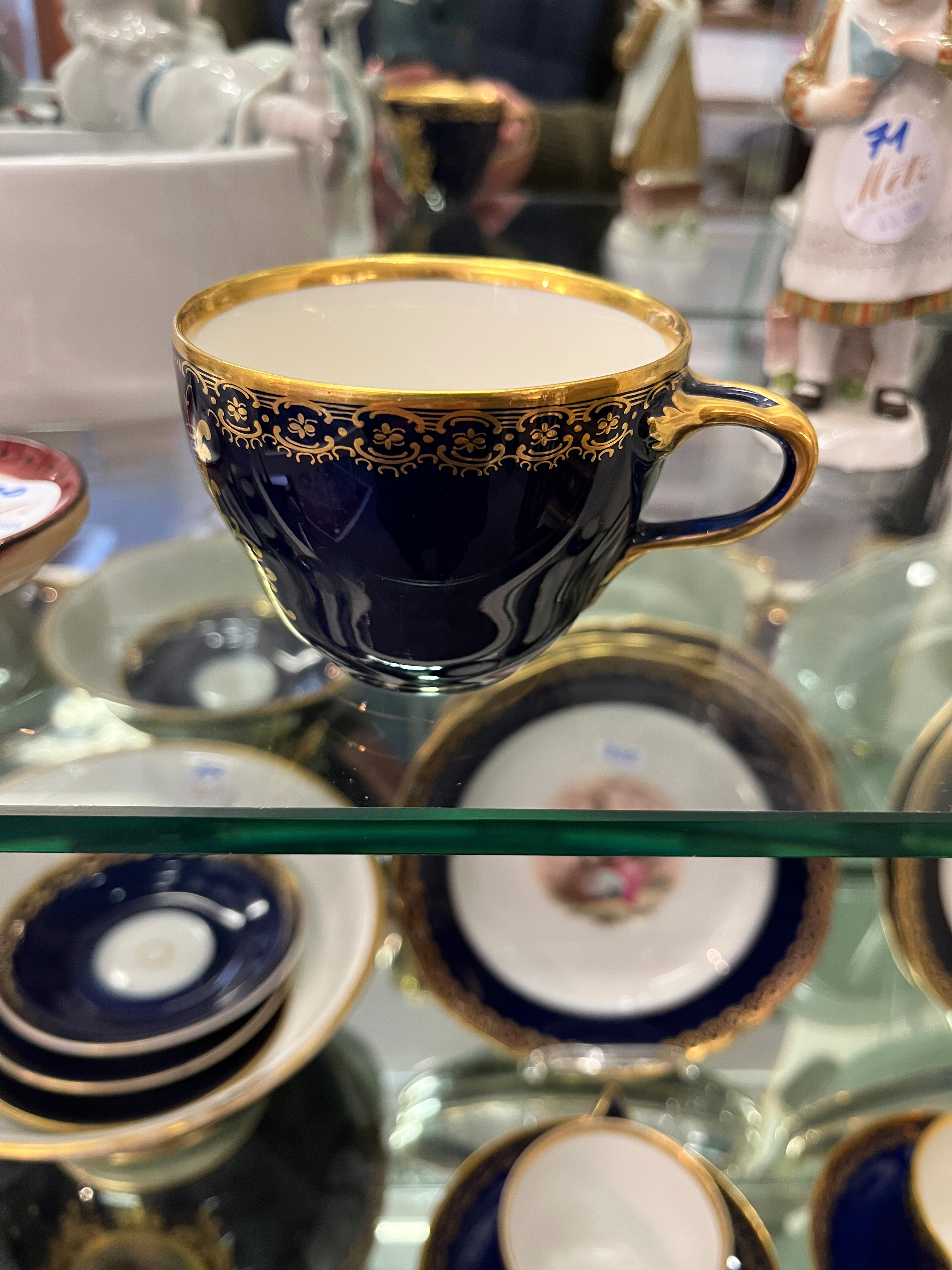 - Katalog-Nr: 850Bedeutendes 22-tlgs. Teilservice. Berlin um 1900. Porzellan, mit kobaltblauem Fond, Goldspitzenbordüren und -kartuschen. Reserven exzellent bunt bemalt mit Komödienszenerien in Landschaft; am Boden unterglasurblaue Szeptermarke mit braunem KPM und Reichsapfel. Bestehend aus: Elf Teller (D=je 21 cm), eine runde Kumme (H=10 cm, D=23 cm) und sieben Tassen mit zehn Unterschalen.o.L.