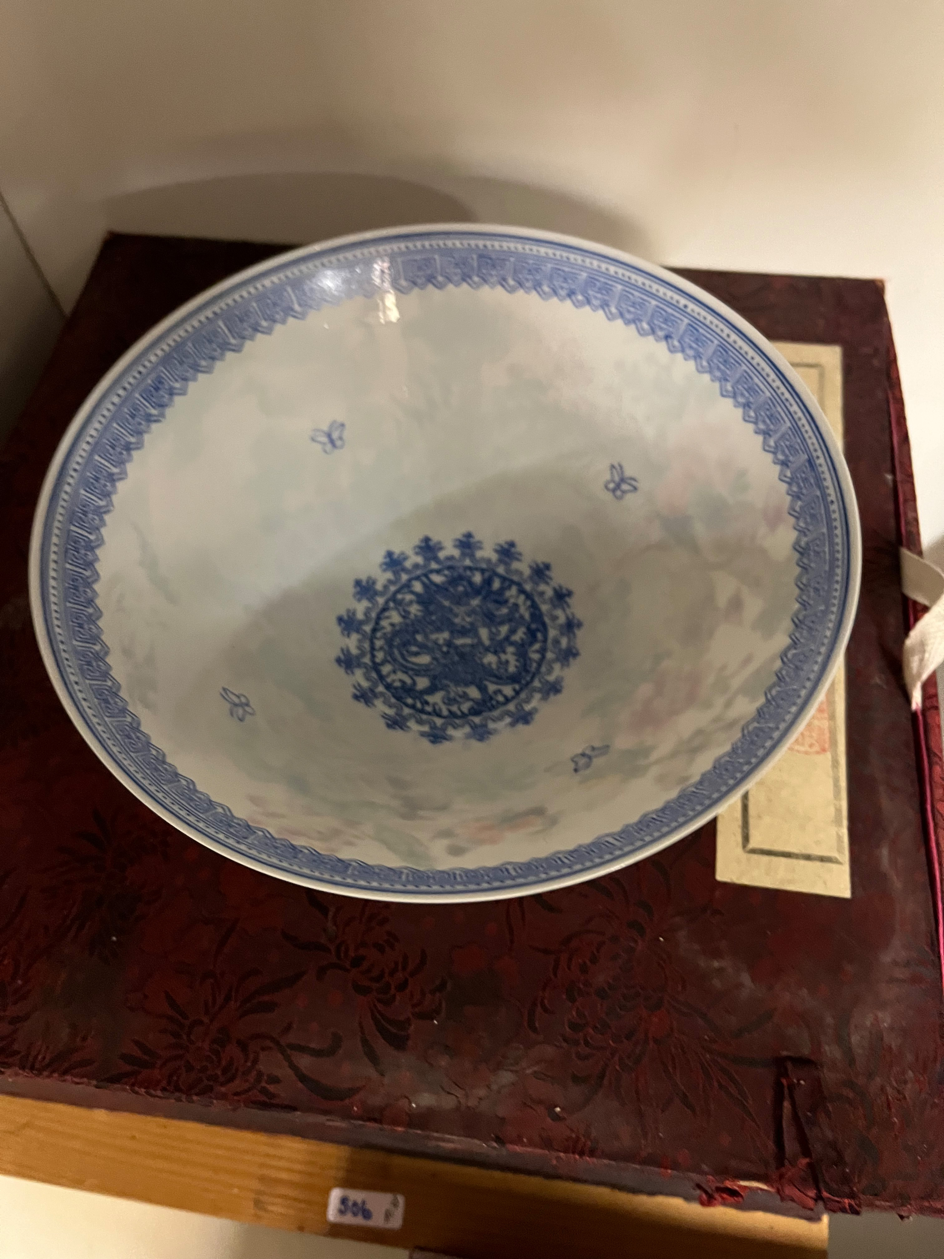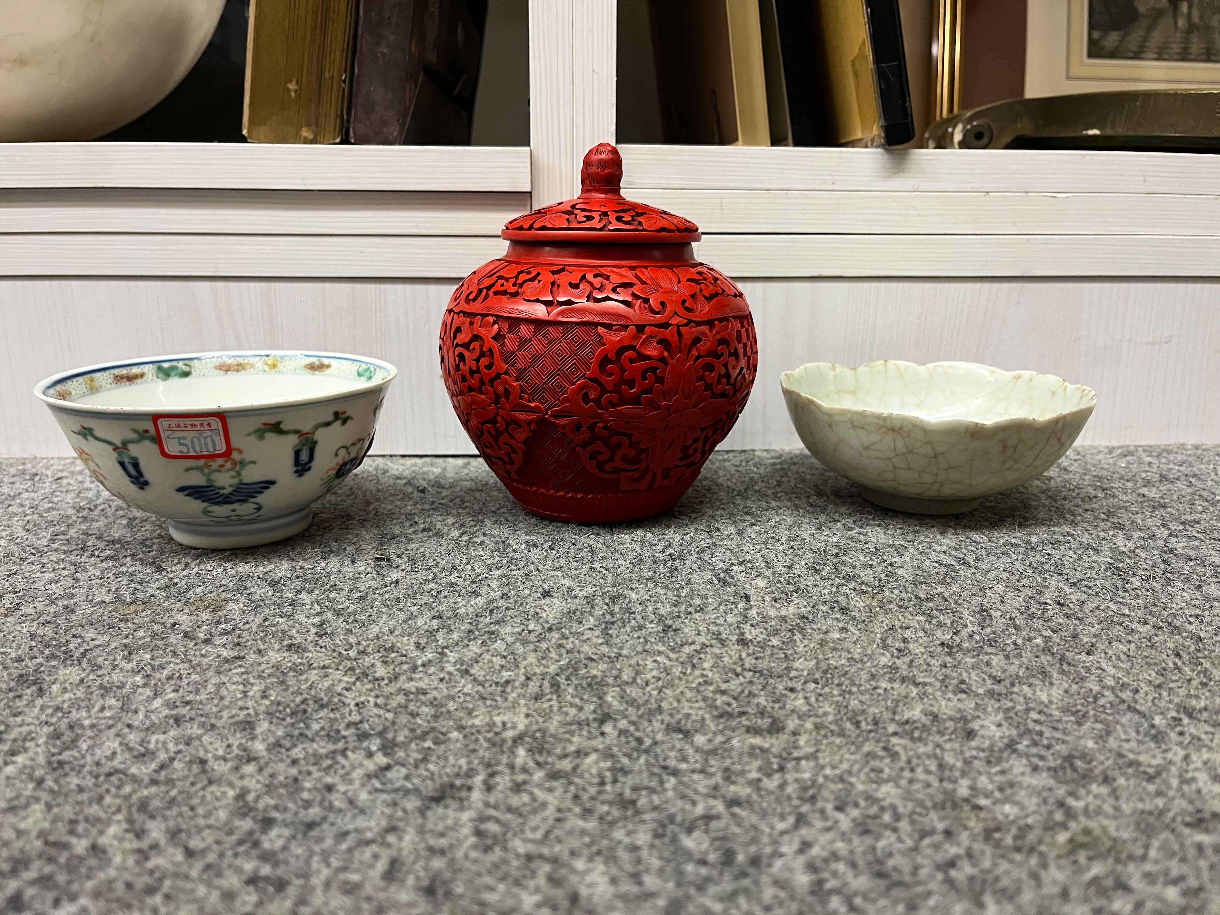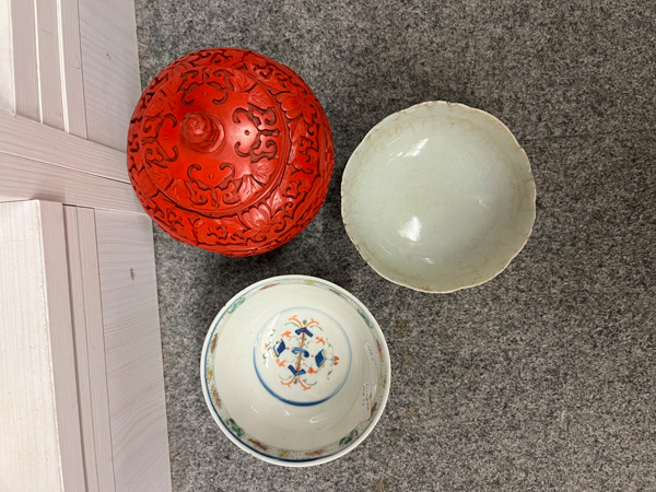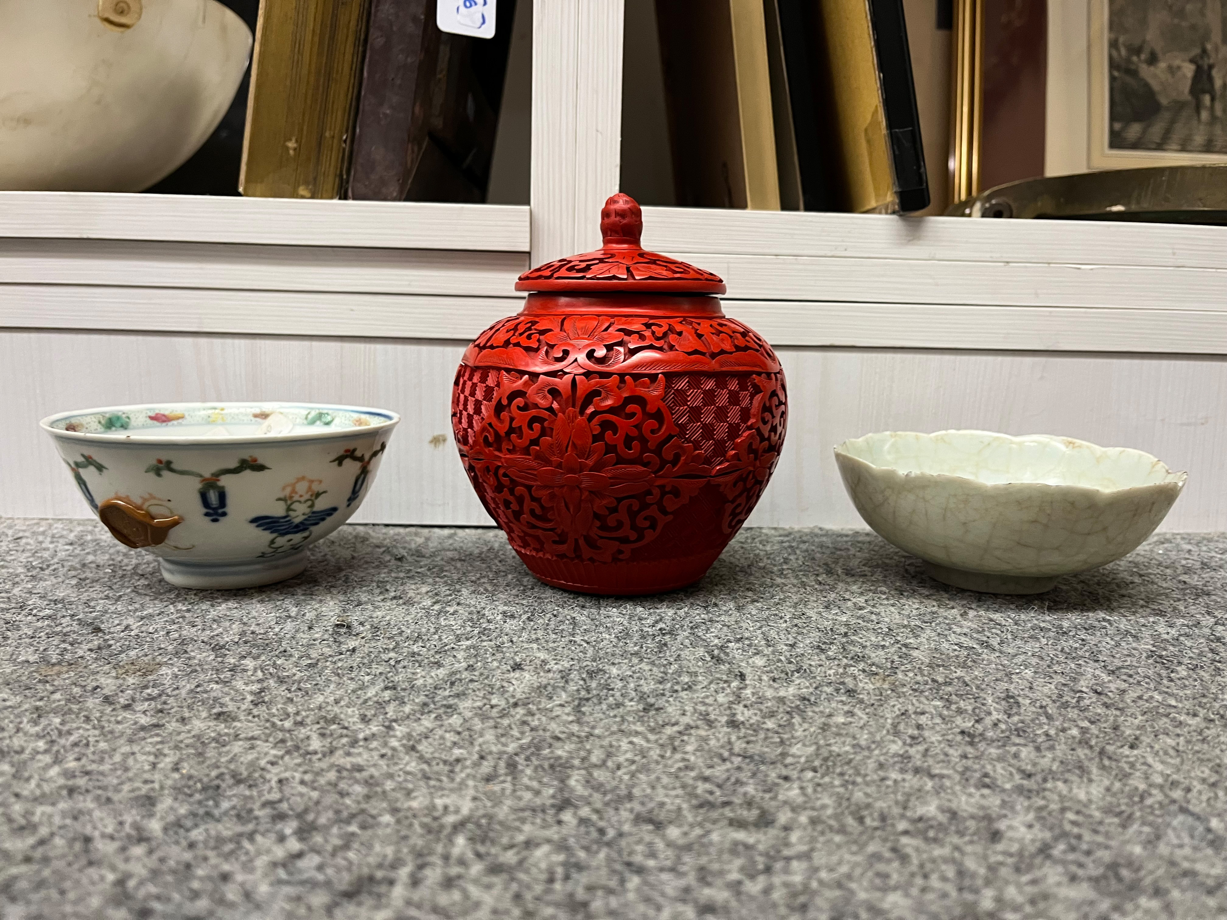 - Katalog-Nr: 506Zwölftlgs. Konvolut Asiatika: Sieben Porzellanschalen, bunt bemalt (H=4,5 bis 11 cm, D=11,5 bis 28 cm) im Etui, zwei Miniatur-Vasen (H=5 / 6 cm), eine Rotlack-Deckeldose (H=13 cm, D=11 cm), ein Teller (D=30 cm) und eine Vase (H=28 cm). (besch.)o.L.