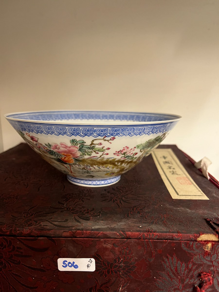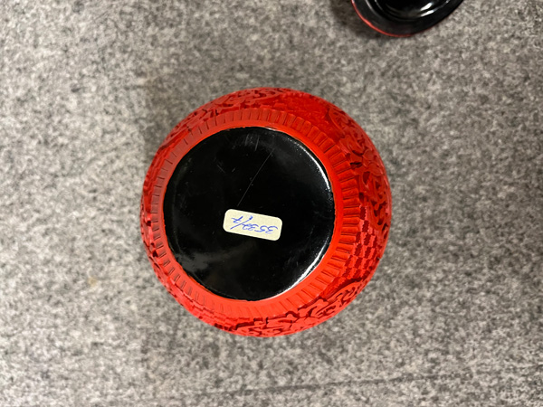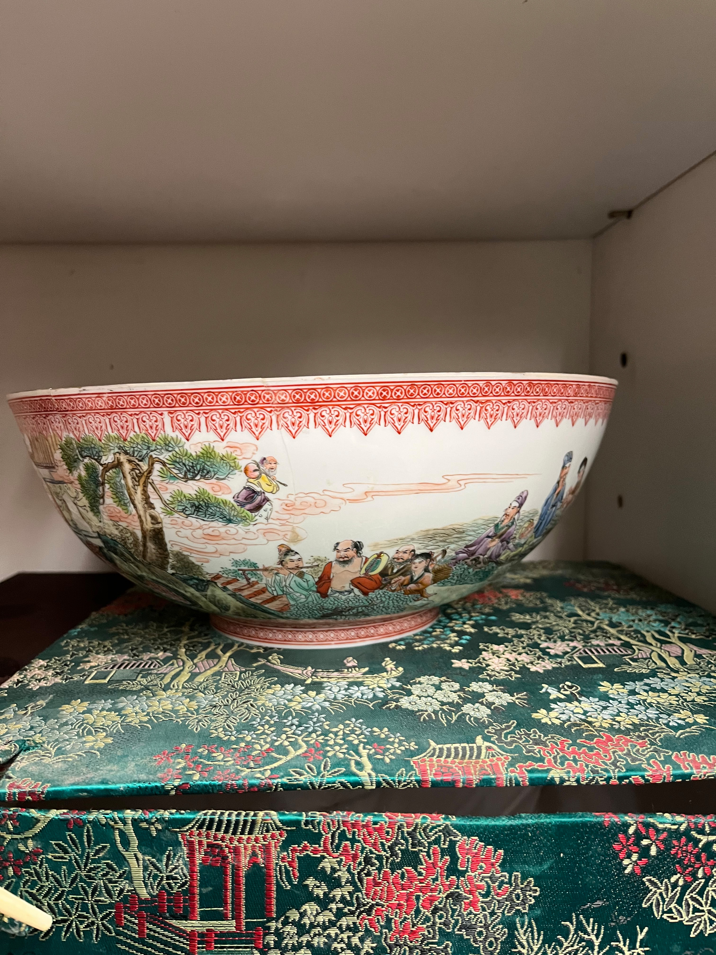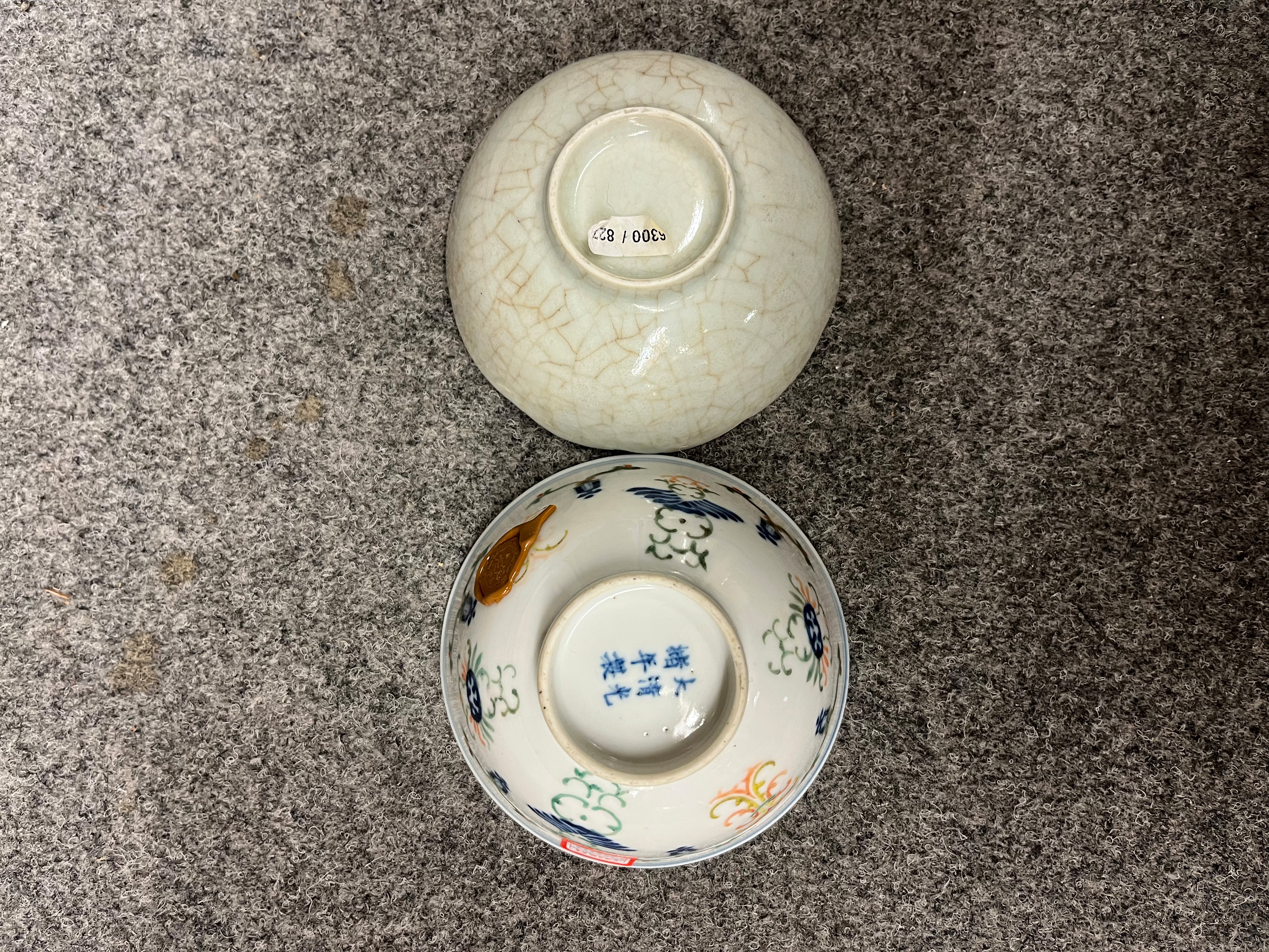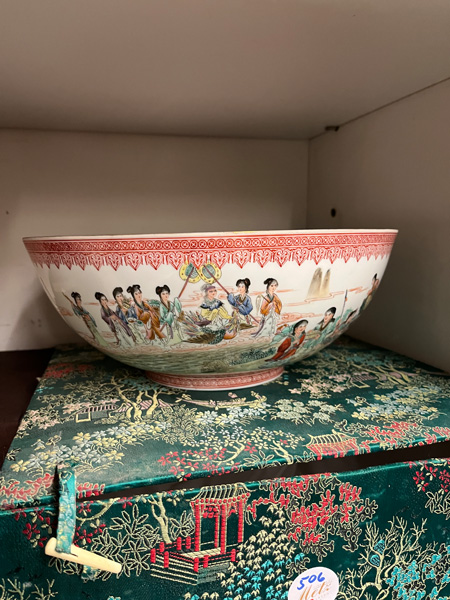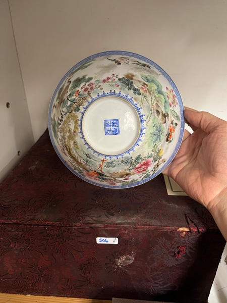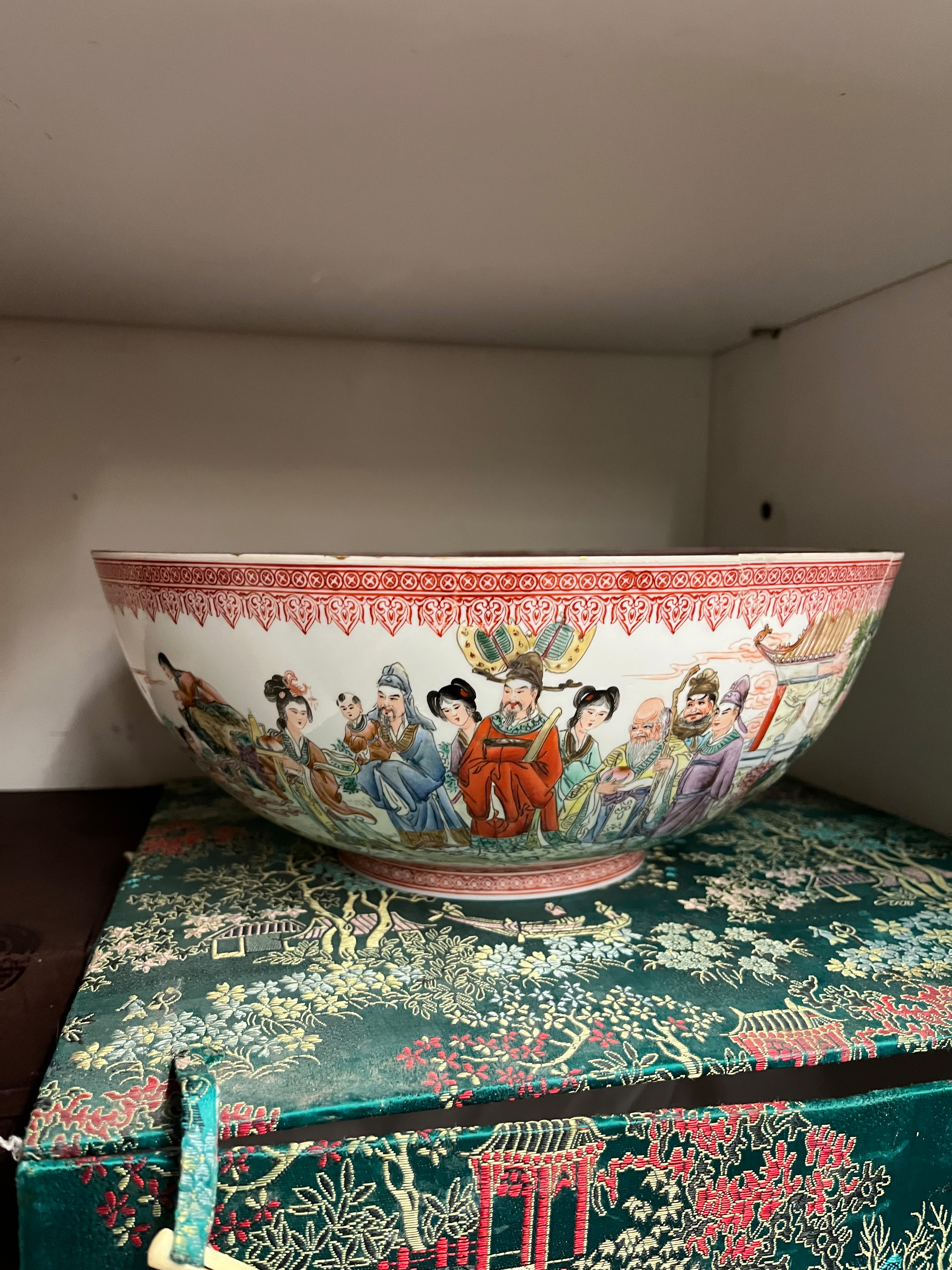 - Katalog-Nr: 506Zwölftlgs. Konvolut Asiatika: Sieben Porzellanschalen, bunt bemalt (H=4,5 bis 11 cm, D=11,5 bis 28 cm) im Etui, zwei Miniatur-Vasen (H=5 / 6 cm), eine Rotlack-Deckeldose (H=13 cm, D=11 cm), ein Teller (D=30 cm) und eine Vase (H=28 cm). (besch.)o.L.