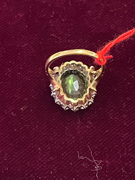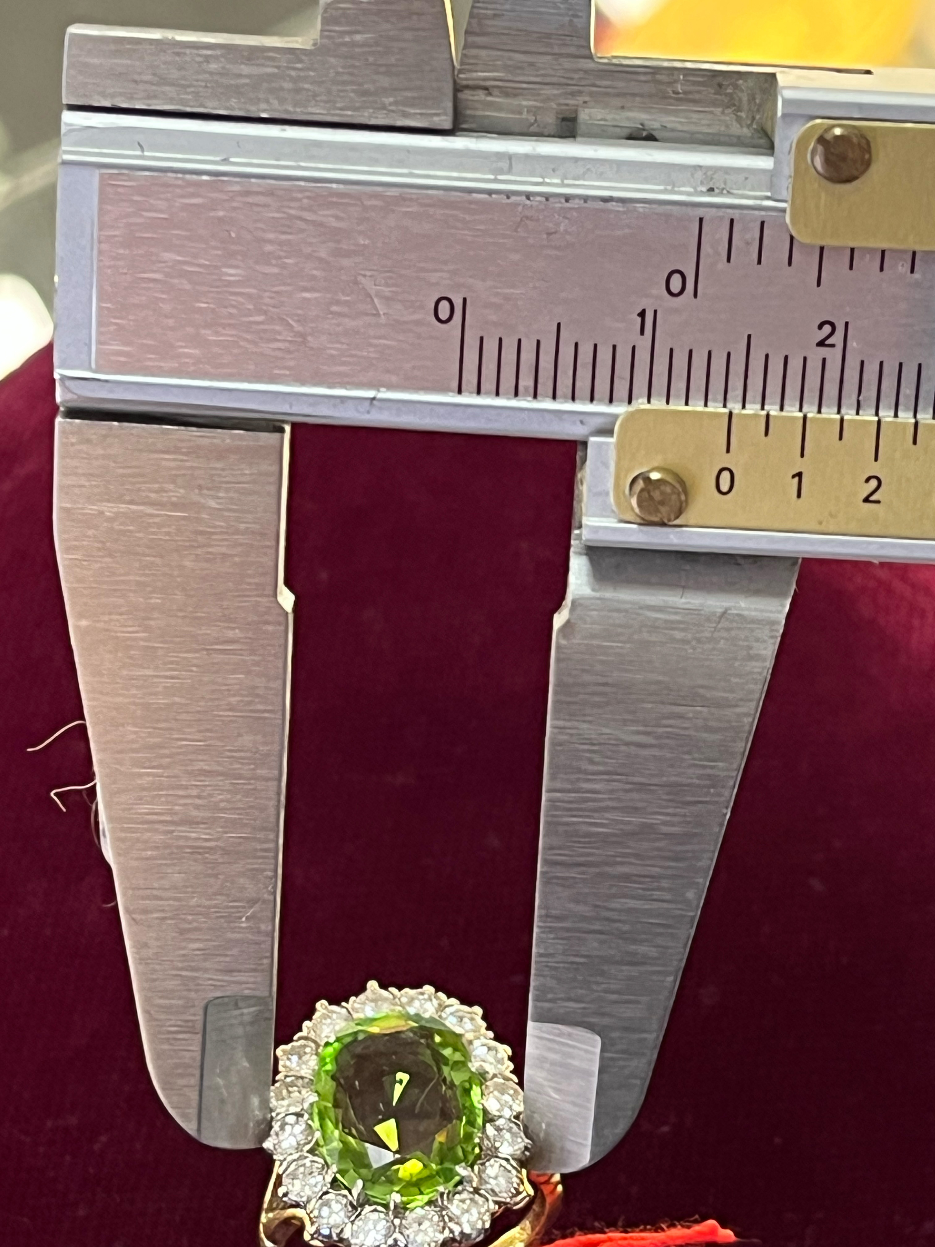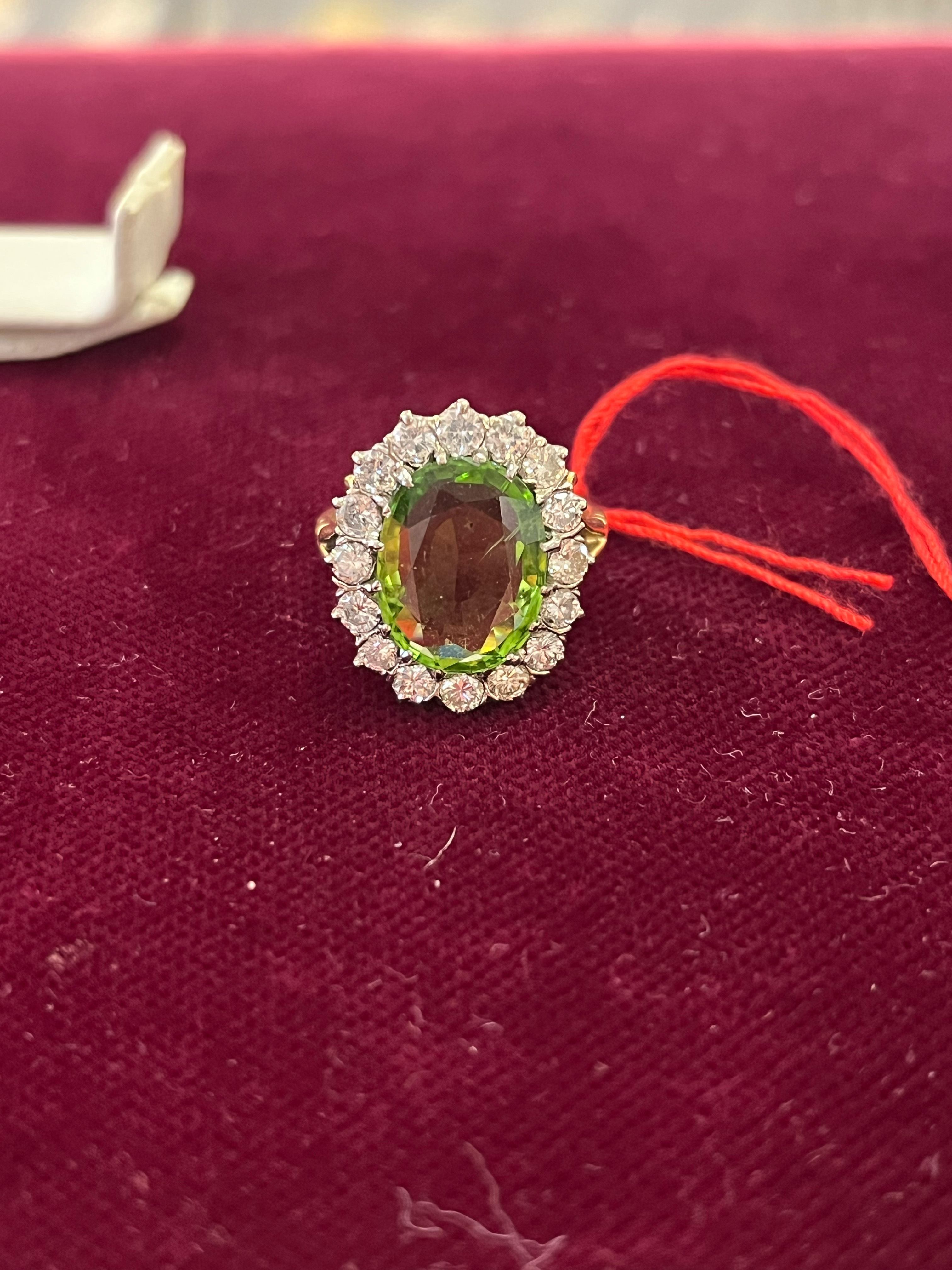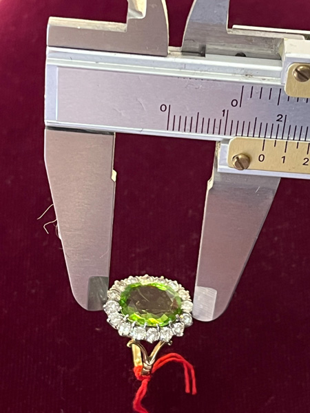 - Katalog-Nr: 1484Damenring. 18 kt Gold, besetzt mit Peridot und 16 Brillanten, ca. 0,90 ct, Gesamtgewicht ca. 5,5 g, Ringgröße 50. Die Begutachtungen der verarbeiteten Edelsteine und Diamanten wurden im gefassten Zustand vorgenommen, d.h. unter Vorbehalt einer sachgerechten Graduierung, die nur an ungefassten Steinen erfolgen kann. Dies hat zur Folge, dass die Gewichte (sog. "berechnete Gewichte", d.h. ca.+/- 10 % Abweichung) und Qualitäten (Farbe, Reinheit und Schliff) der Steine nur annähernd angegeben werden können.o.L.