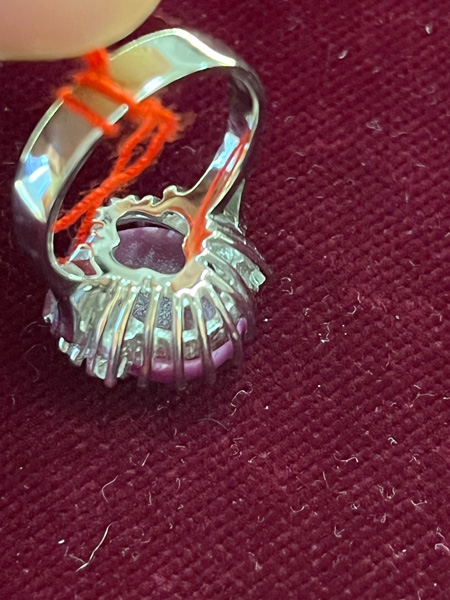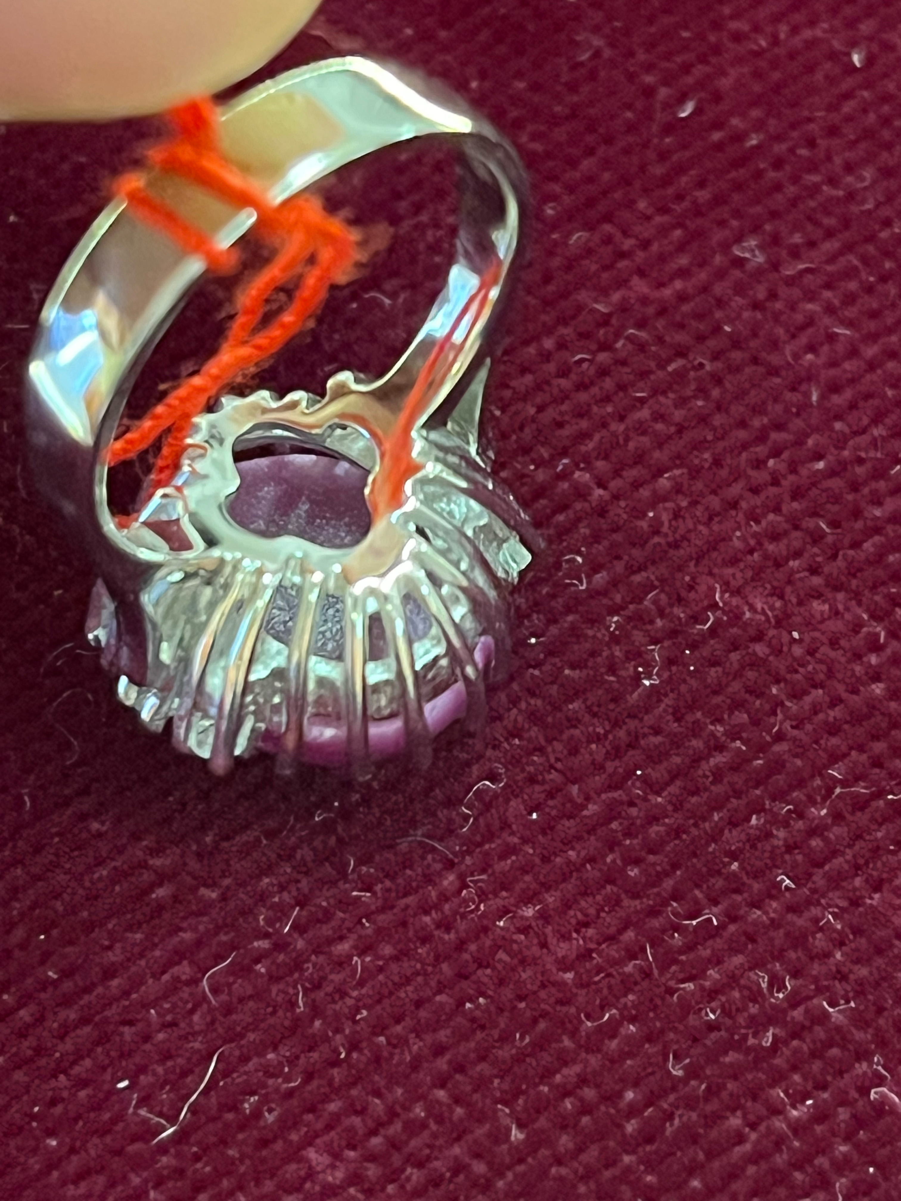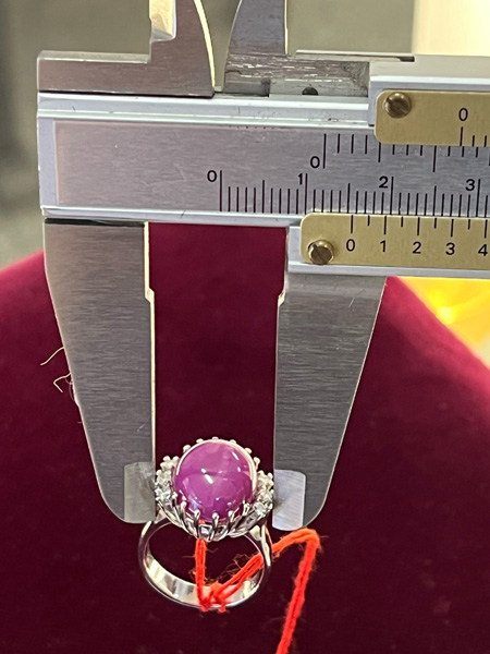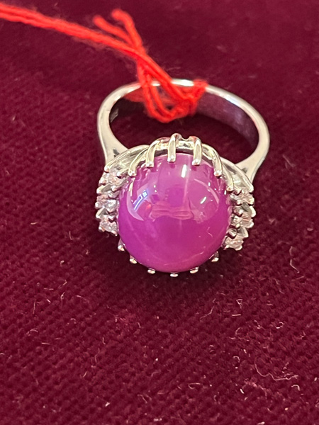 - Katalog-Nr: 1527Damenring. 14 kt Gold, besetzt mit Sternrubin und sechs Brillanten, ca. 0,15 ct, Gesamtgewicht ca. 6,4 g, Ringgröße 50. Die Begutachtungen der verarbeiteten Edelsteine und Diamanten wurden im gefassten Zustand vorgenommen, d.h. unter Vorbehalt einer sachgerechten Graduierung, die nur an ungefassten Steinen erfolgen kann. Dies hat zur Folge, dass die Gewichte (sog. "berechnete Gewichte", d.h. ca.+/- 10 % Abweichung) und Qualitäten (Farbe, Reinheit und Schliff) der Steine nur annähernd angegeben werden können.o.L.