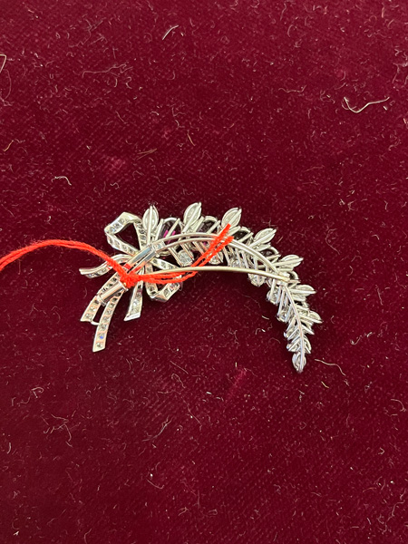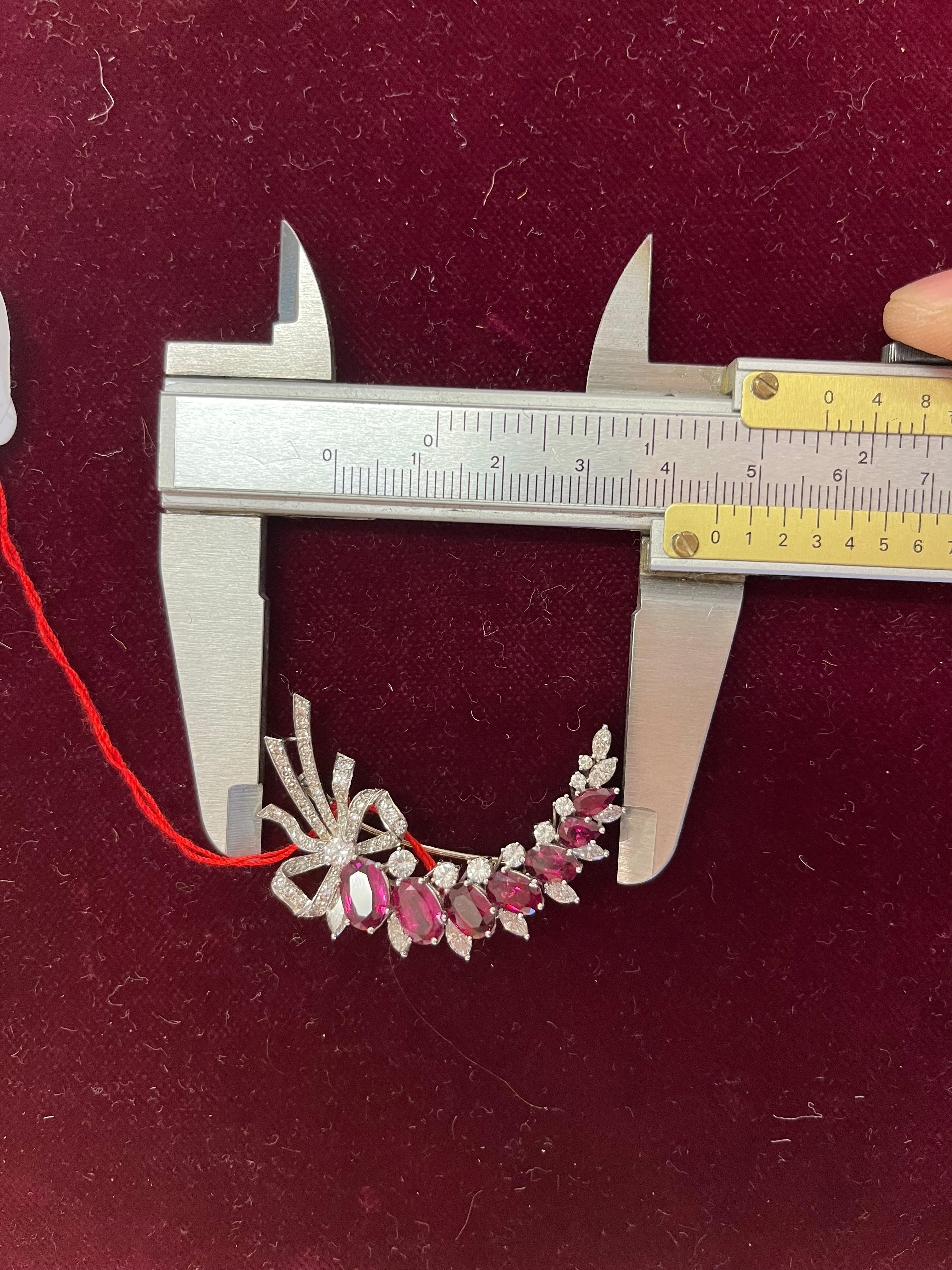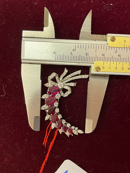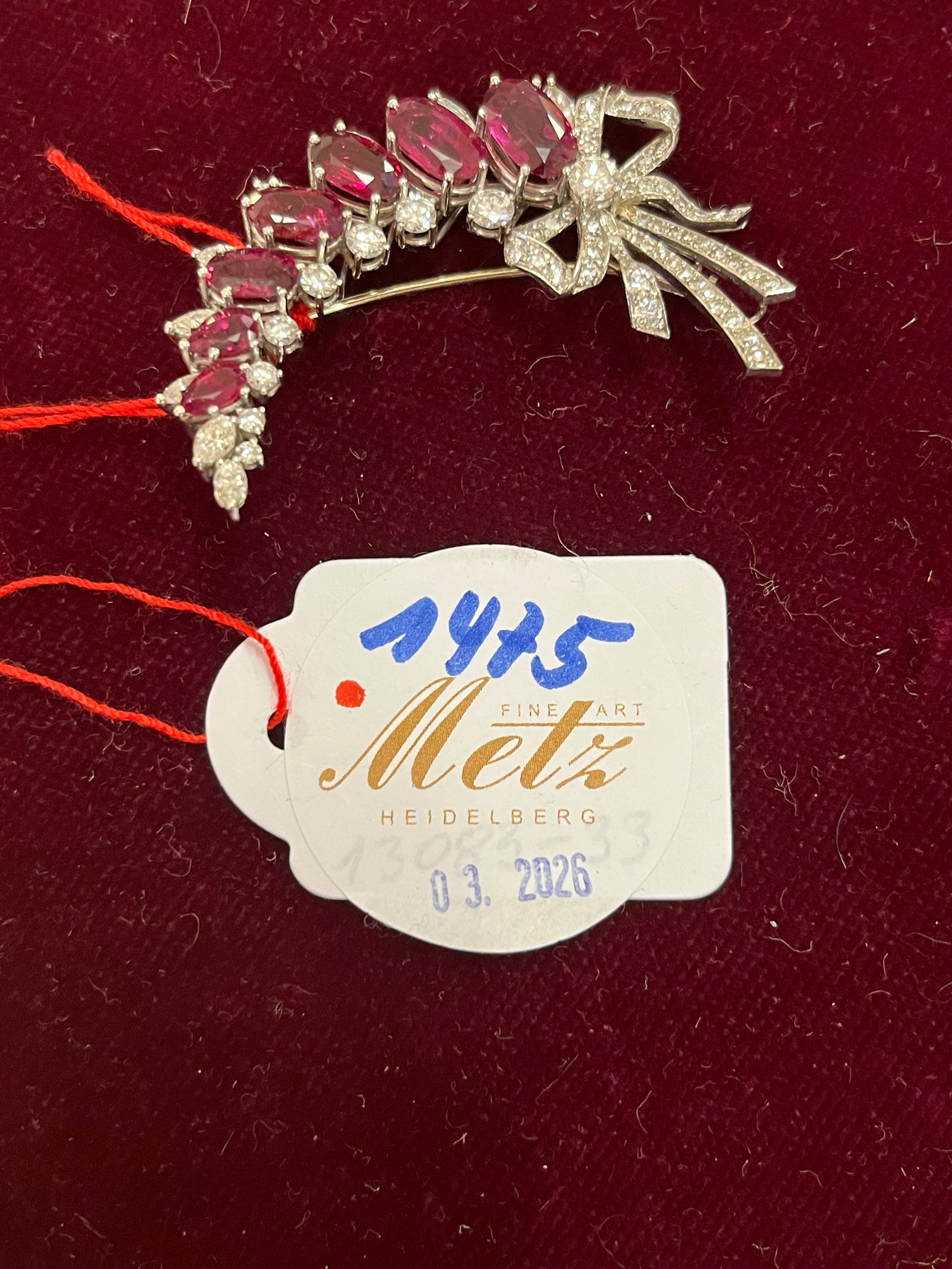 - Katalog-Nr: 1475Brosche. Platin, besetzt mit sieben Rubinen und Diamanten, ca. 1,7 ct, Gesamtgewicht ca. 12,4 g. Die Begutachtungen der verarbeiteten Edelsteine und Diamanten wurden im gefassten Zustand vorgenommen, d.h. unter Vorbehalt einer sachgerechten Graduierung, die nur an ungefassten Steinen erfolgen kann. Dies hat zur Folge, dass die Gewichte (sog. "berechnete Gewichte", d.h. ca.+/- 10 % Abweichung) und Qualitäten (Farbe, Reinheit und Schliff) der Steine nur annähernd angegeben werden können.o.L.