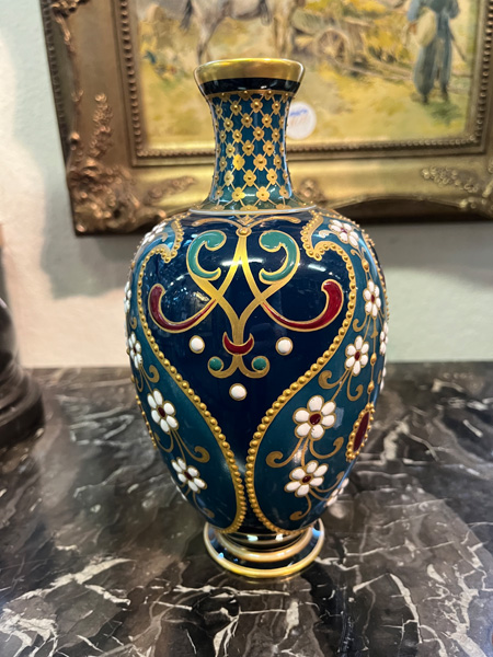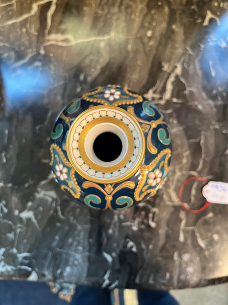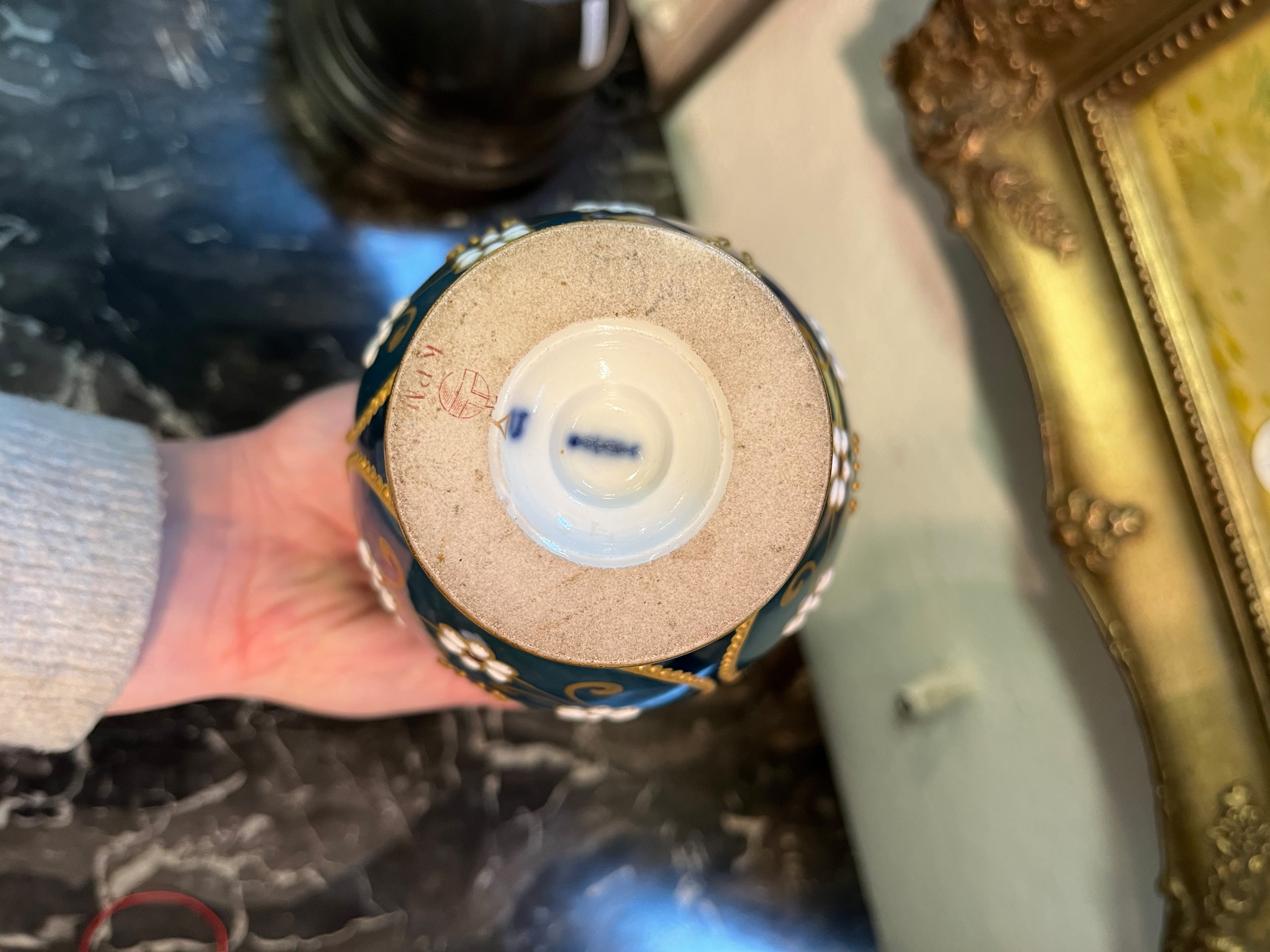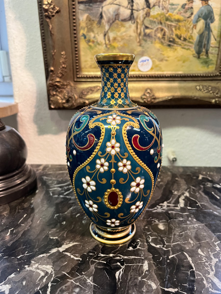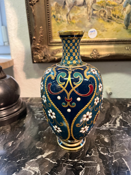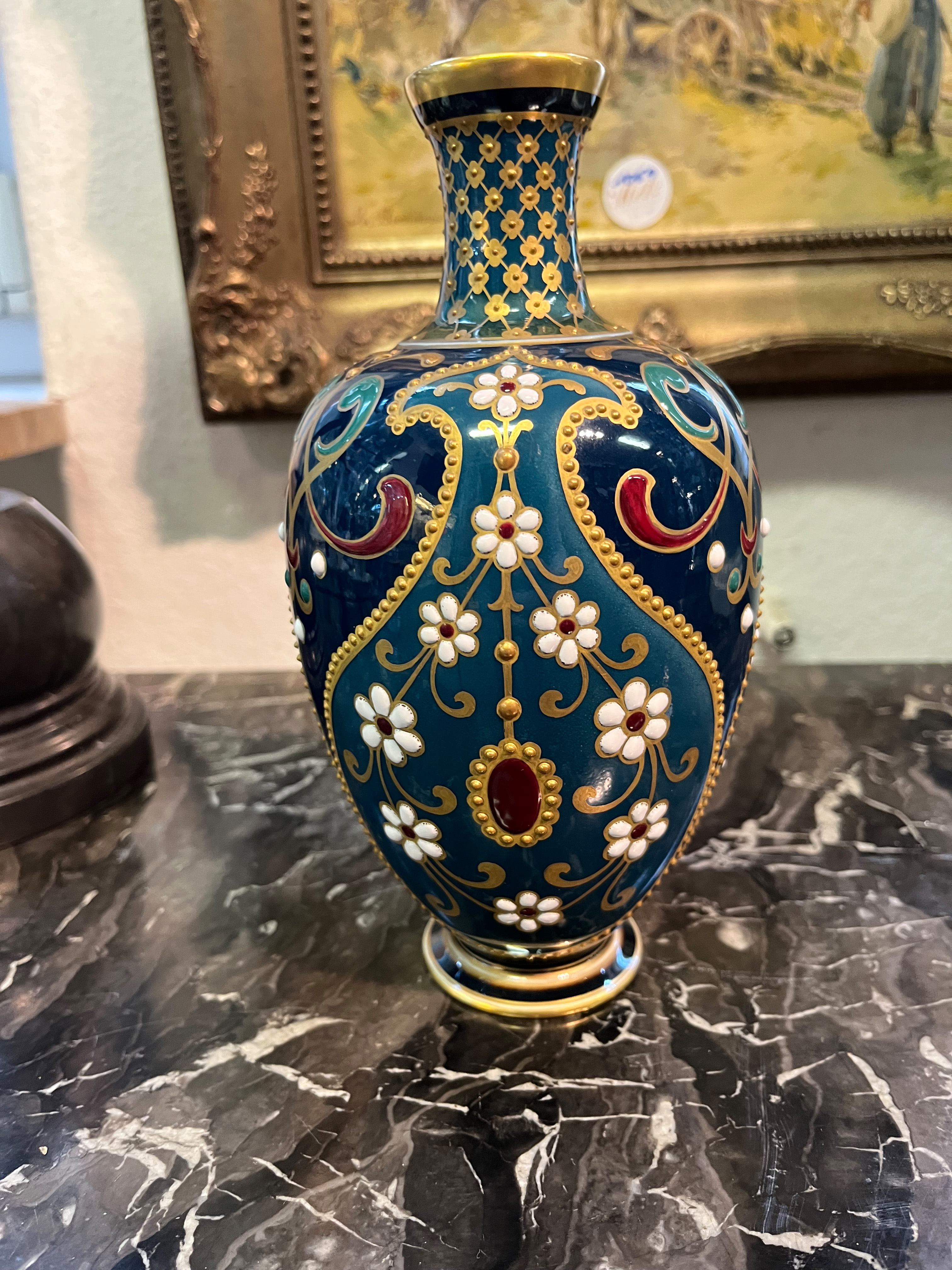 - Katalog-Nr: 1636Ausgefallene Jugendstil-Vase. Berlin um 1905. Porzellan, farbig glasiert mit aufwendiger, mehrfarbiger Emailmalerei und Reliefgold; am Boden unterglasurblaue Szeptermarke mit korallenrotem „KPM“ und Reichsapfel, H=20,8 cm.o.L.