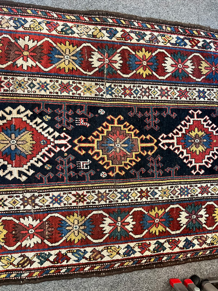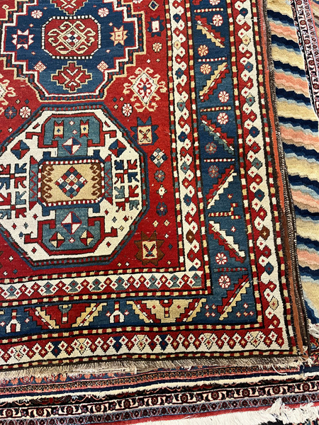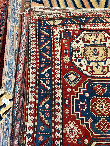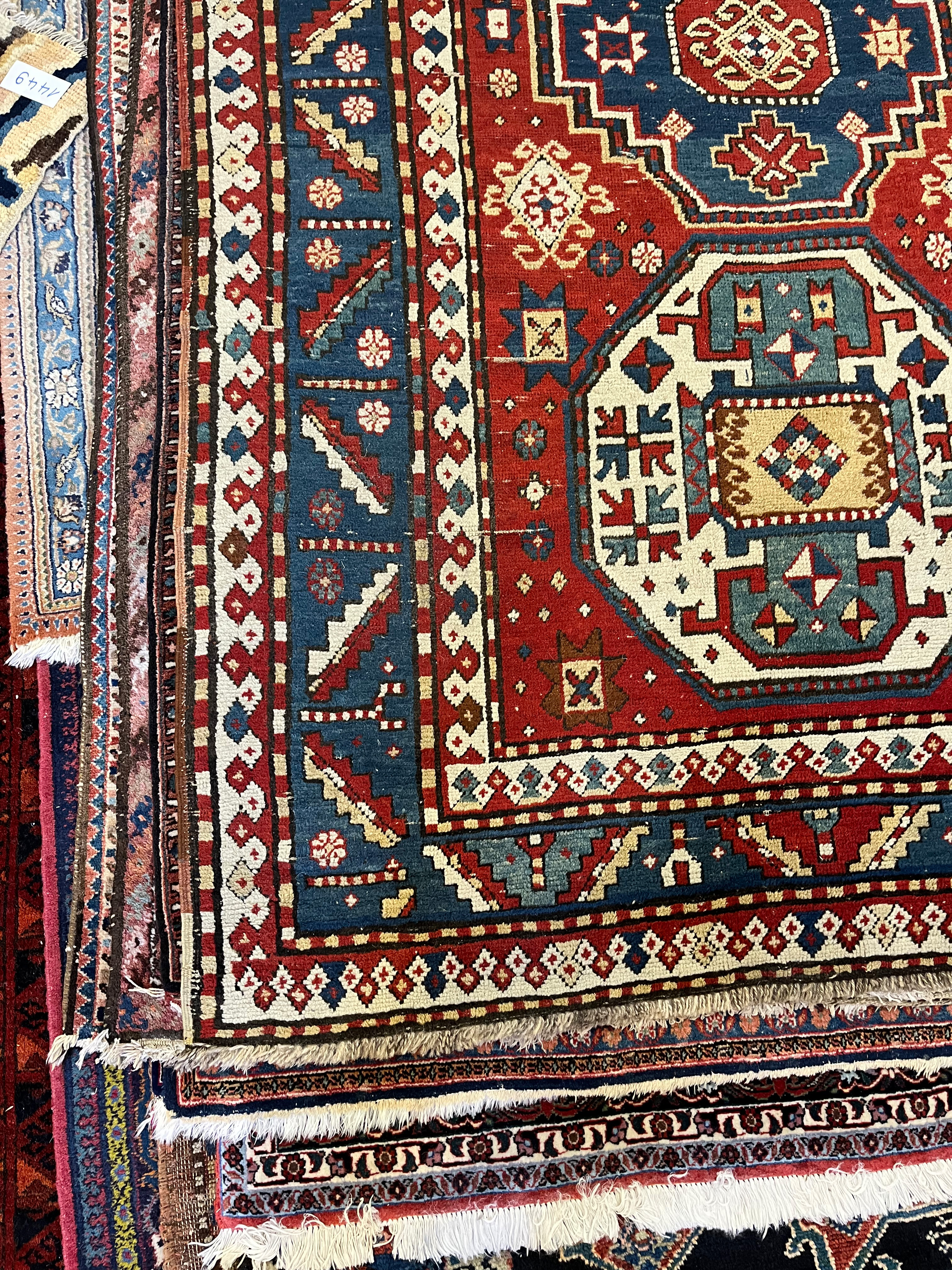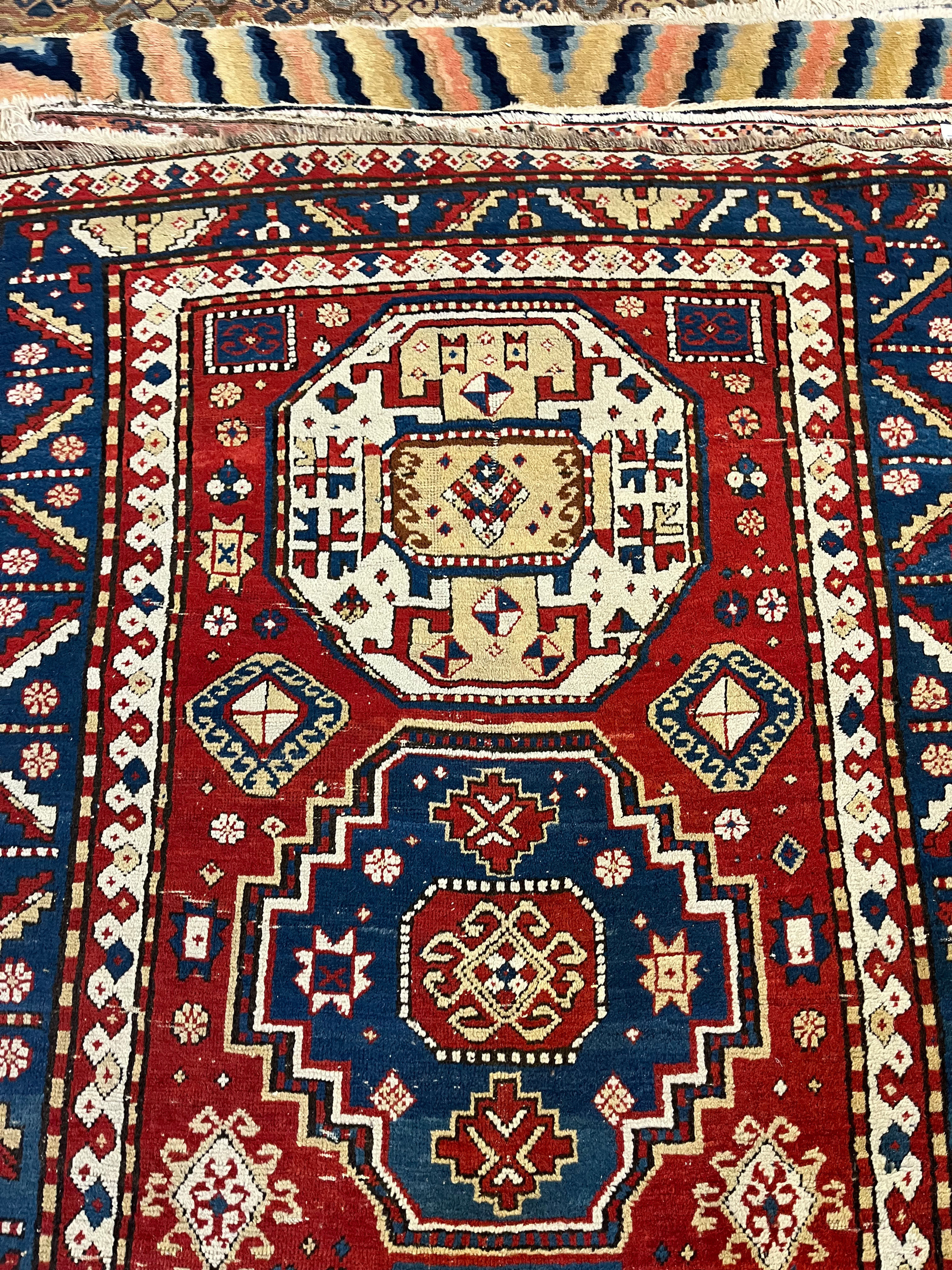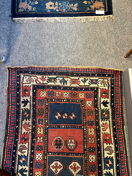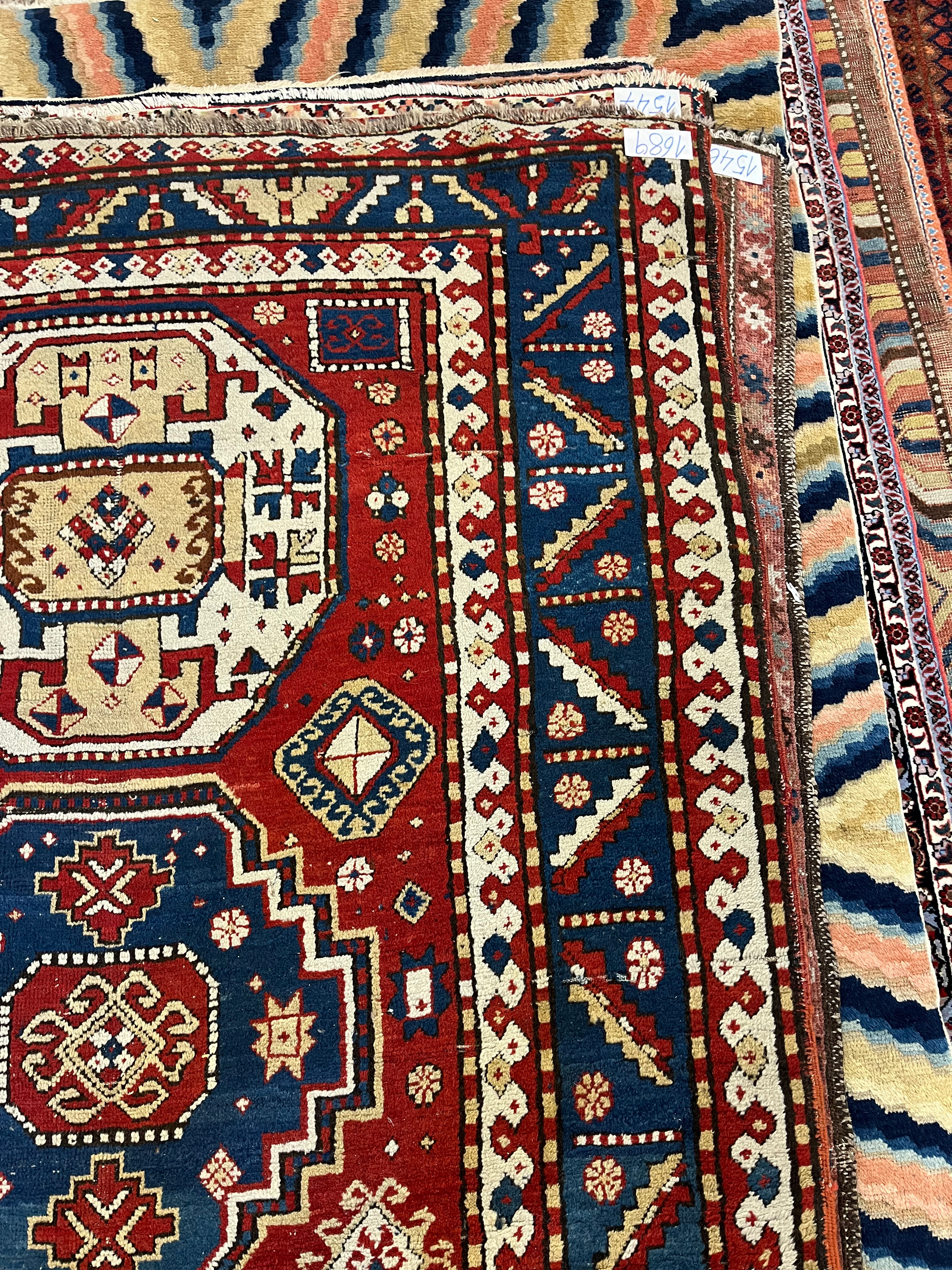 - Katalog-Nr: 1691Zwei kaukasische Brücken und eine Kaschkai-Tasche, 130 x 82 / 68 x 68 / 70 x 53 cm. Zertifikat zu einem Stück der GALERIE OSTLER, München, liegt vor.o.L.