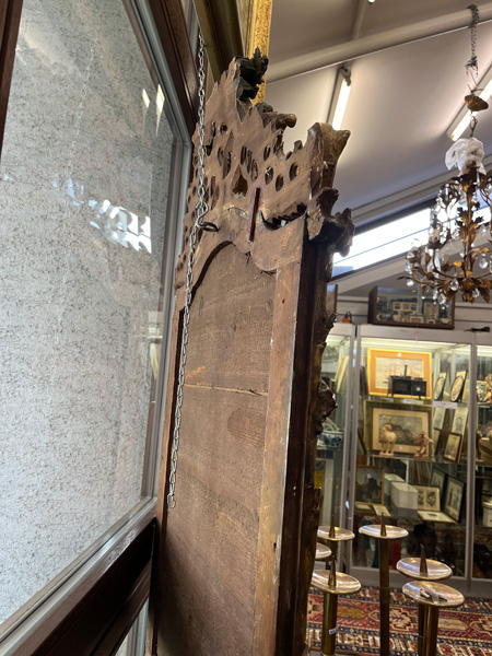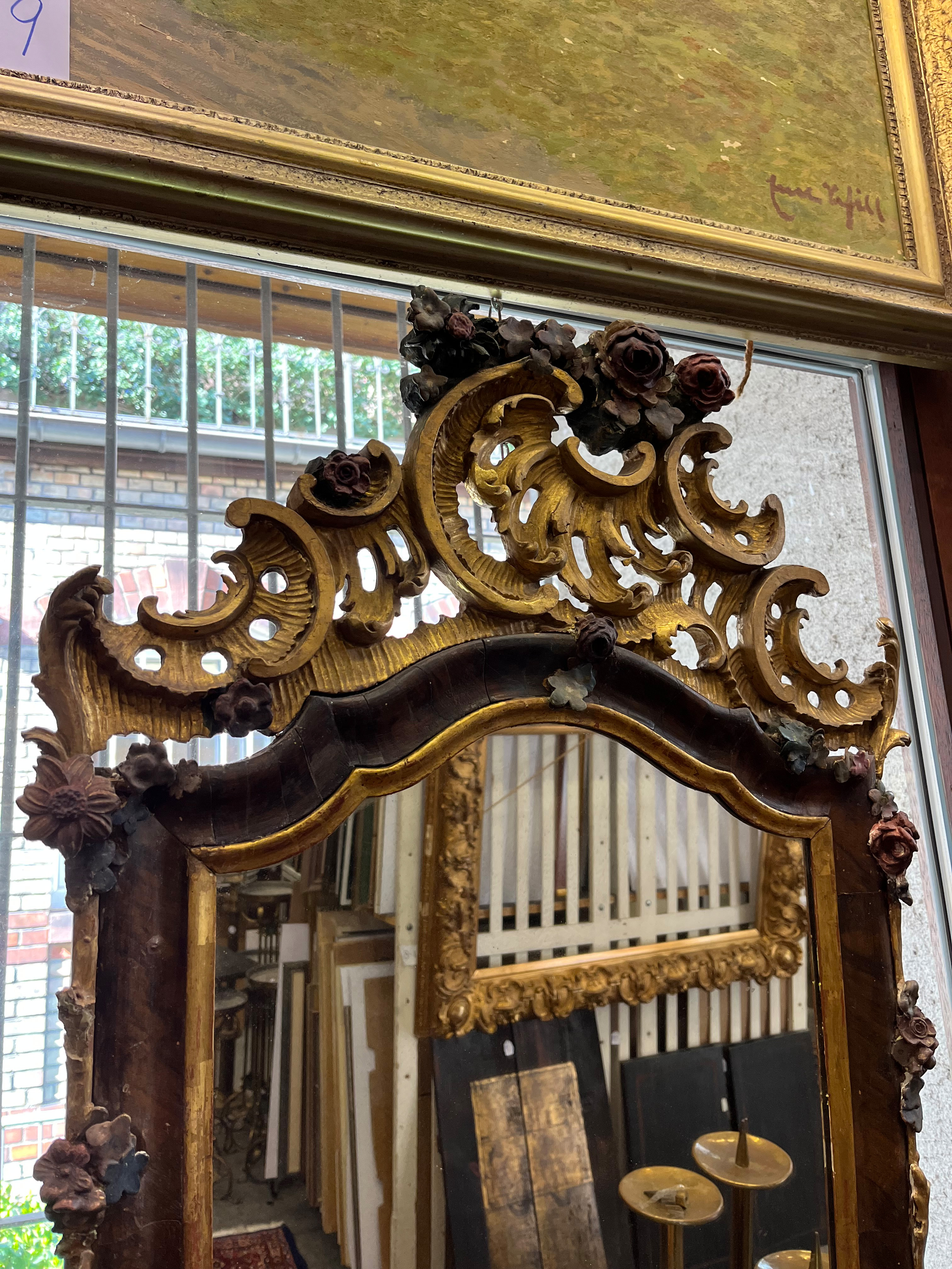 - Katalog-Nr: 1326Trumeau-Spiegel. Frankreich 18. Jh. Massivholz, auf Kreidegrund gold gefasst, dekoriert mit Blättern und Schleifen, im Trumeaufeld bunt bemalt mit figürlicher Szene eines Jünglings mit Spiegel und Dame mit Blumen, 203 x 73 cm. (rest.)o.L.