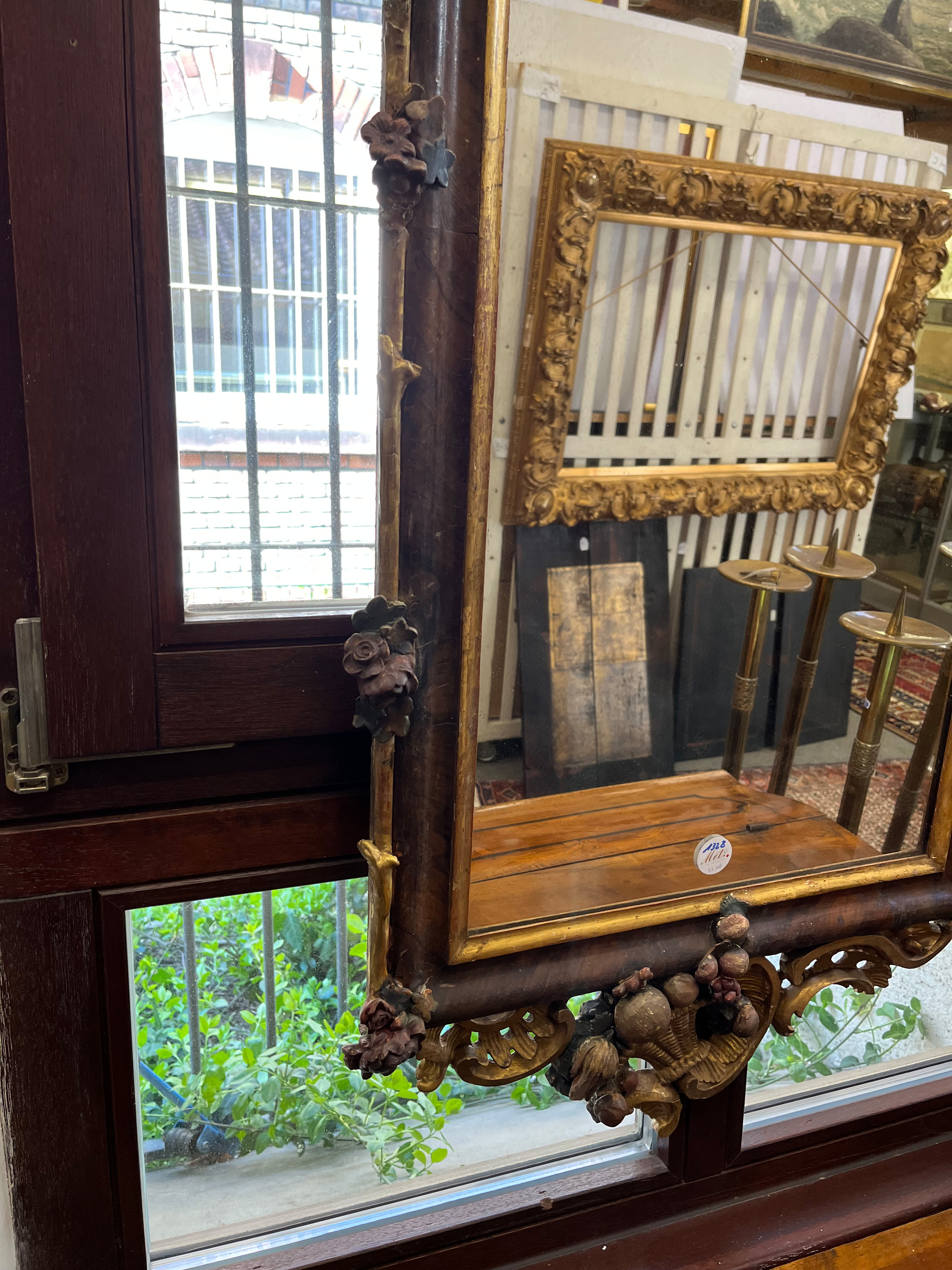 - Katalog-Nr: 1328Barock-Spiegel. Bayreuth um 1750. Massivholz, durchbrochen geschnitzt, auf Kreidegrund farbig und gold gefasst und dekoriert mit Blüten, Rocaillen und Obstkorb, 117 x 61 cm.o.L.