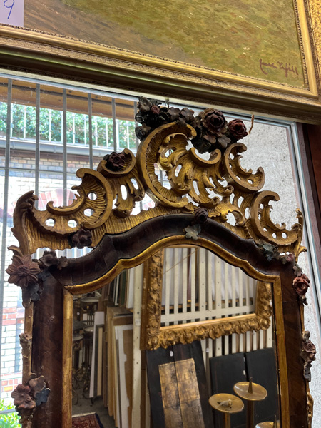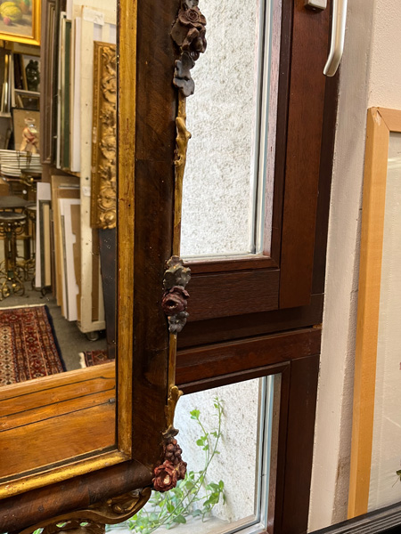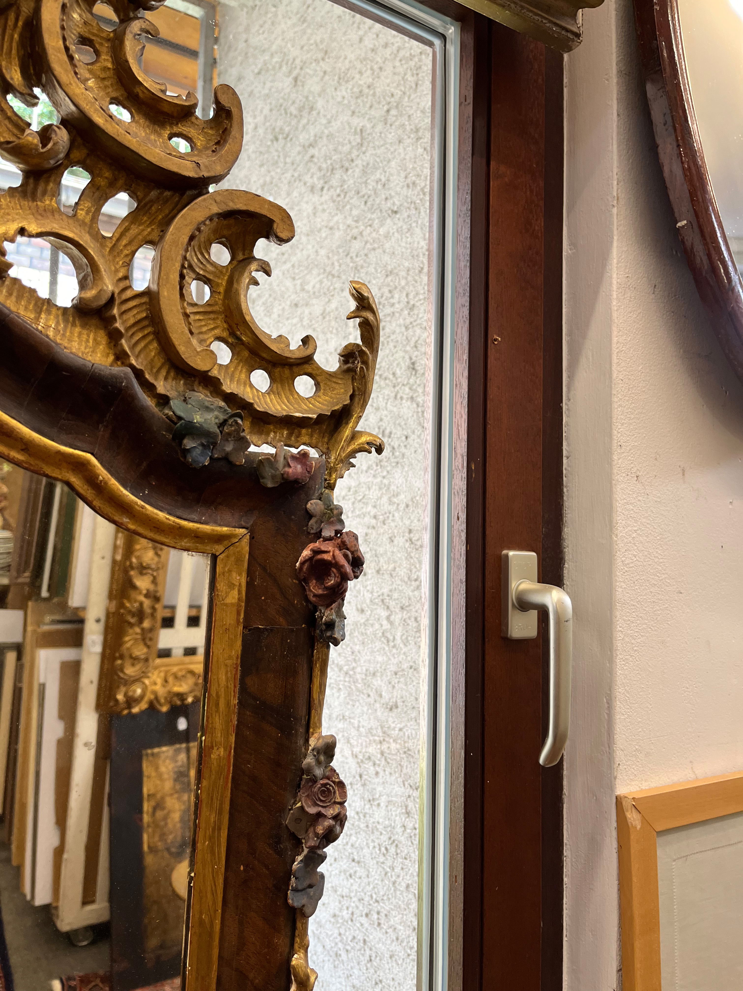 - Katalog-Nr: 1327Barock-Spiegel. Bayreuth um 1750. Massivholz, durchbrochen geschnitzt, auf Kreidegrund farbig und gold gefasst, dekoriert mit Blüten, Rocaillen und Vogel, 62 x 32 cm.o.L.