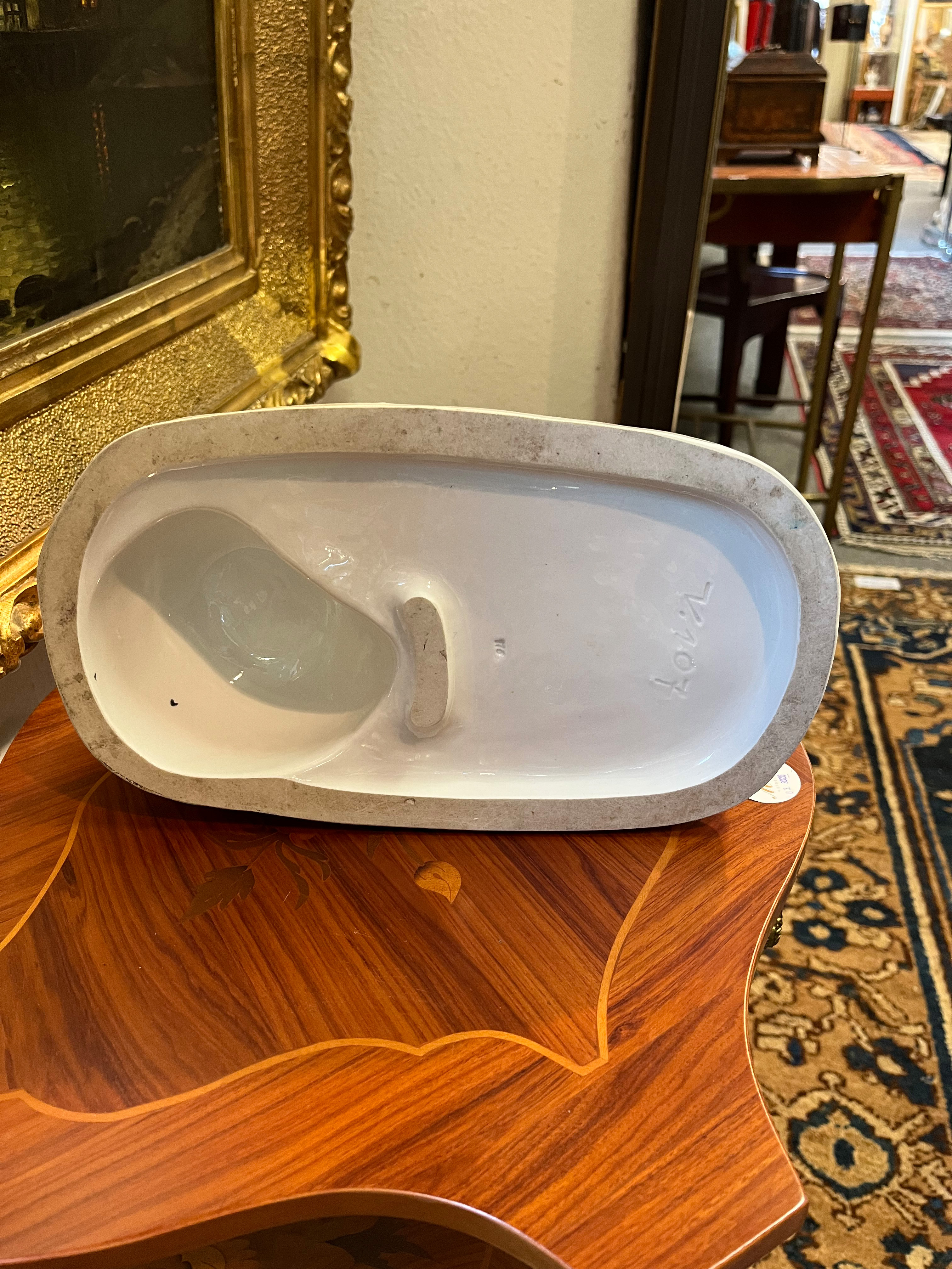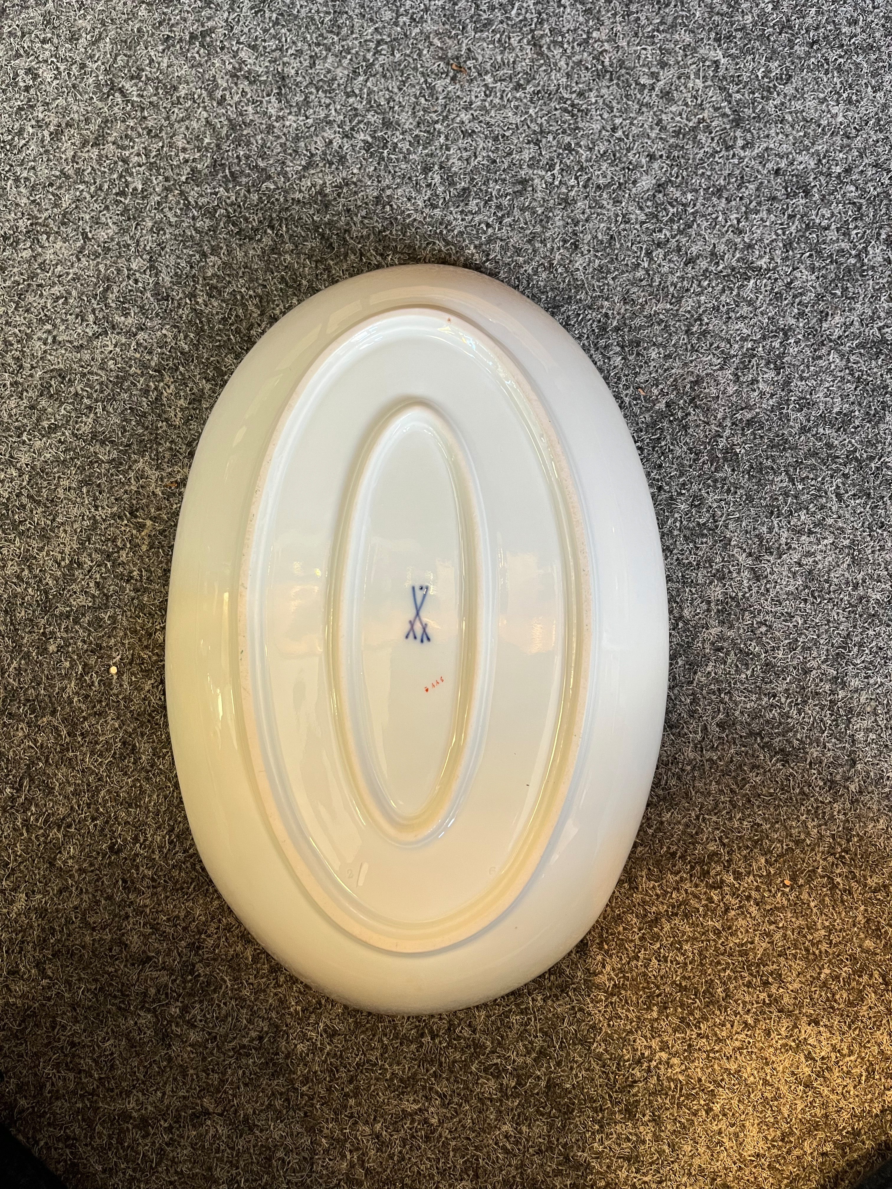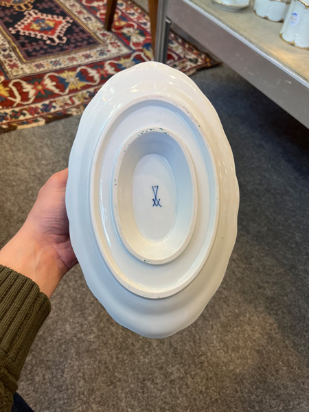 - Katalog-Nr: 1234Ovale Durchbruchsschale. Meissen 19. Jh. Porzellan, bunt bemalt mit Obstbouquet, gold gesäumt; verso unterglasurblaue Schwertermarke, H=6,5 cm, B=32 cm, T=24,5 cm.o.L.