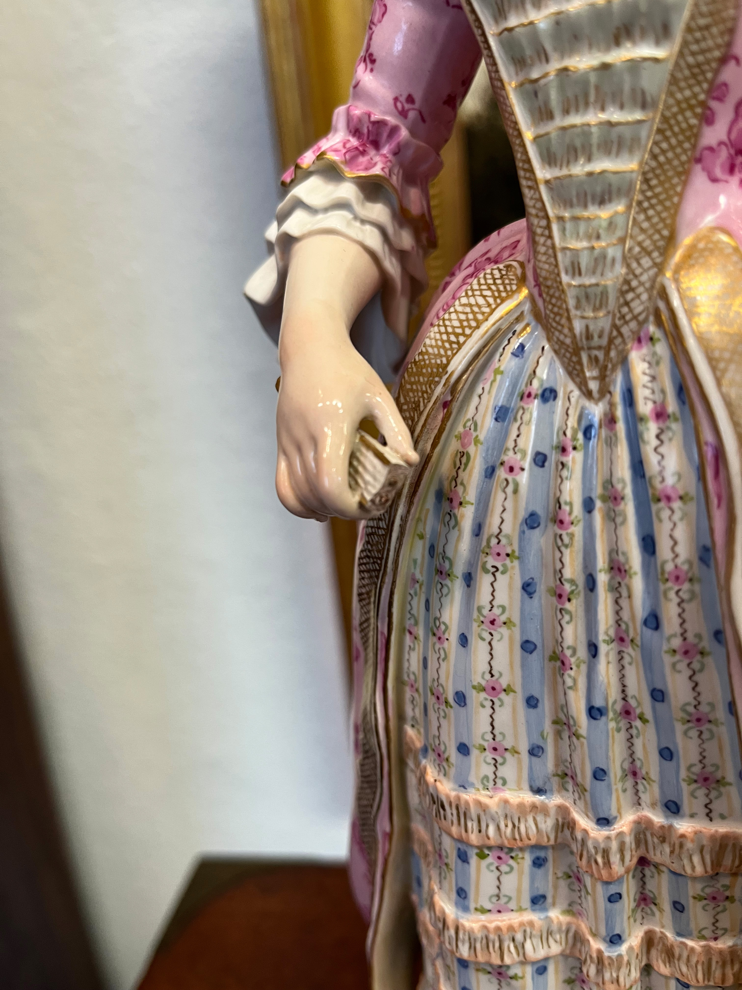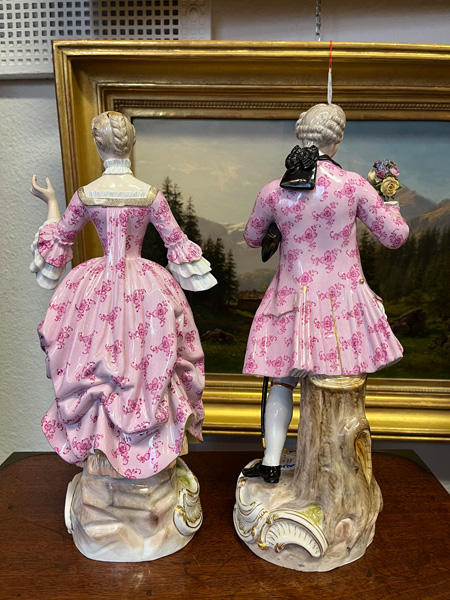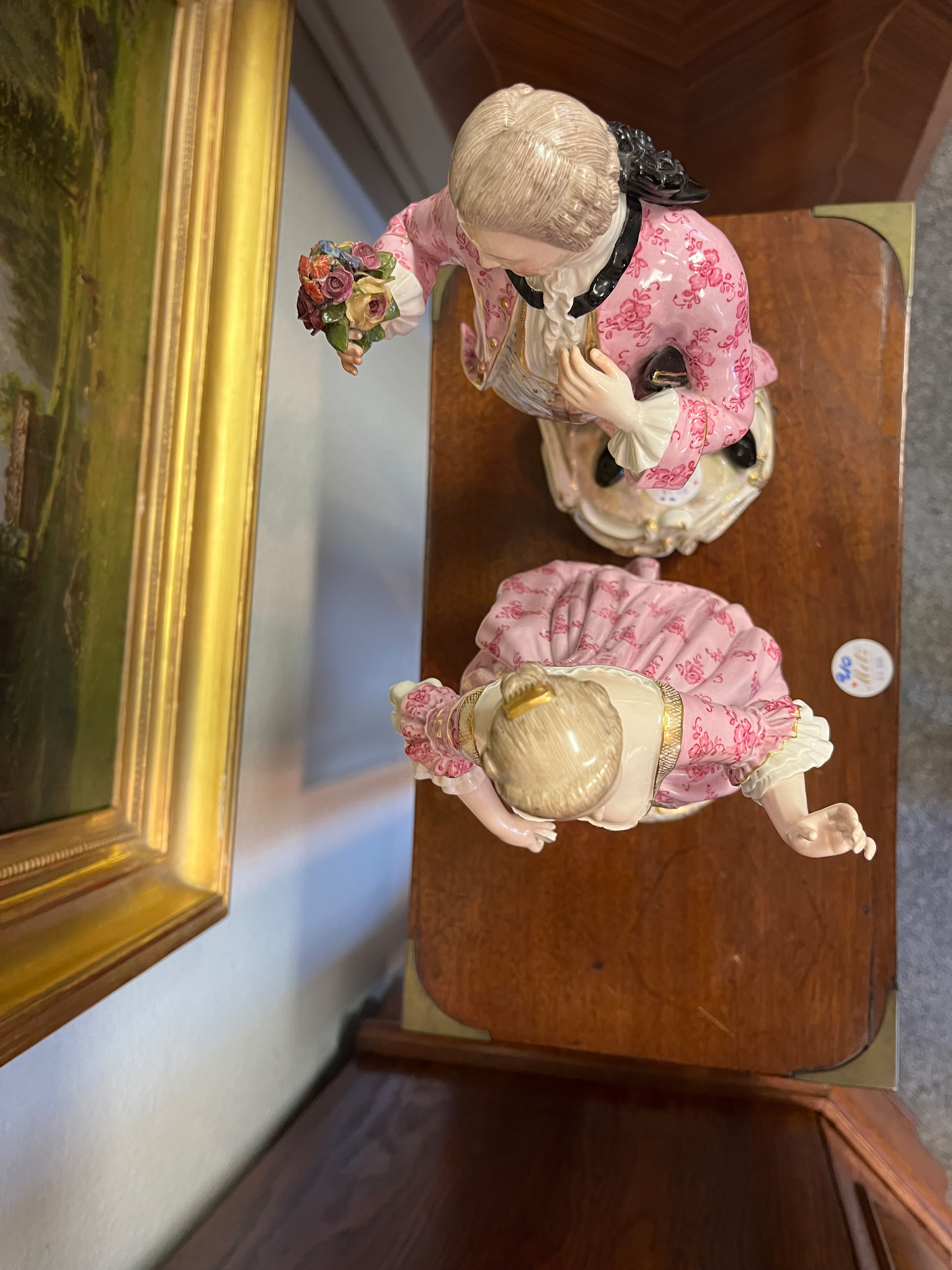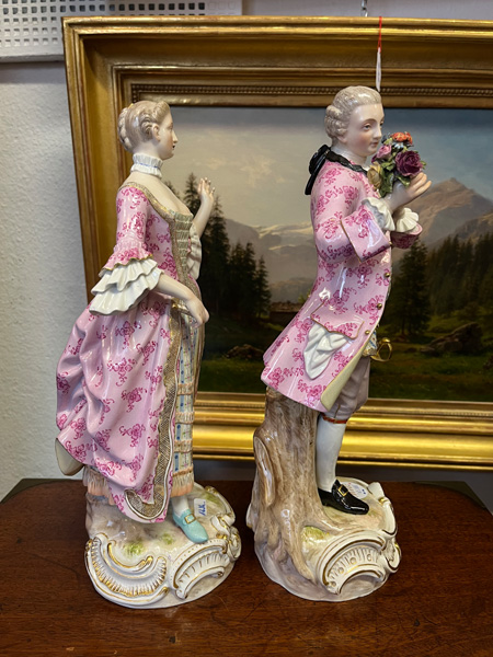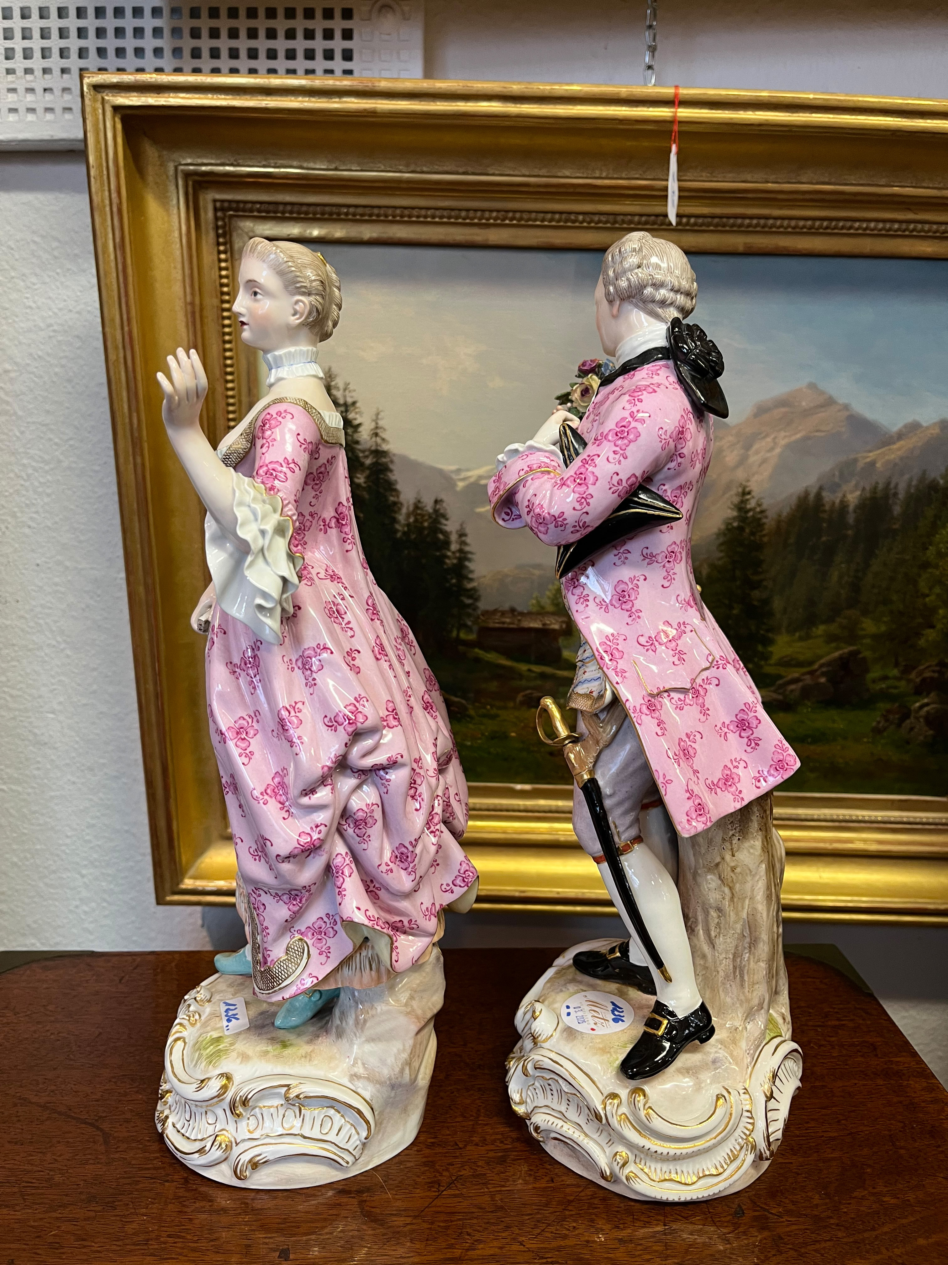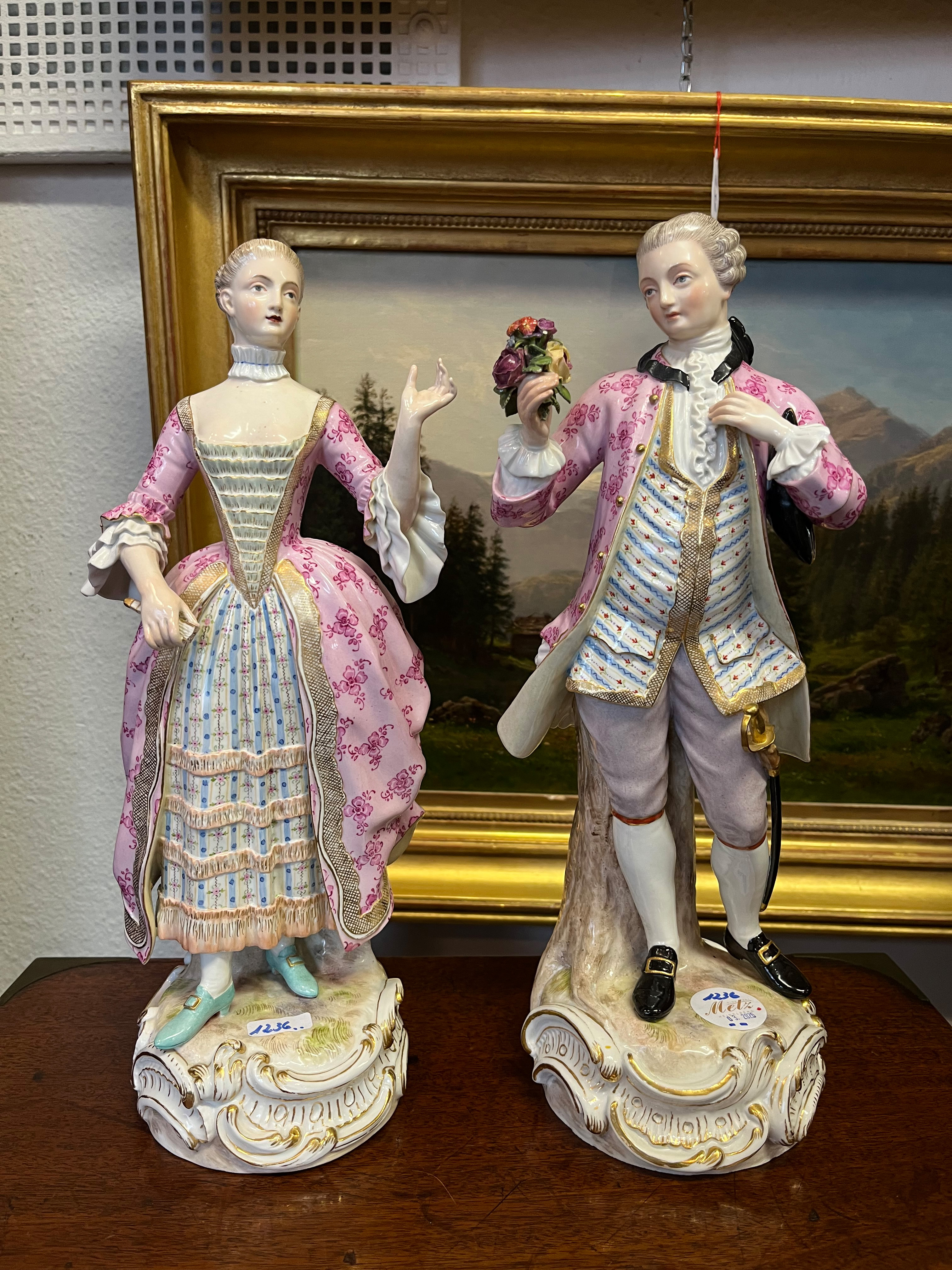 - Katalog-Nr: 1236Rokokopaar. Meissen 19. Jh. Je stehend auf rundem Rocaillesockel, gold gesäumt. Porzellan, bunt bemalt, teilweise mit Goldspitzenbordüre; am Boden unterglasurblaue Schwertermarke mit einem Schleifstrich, Modelle von J.C. Schönheit, H=je 36 cm. (best. / rest.)o.L.
